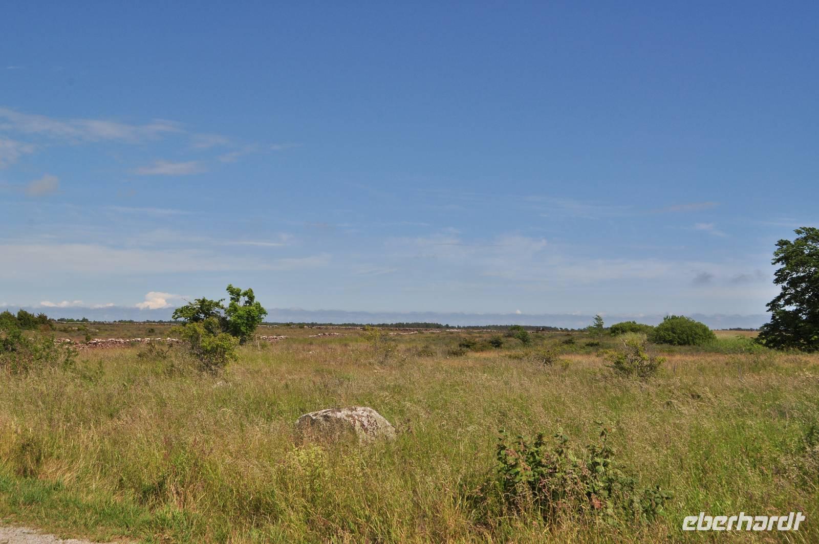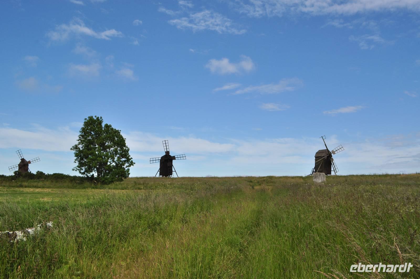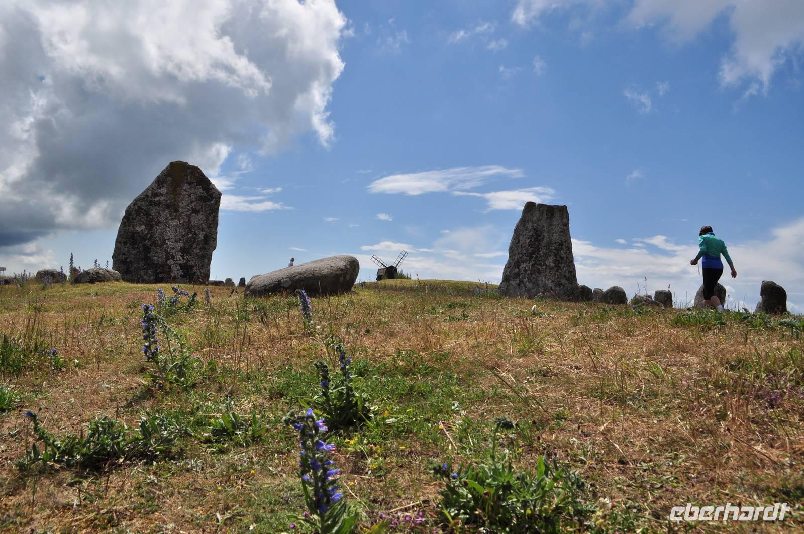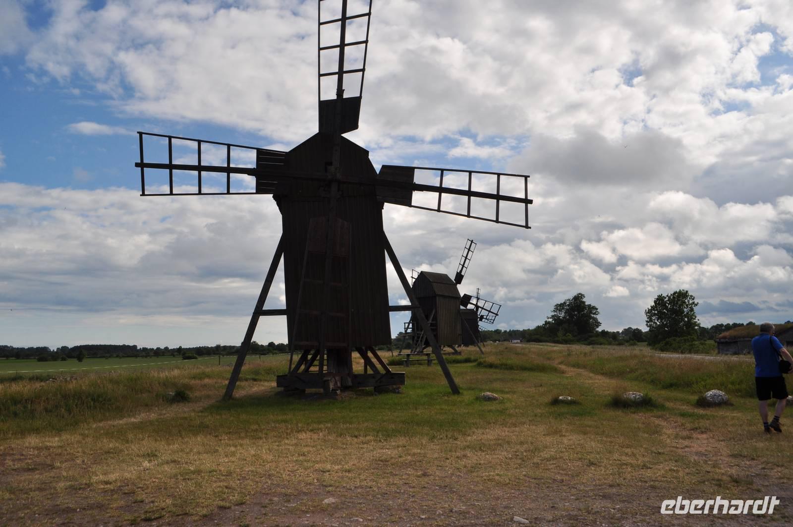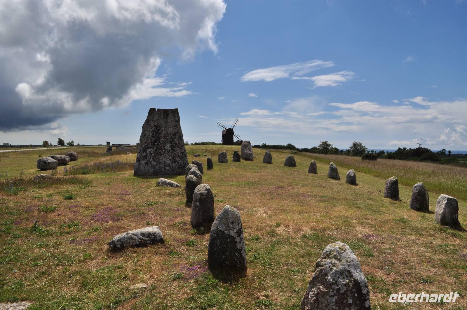 Das Wetter sieht stabil aus, wir entscheiden ohne Umschweife sofort los zu radeln. Wir fahren über die Ölandsbrücke bis nach Färjestaden. Dort wechseln wir auf die Räder. Vorbei an Runenstein geht es durch die Agrarlandschaft Ölands immer wieder vorbei an Höfen, Äckern, Weiden und natürlich Windmühlen. Die Agrarregion Öland wurde sogar zum UNESCO Weltkulturerbe erklärt. Am Steinkreis von Gettlinge machen wir Mittagspause, Ingo ist mit dem Bus da und hat bereits die Mittagsverpflegung vorbereitet. Aufgrund des guten Wetters und dem geringen Wind, entscheiden wir uns über das Alvaret auf die andere Inselseite zu fahren. Normalerweise ein schwieriges Unterfangen, da man schutzlos dem Wind ausgeliefert ist und wie in unserem Fall auch noch gegen die Windrichtung. Jetzt scheint die Sonne, Wind ist heute nicht vorhanden. Ingo fährt voraus und nimmt uns auf der anderen Seite auf. Wir radeln an weiteren Gräberfeldern vorbei und an Mittsommerstangen und vielen Windmühlen. Fotostopp machen wir auch nochmal an der berühmten Mühlenreihe von Lerkaka, das berühmteste Motiv Ölands.
