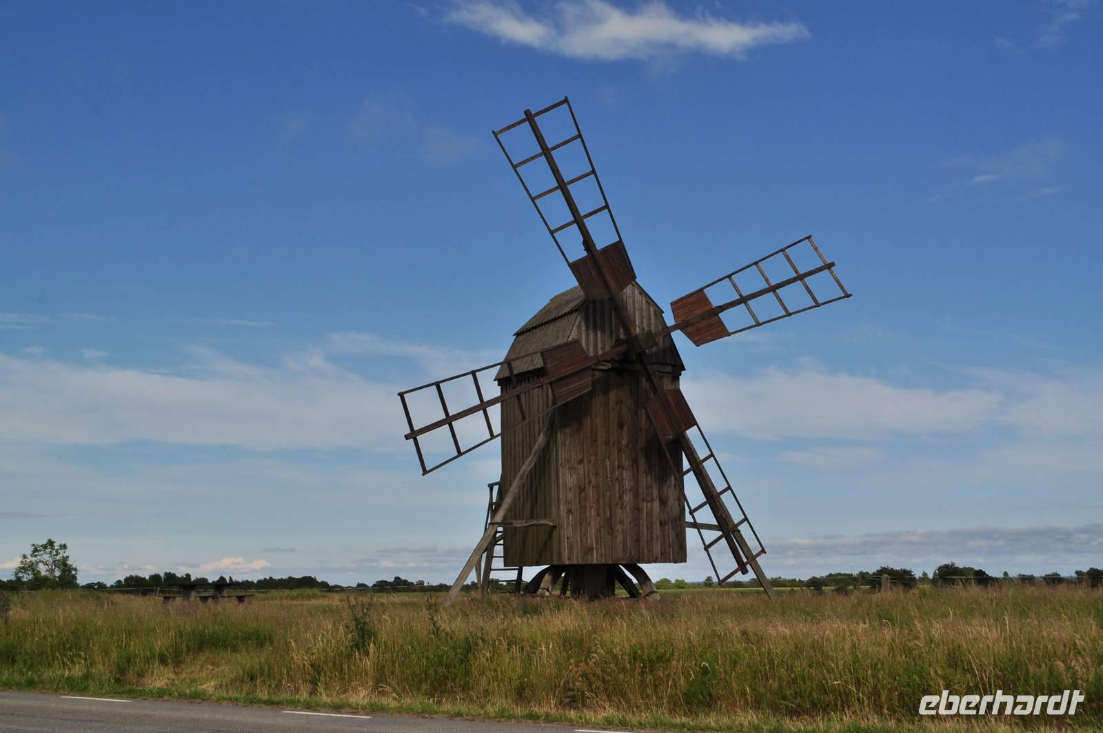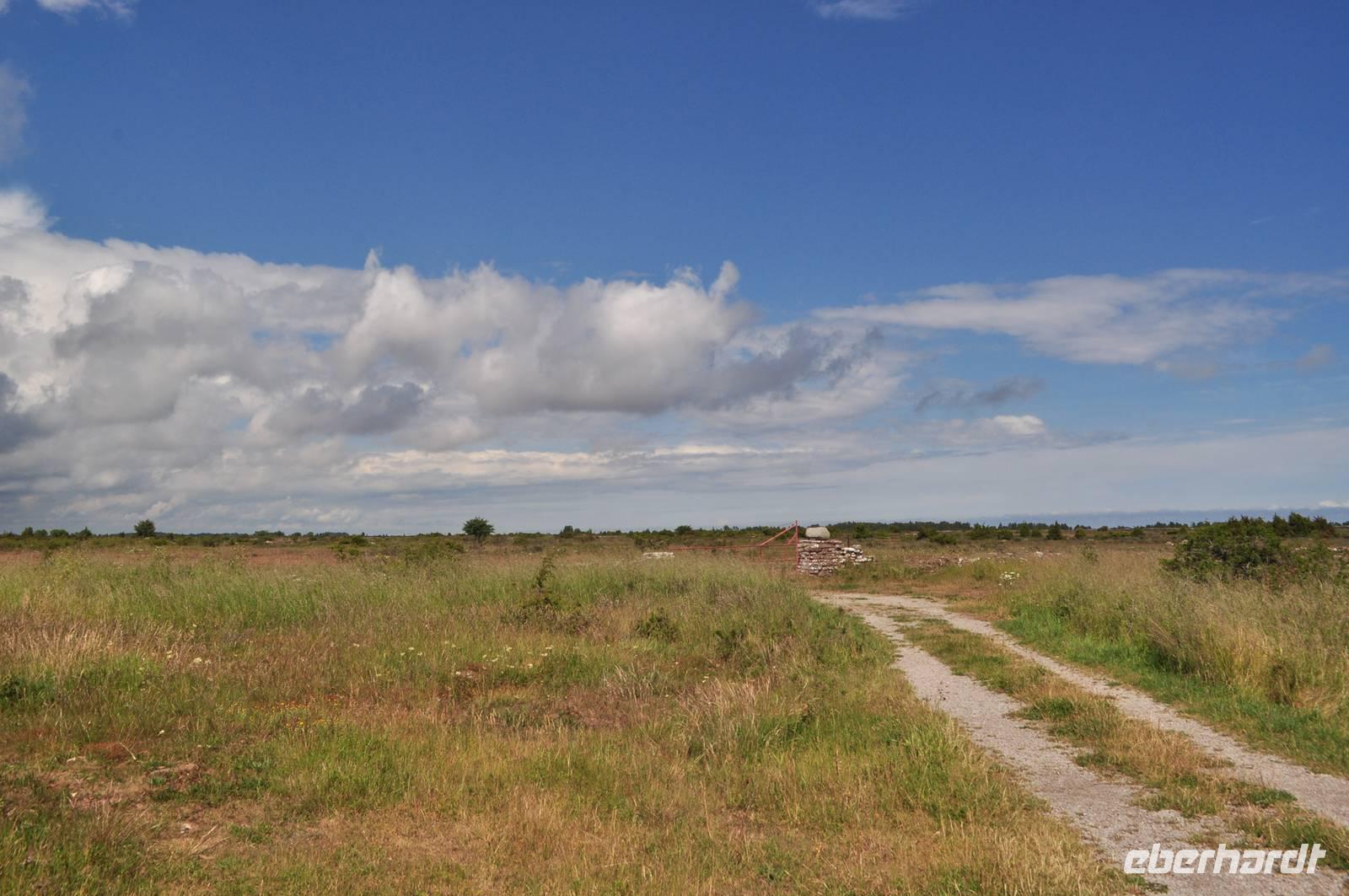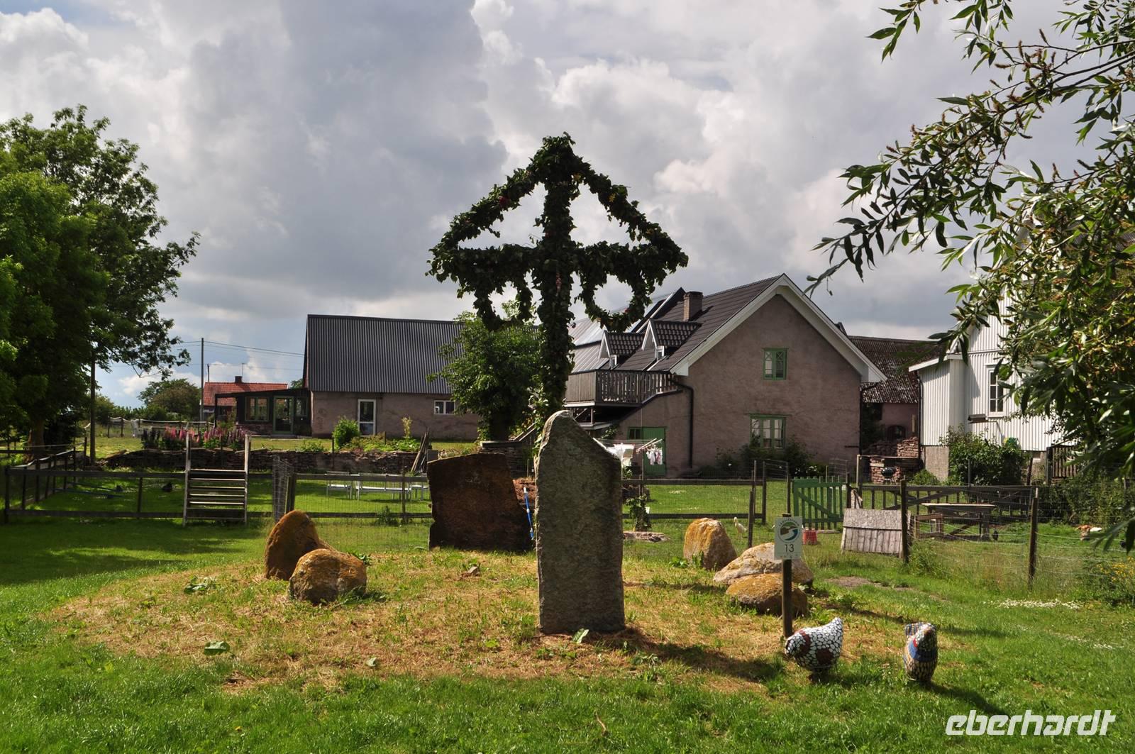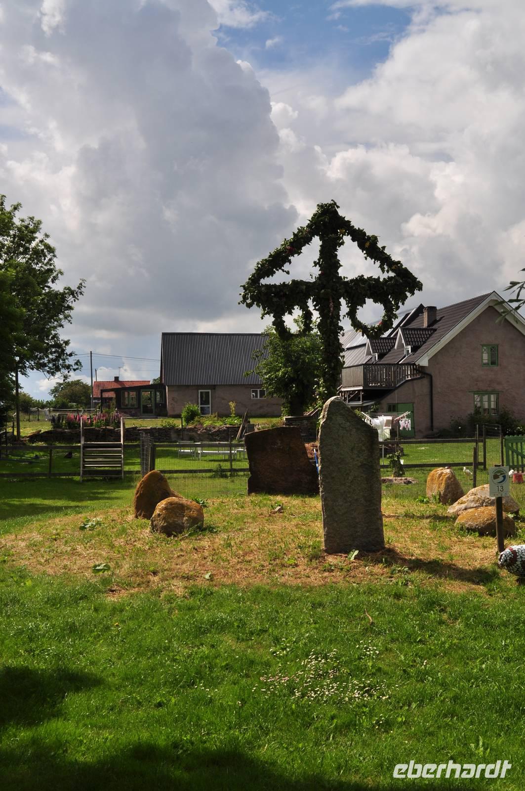 Das Wetter sieht stabil aus, wir entscheiden ohne Umschweife sofort los zu radeln. Wir fahren über die Ölandsbrücke bis nach Färjestaden. Dort wechseln wir auf die Räder. Vorbei an Runenstein geht es durch die Agrarlandschaft Ölands immer wieder vorbei an Höfen, Äckern, Weiden und natürlich Windmühlen. Die Agrarregion Öland wurde sogar zum UNESCO Weltkulturerbe erklärt. Am Steinkreis von Gettlinge machen wir Mittagspause, Ingo ist mit dem Bus da und hat bereits die Mittagsverpflegung vorbereitet. Aufgrund des guten Wetters und dem geringen Wind, entscheiden wir uns über das Alvaret auf die andere Inselseite zu fahren. Normalerweise ein schwieriges Unterfangen, da man schutzlos dem Wind ausgeliefert ist und wie in unserem Fall auch noch gegen die Windrichtung. Jetzt scheint die Sonne, Wind ist heute nicht vorhanden. Ingo fährt voraus und nimmt uns auf der anderen Seite auf. Wir radeln an weiteren Gräberfeldern vorbei und an Mittsommerstangen und vielen Windmühlen. Fotostopp machen wir auch nochmal an der berühmten Mühlenreihe von Lerkaka, das berühmteste Motiv Ölands.