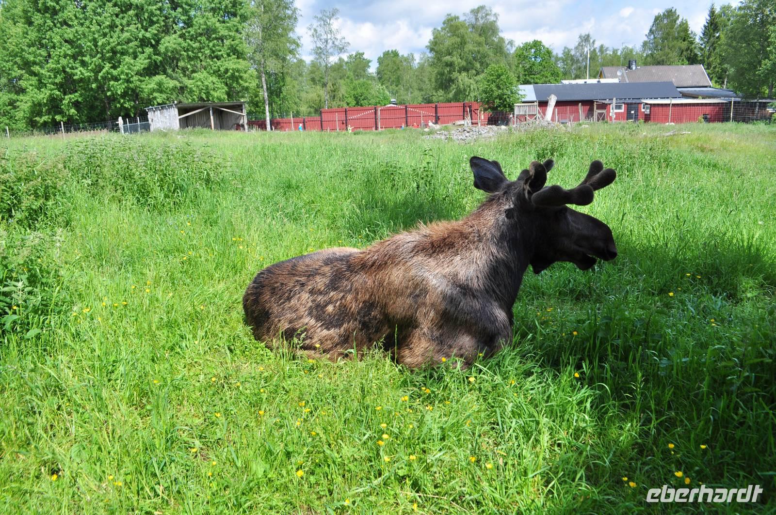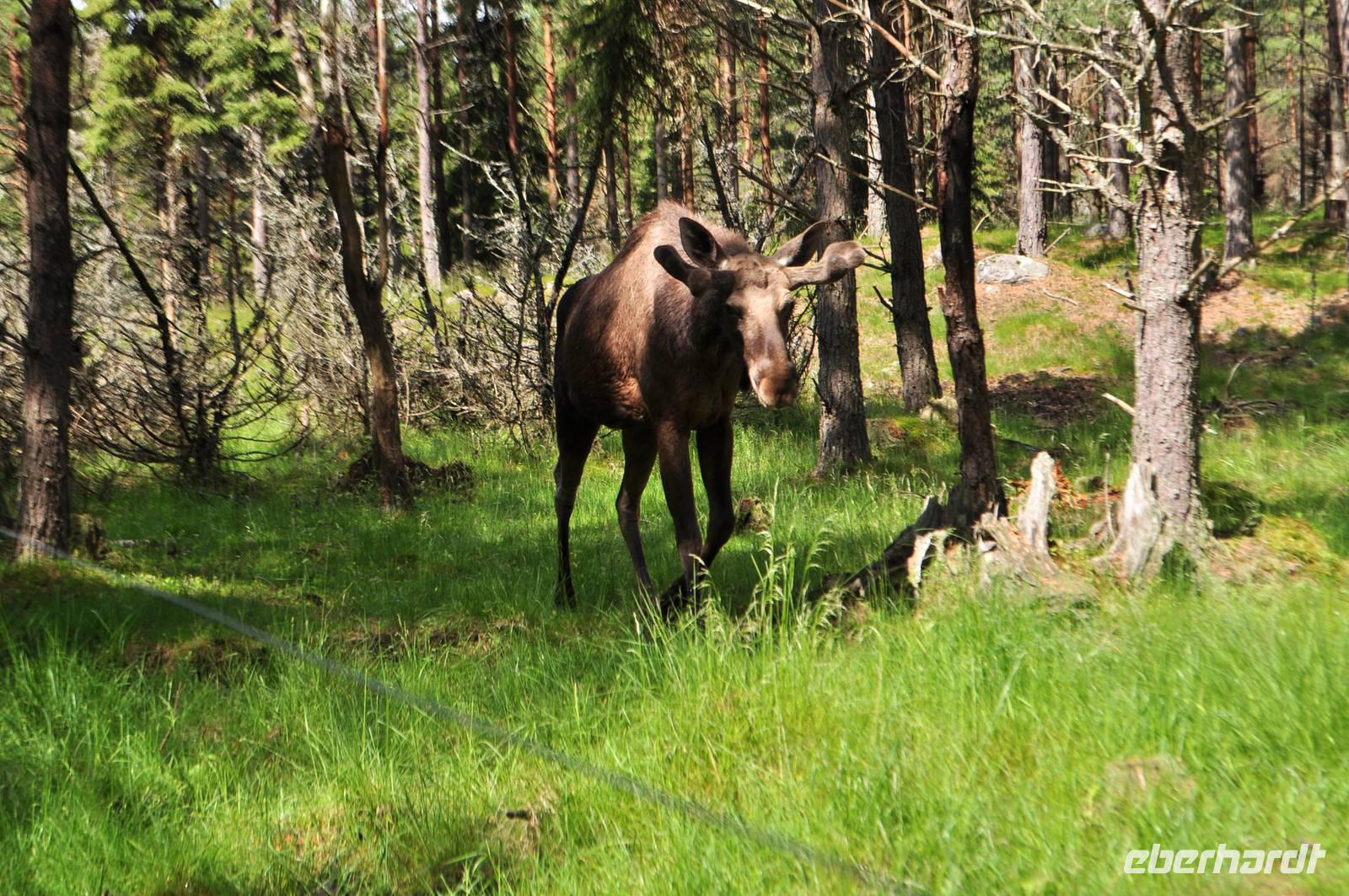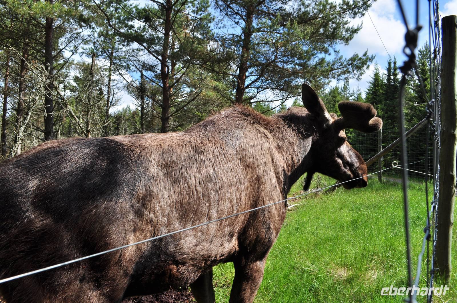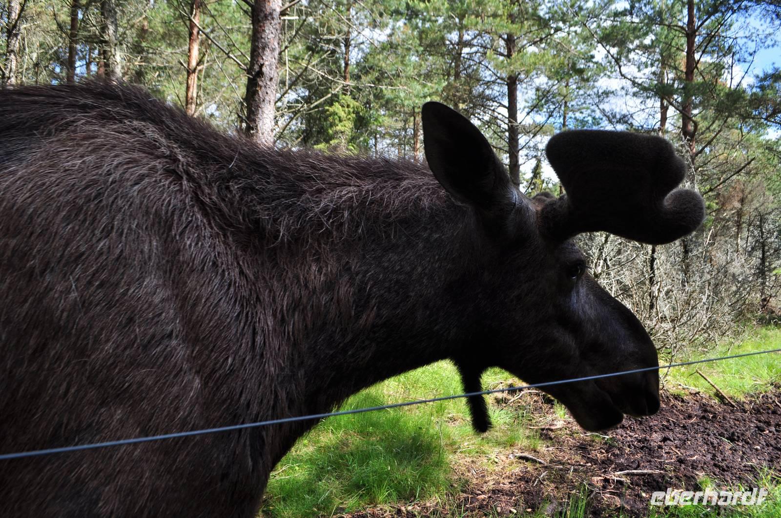Heute geht es in den südlichen Teil des Smålandes. Im Grönåsens Älgpark (Elchpark) bei Kosta lernen wir die großen Tiere endlich aus der Nähe kennen. Einer der Elche heißt Arne. Etwas merkwürdig, dass wir kurze Zeit später einen Verwandten von ihm als Elch-Bratwurst auf dem Grill haben.