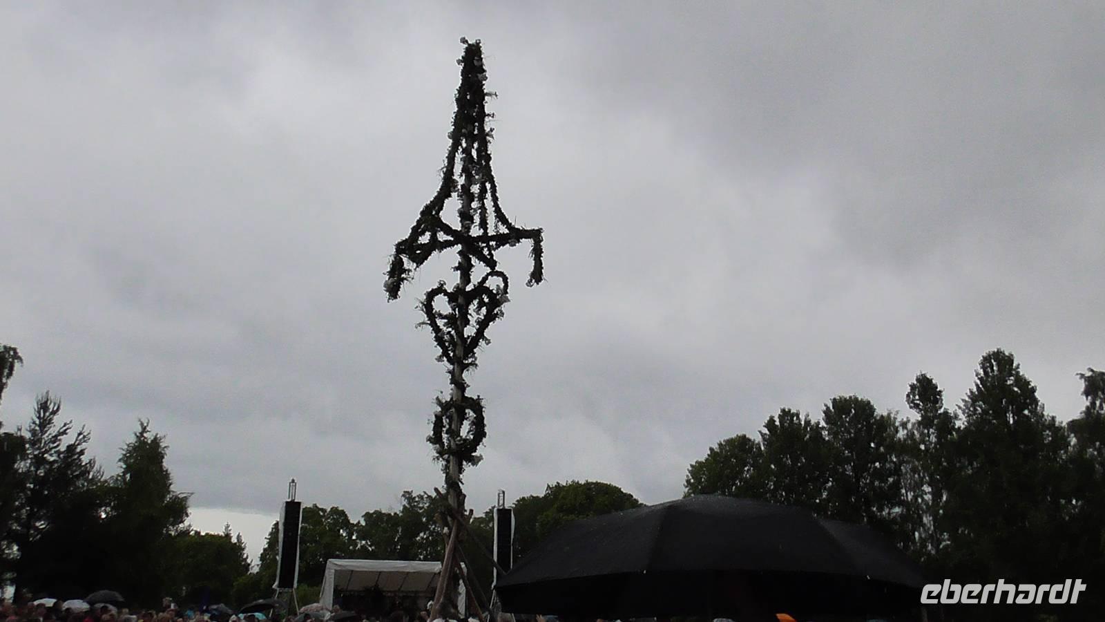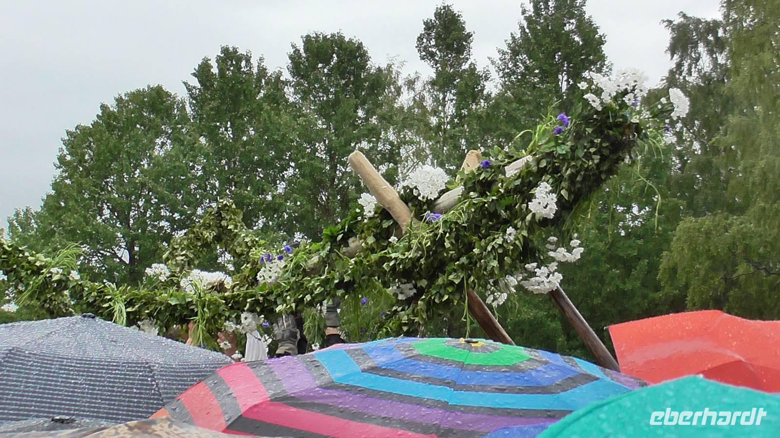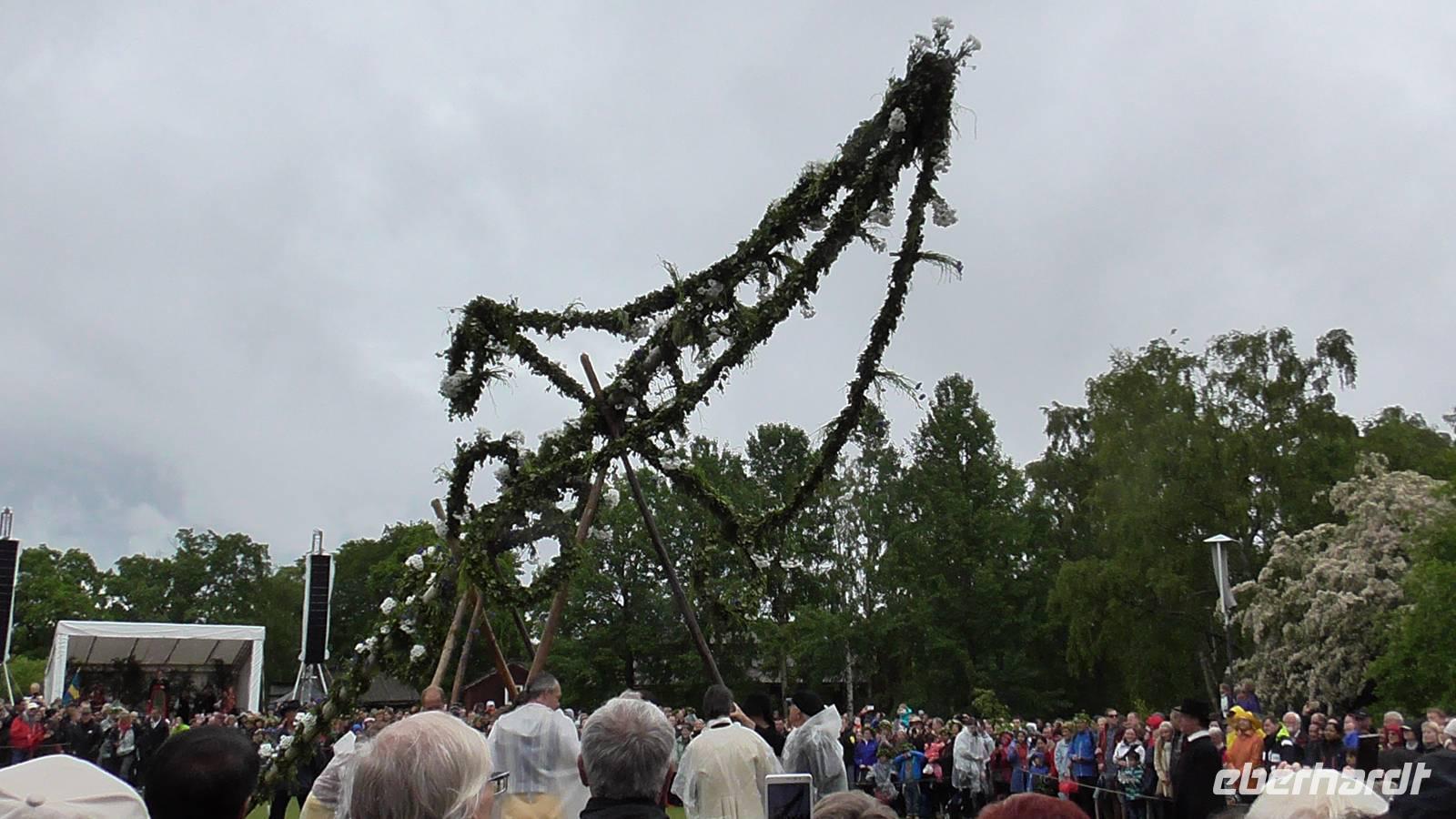Die Zeremonie beginnt. Man sieht recht wenig, trotz des Regens sind doch recht viele Menschen am Festplatz versammelt. Heute ergänzte durch Regenschirme, die die Sicht behindern. Die Moderatorin bemerkt, dass sie in all den Jahren zu Mittsommer noch nie mehr Regenschirme als Besucher gesehen hat. Sie fordert auf die Wolken gemeinsam wegzupusten. Wie durch ein Wunder hört es plötzlich auf zu regnen. Die Mittsommerstange kann gesetzt werden. Die wichtigsten Lieder und Tänze werden gesungen, bevor es wieder anfängt kräftig zu regnen.