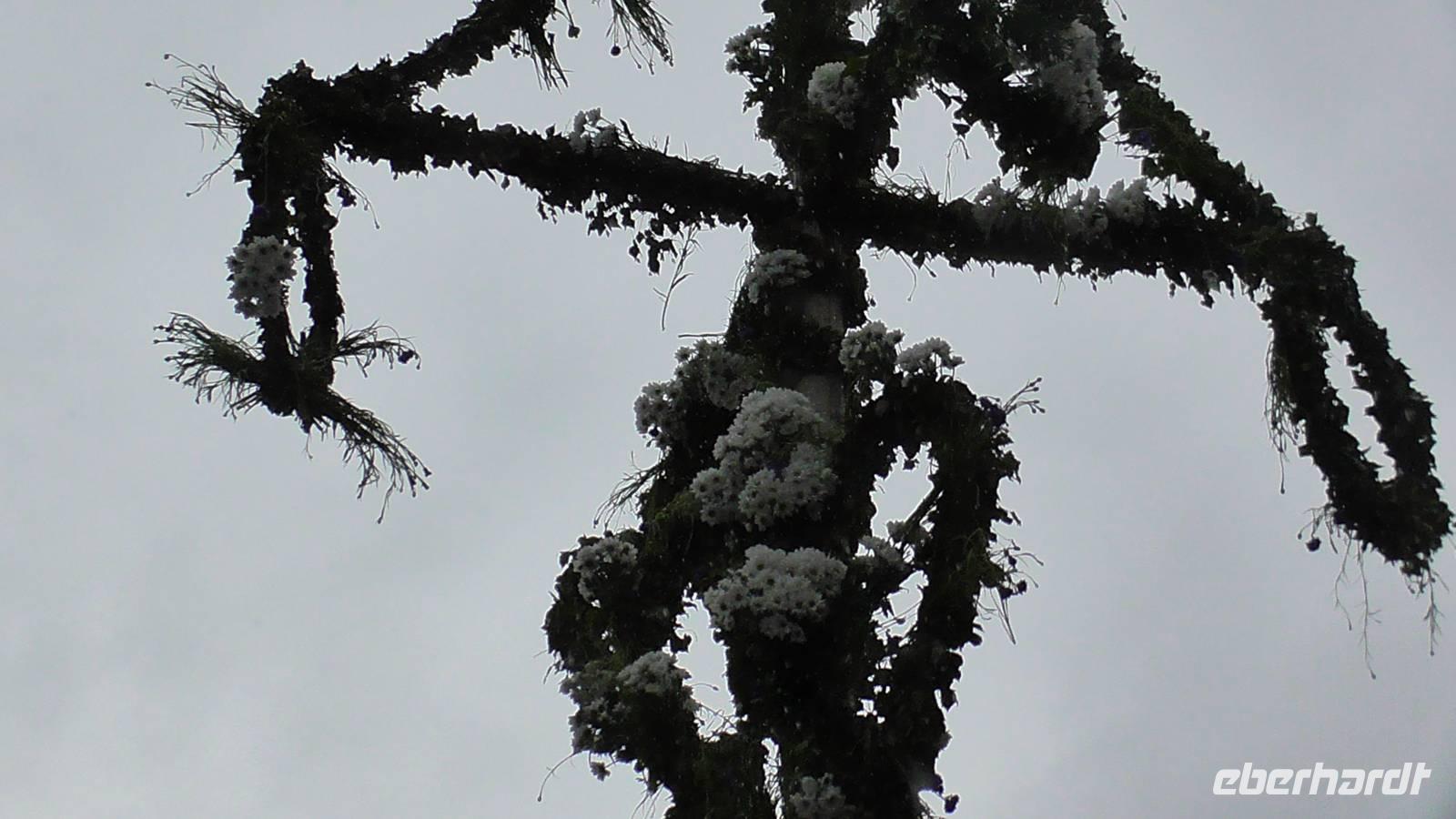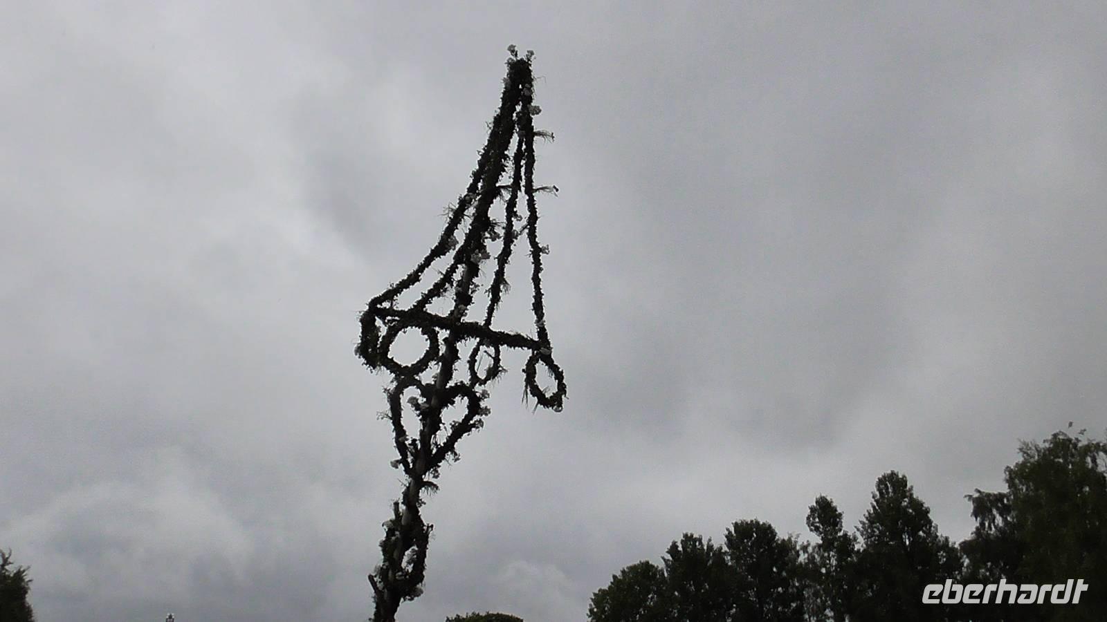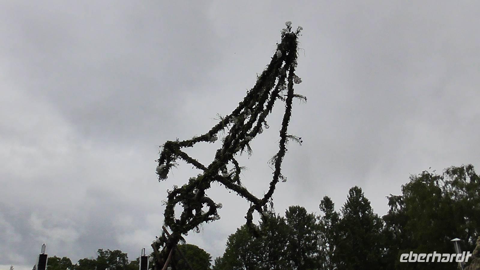 Die Zeremonie beginnt. Man sieht recht wenig, trotz des Regens sind doch recht viele Menschen am Festplatz versammelt. Heute ergänzte durch Regenschirme, die die Sicht behindern. Die Moderatorin bemerkt, dass sie in all den Jahren zu Mittsommer noch nie mehr Regenschirme als Besucher gesehen hat. Sie fordert auf die Wolken gemeinsam wegzupusten. Wie durch ein Wunder hört es plötzlich auf zu regnen. Die Mittsommerstange kann gesetzt werden. Die wichtigsten Lieder und Tänze werden gesungen, bevor es wieder anfängt kräftig zu regnen.