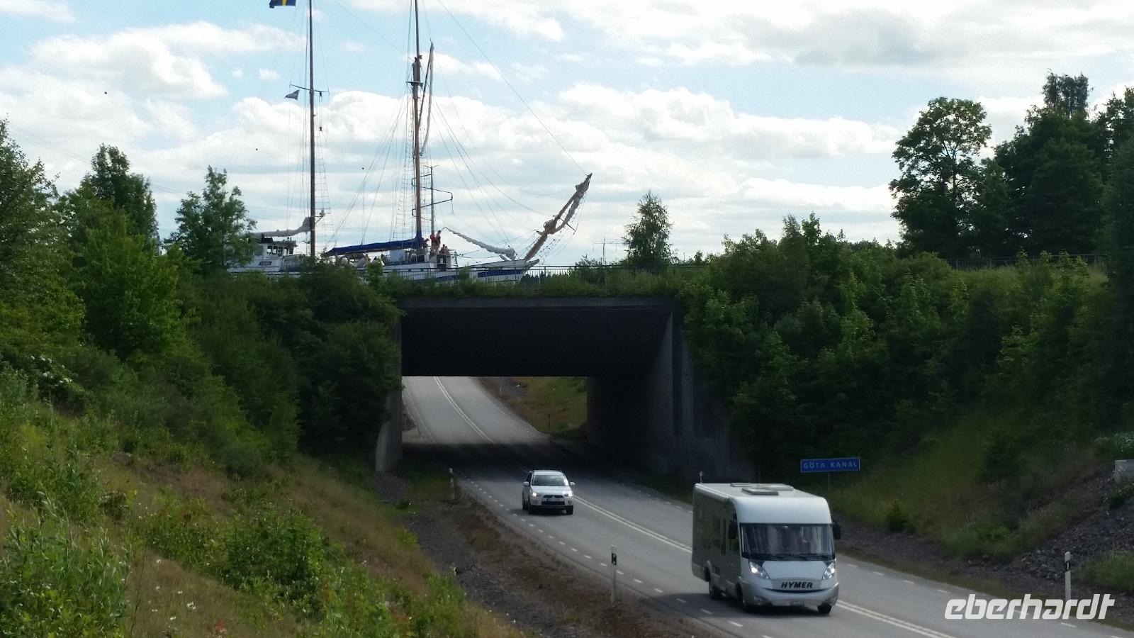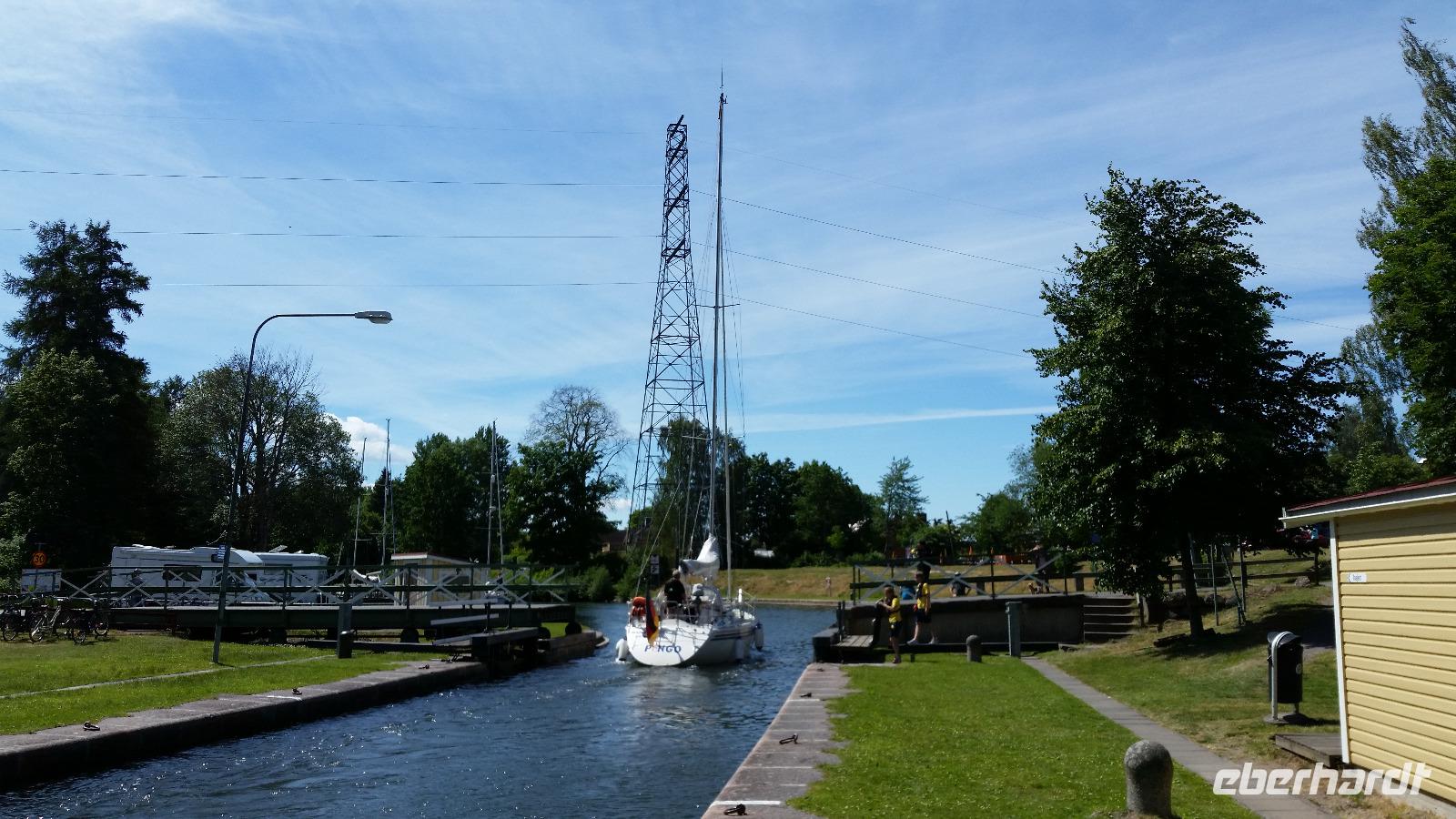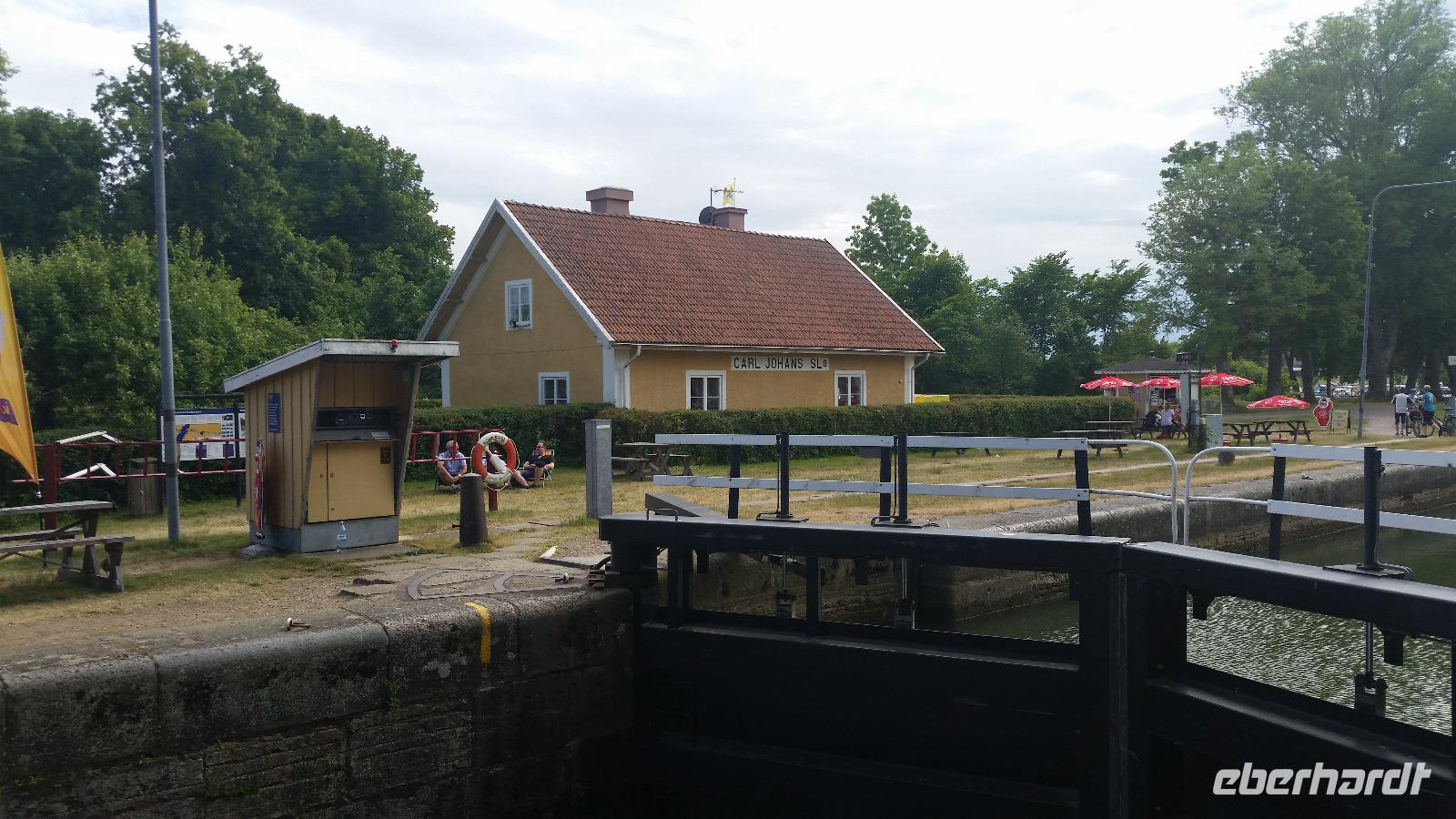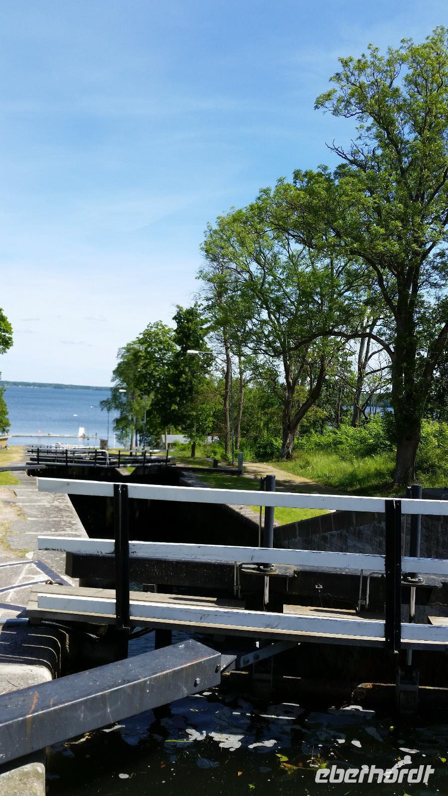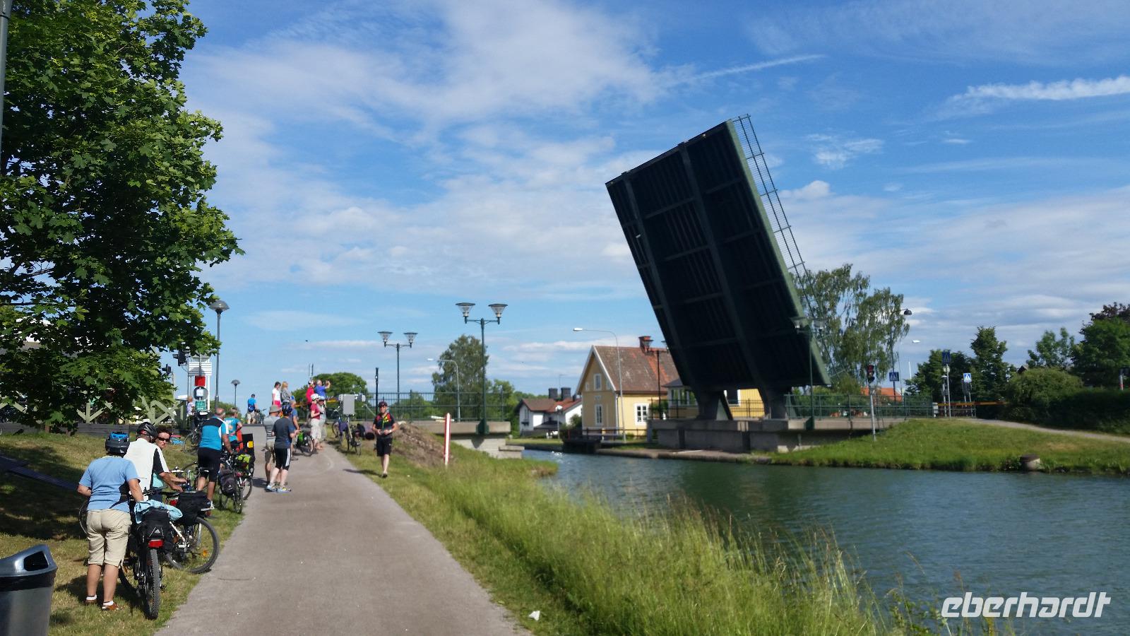 Der Weg führt vorbei an Schleusen, Schiebebrücken und sogar zwei Aquädukten (Wasserweg über Straße). Unser Zwischenziel ist die 7-Kammern-Schleusentreppe „Carl Johan Slussen" von Berg.