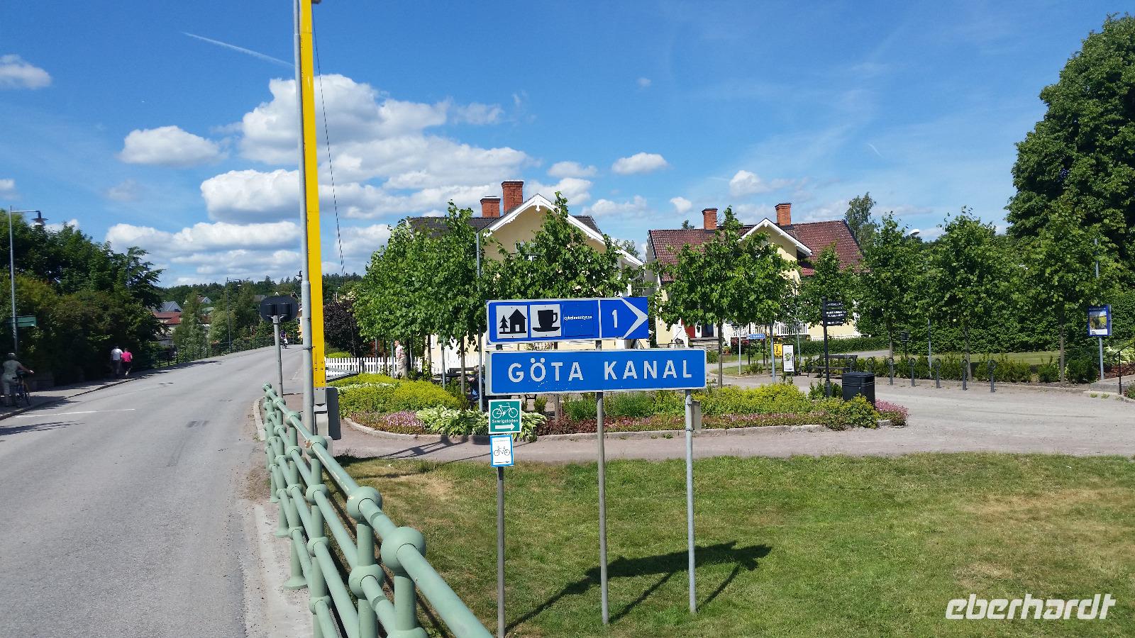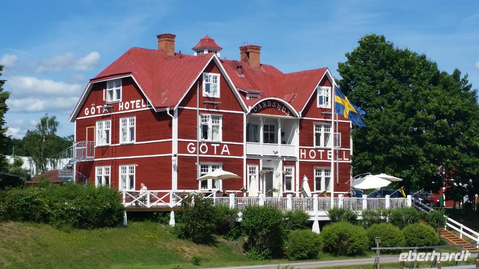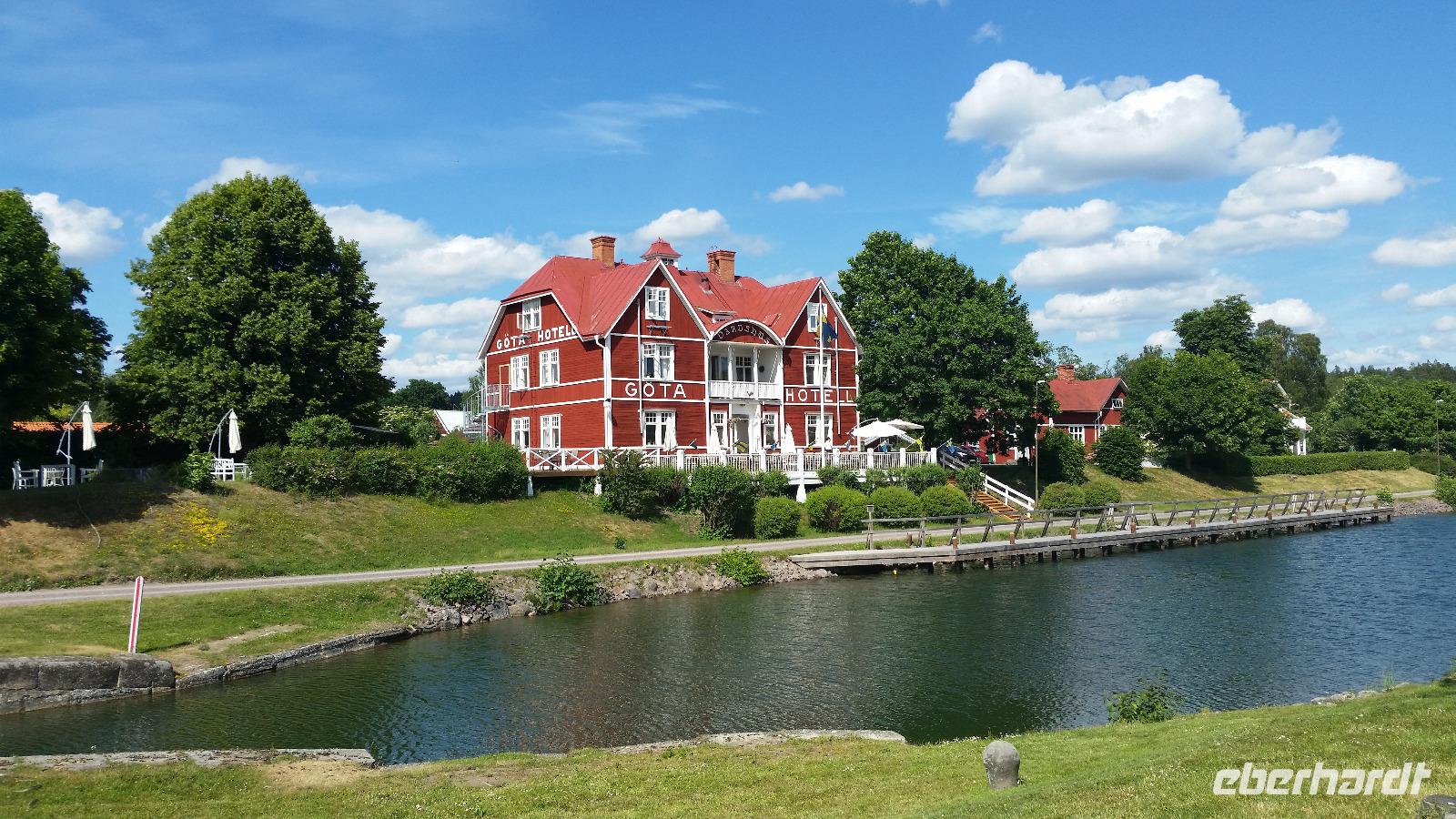 Bei herrlichem Sonnenschein unterbrechen wir unsere Etappe für eine Eis- und Kaffeepause, direkt gegenüber des bekannten Göta Hotells. Nach der willkommenen Erfrischung folgen wir dem wunderschönen ca. 23 km langen Radweg direkt am Ufer des Göta Kanals, jetzt im klassischen Sinne.