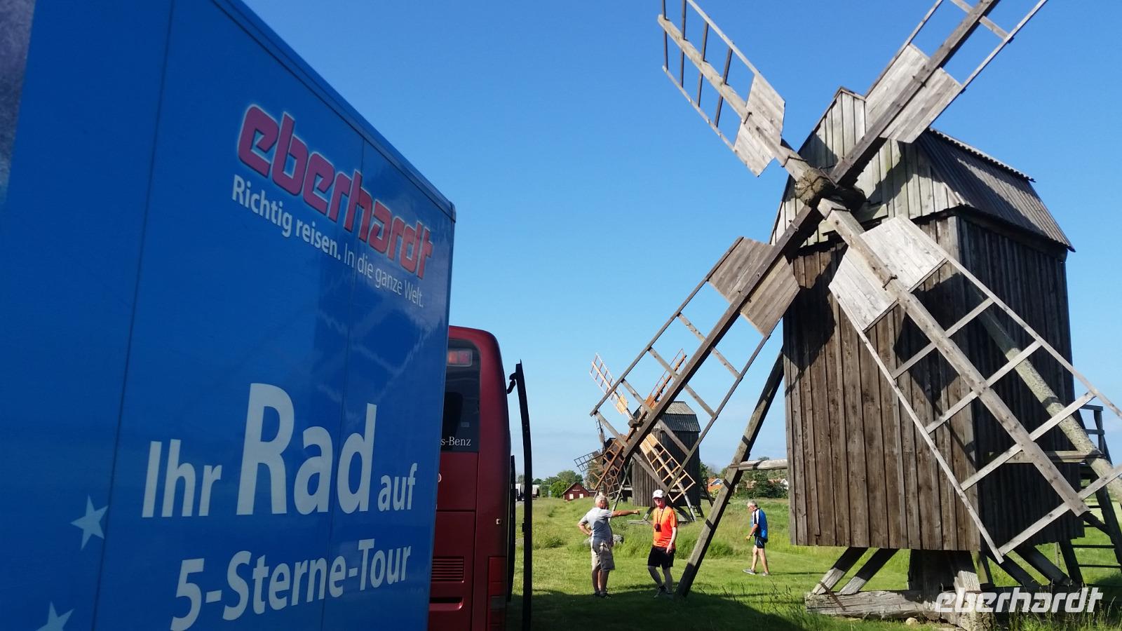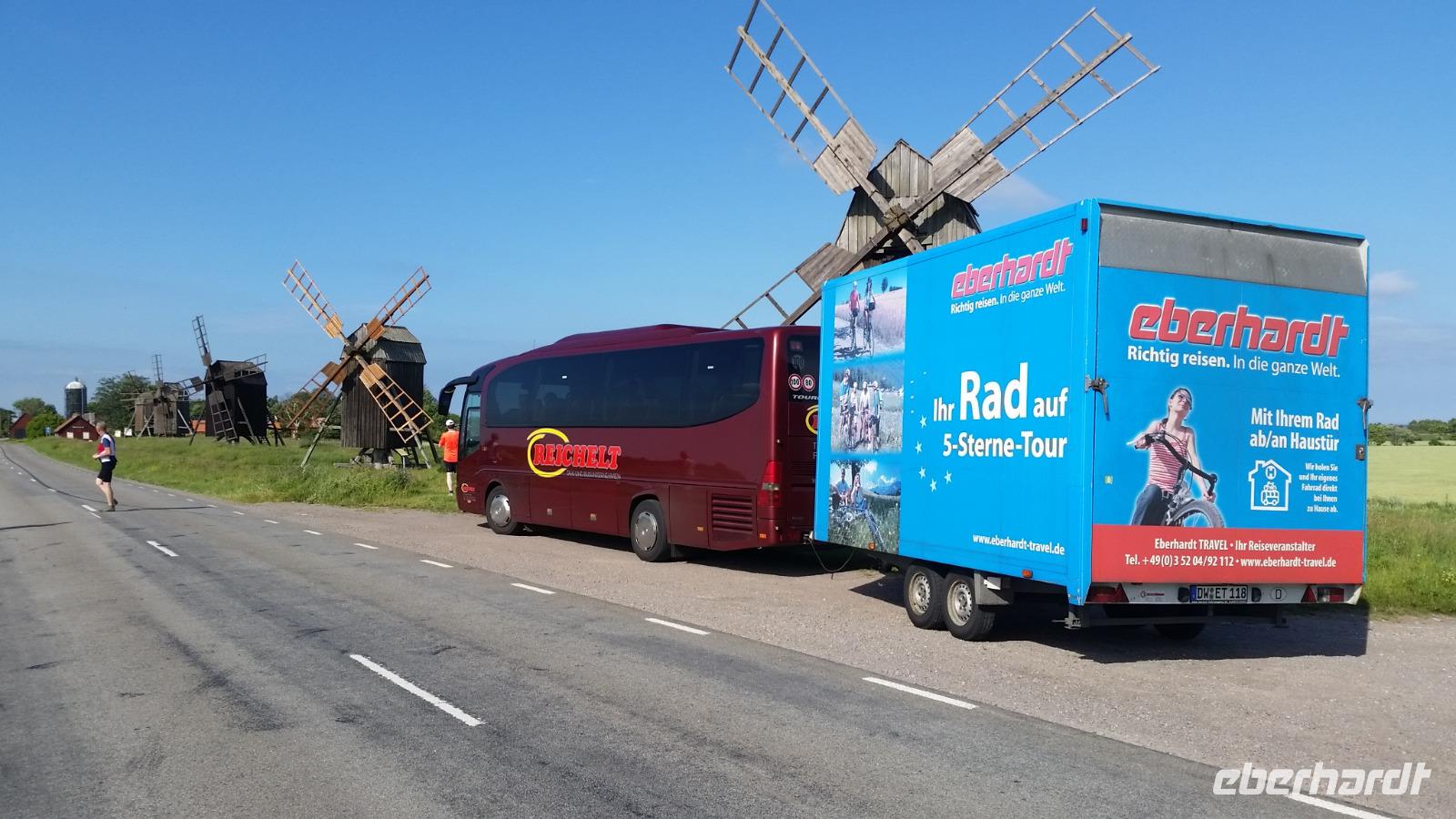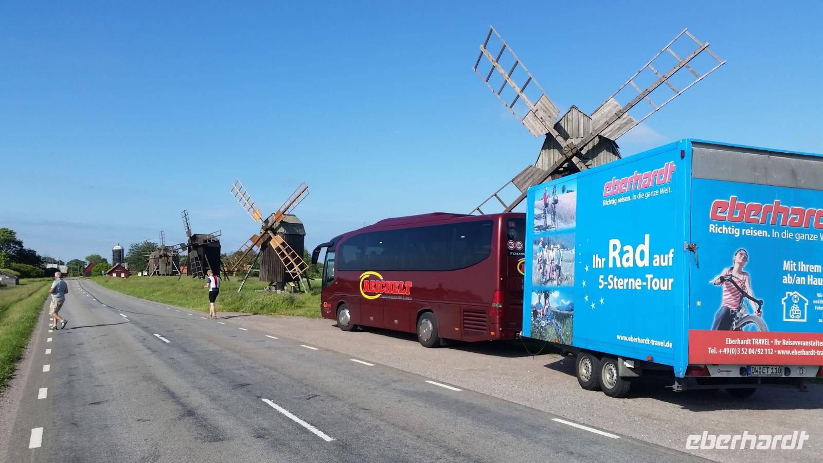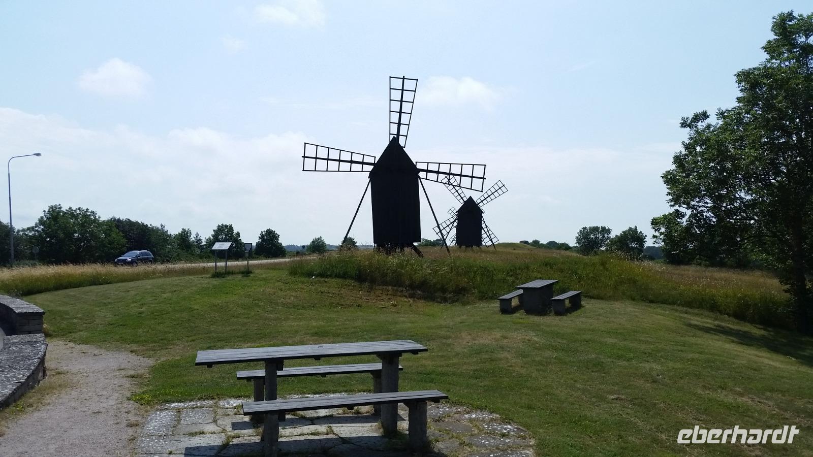 Unsere Mittagspause legen wir in diesem Jahr auf dem schönen Rastplatz von Resmo ein. Ein schöner Platz mit typischen öländischen Windmühlen.