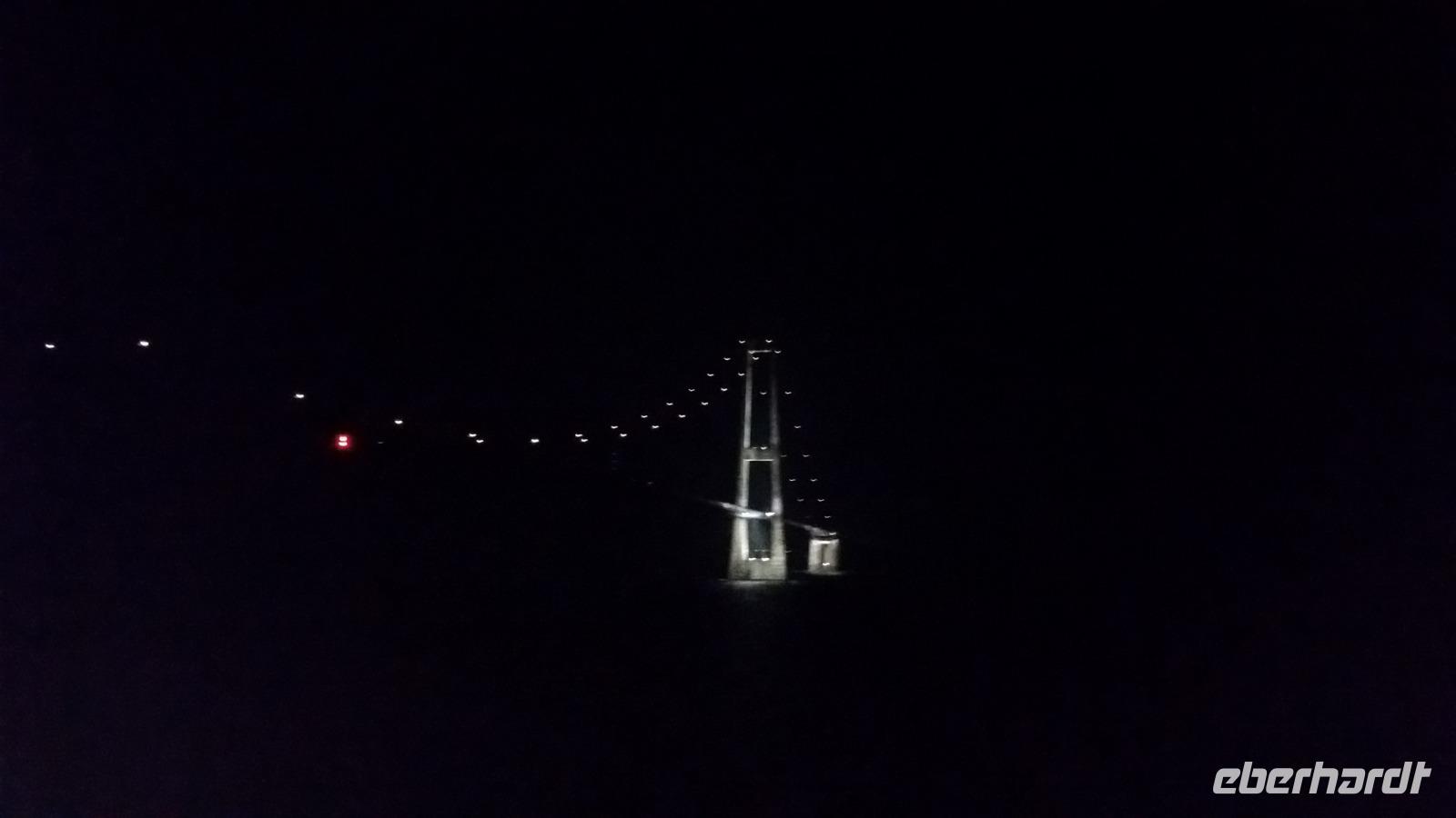 Kurz vor Mitternacht und im leichten Regen unterqueren wir die zweitlängste Hängebrücke Europas die „Großer Belt - Brücke".