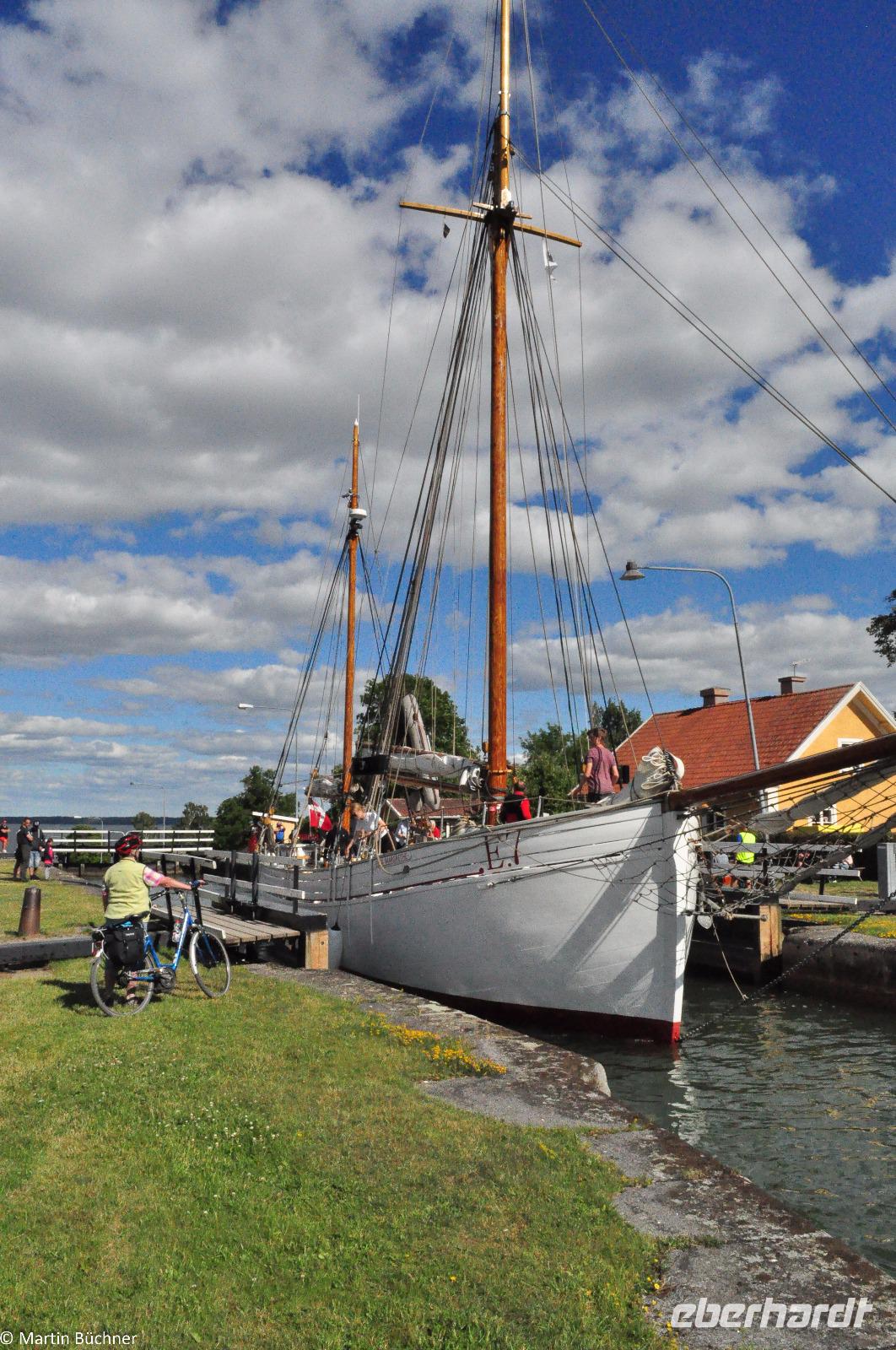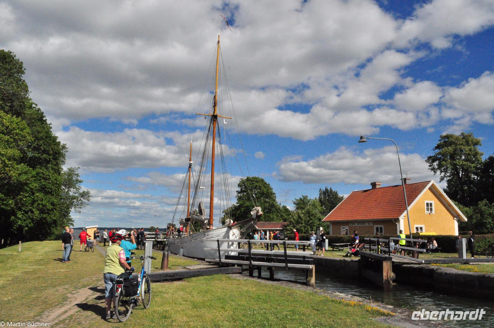 Der Weg führt vorbei an Schleusen, Schiebebrücken und sogar zwei Aquädukten (Wasserweg über Straße). Unser Zwischenziel ist die 7-Kammern-Schleusentreppe „Carl Johan Slussen" von Berg.