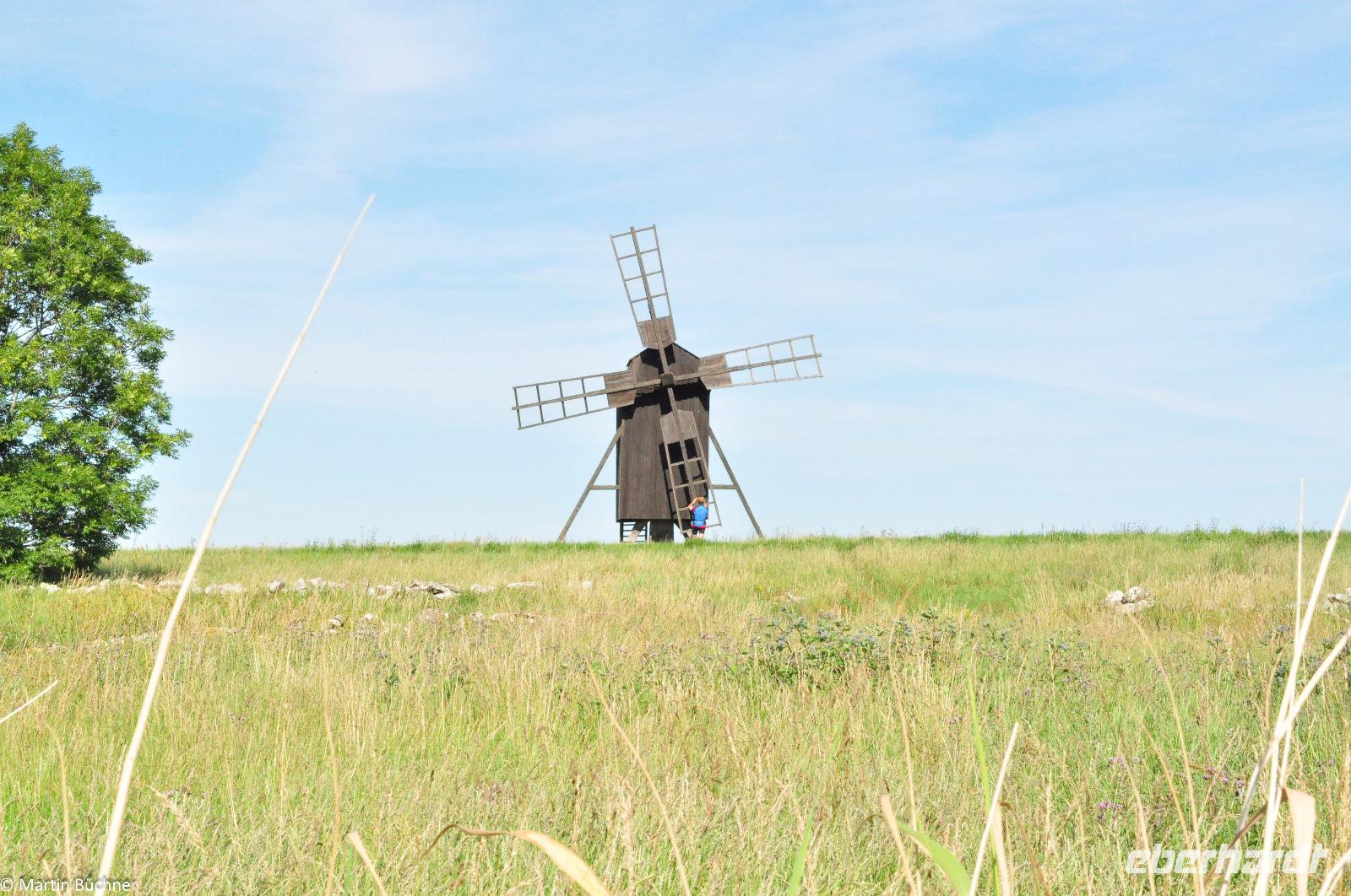 Das Wetter sieht stabil aus, wir entscheiden ohne Umschweife sofort los zu radeln. Wir fahren über die Ölandbrücke bis nach Färjestaden. Dort wechseln wir auf die Räder. Vorbei am Karlevisten geht es durch die Agrarlandschaft Ölands immer wieder vorbei an Höfen, Äckern, Weiden und natürlich Windmühlen. Die Agrarregion Öland wurde sogar zum UNESCO Weltkulturerbe erklärt. Auf der zweitgrößten schwedischen Insel gibt es ein gut ausgebautes Radwege-Netz. Weite Teile unserer Etappe verlaufen auf asphaltierten Radwegen oder ruhigen Nebenstraßen.