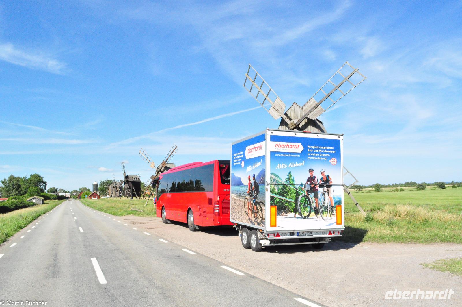 Unsere Mittagspause legen wir in diesem Jahr auf dem schönen Rastplatz von Resmo ein. Ein schöner Platz mit typischen öländischen Windmühlen.
