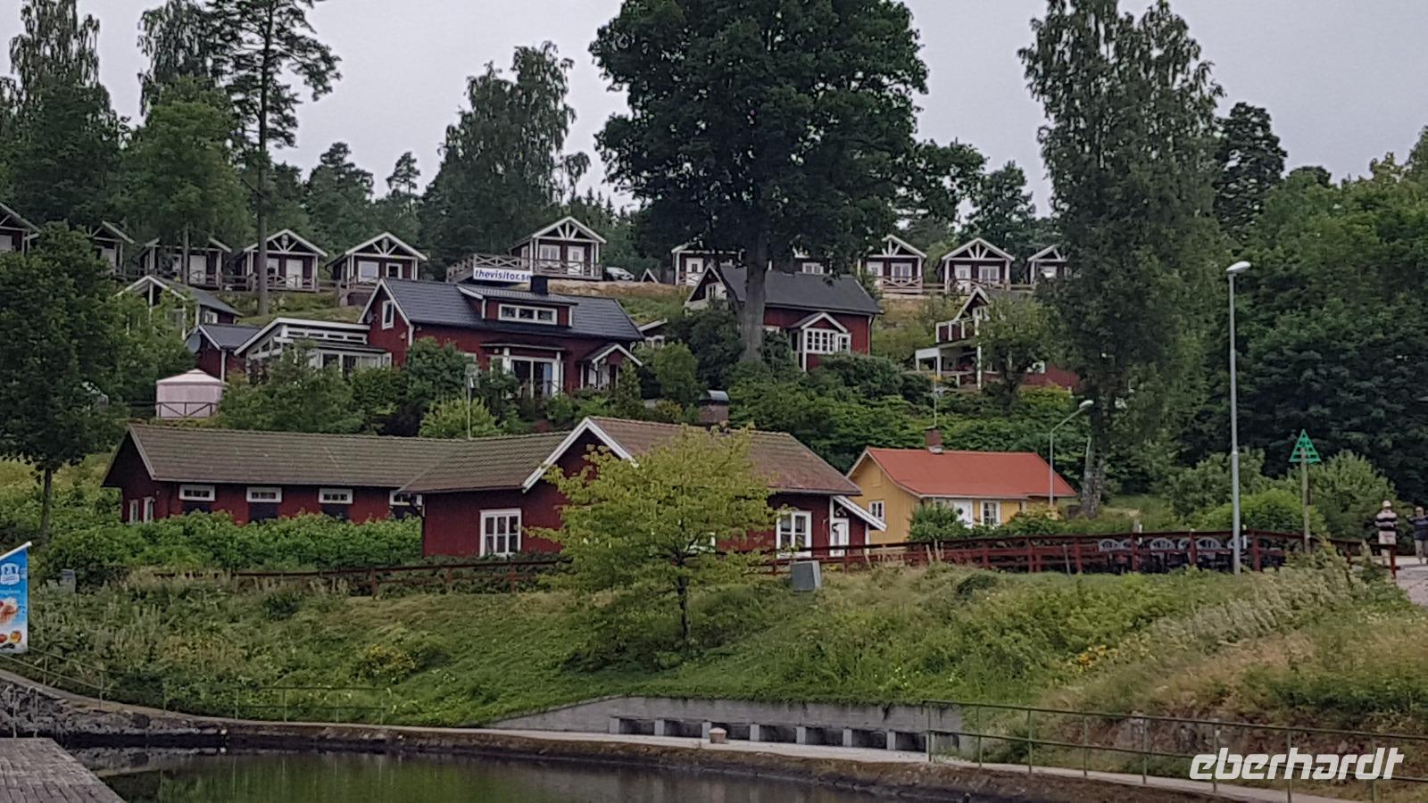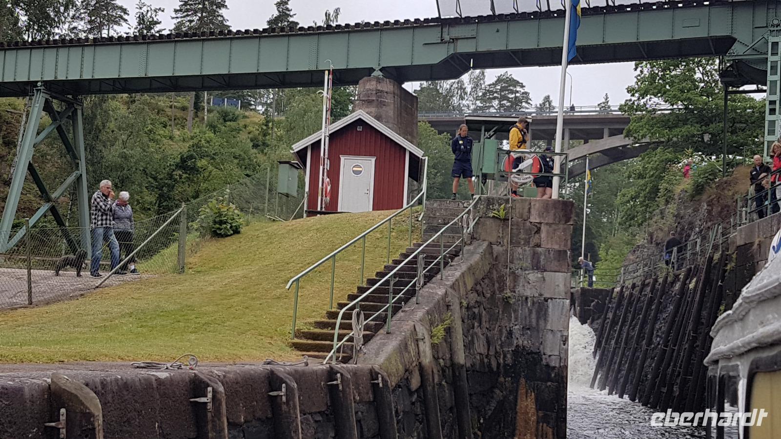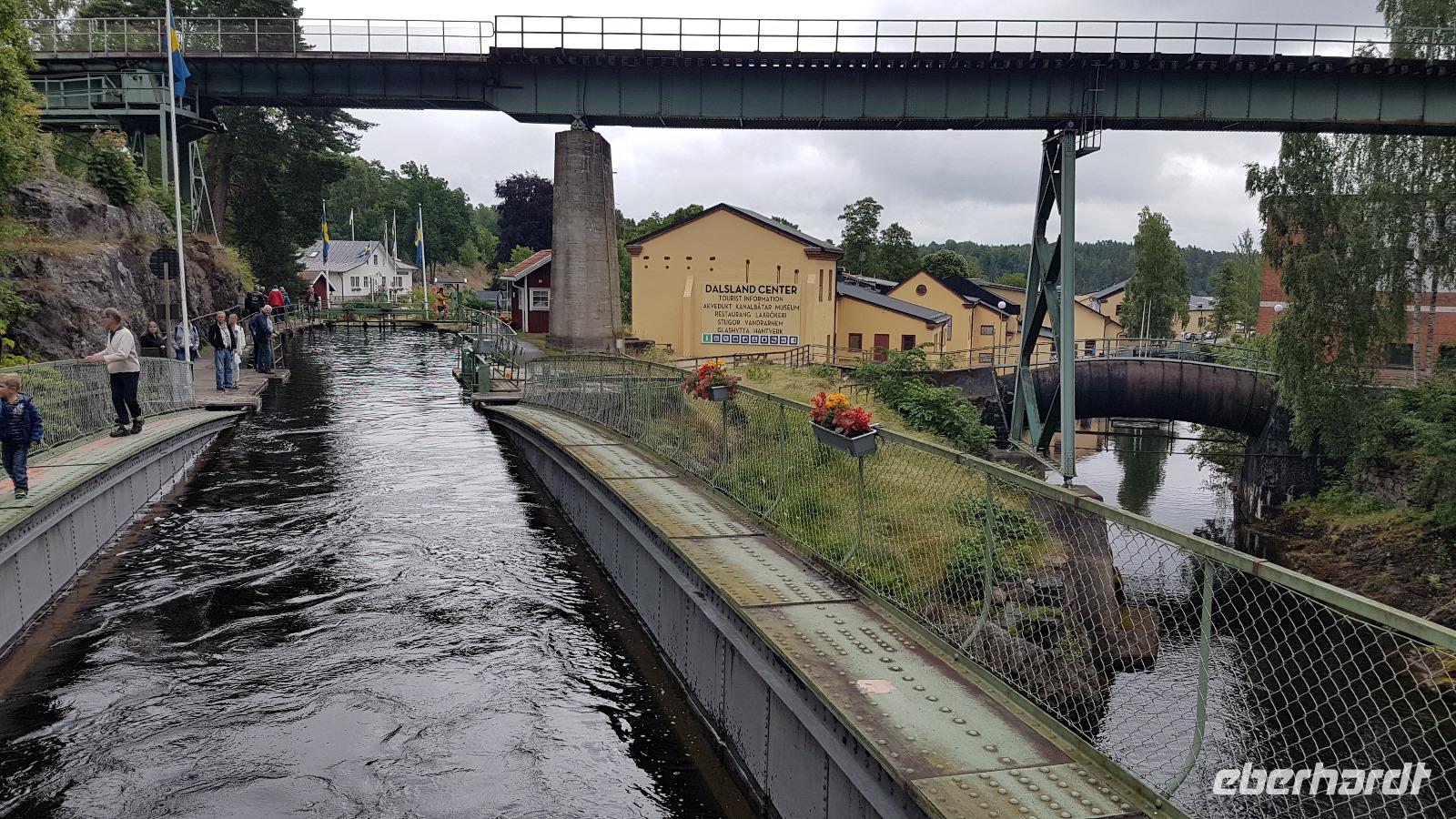 Gleich nach dem Frühstück fuhren wir bei herrlichem Sonnenschein von unserem Hotel nach Håverud am Dalsland-Kanal. Das ist eine künstliche Wasserstraße, die den See Vänern mit einer Reihe von Seen der historischen Provinz Dalsland und dem westlichen Värmland verbindet. Der Kanal wurde zwischen 1864 und 1868 angelegt. Das gesamte System ist etwa 254 km lang, wobei aber nur 12 km neu gegraben oder aus dem Fels gesprengt wurden. Boote, die den Kanal durchfahren, gelangen dabei durch zwölf Schleusen und beim Ort Håverud über eine markante Trogbrücke, die Stromschnellen überbrückt. Der gesamte Höhenunterschied des Kanals beträgt 66 Meter. Wir schippern drei Stunden durch enge Kanäle, alte Schleusen und durch schöne Seenlandschaft. Der Blick öffnet sich immer wieder auf einzelne Gehöfte oder Dörfer mit bunten Holzhäusern. Anschließend fuhren wir noch in das Städtchen Vänersborg, um mit einem kleinen Ortsbummel den Tag entspannt ausklingen zu lassen.