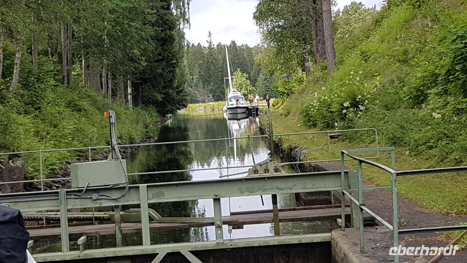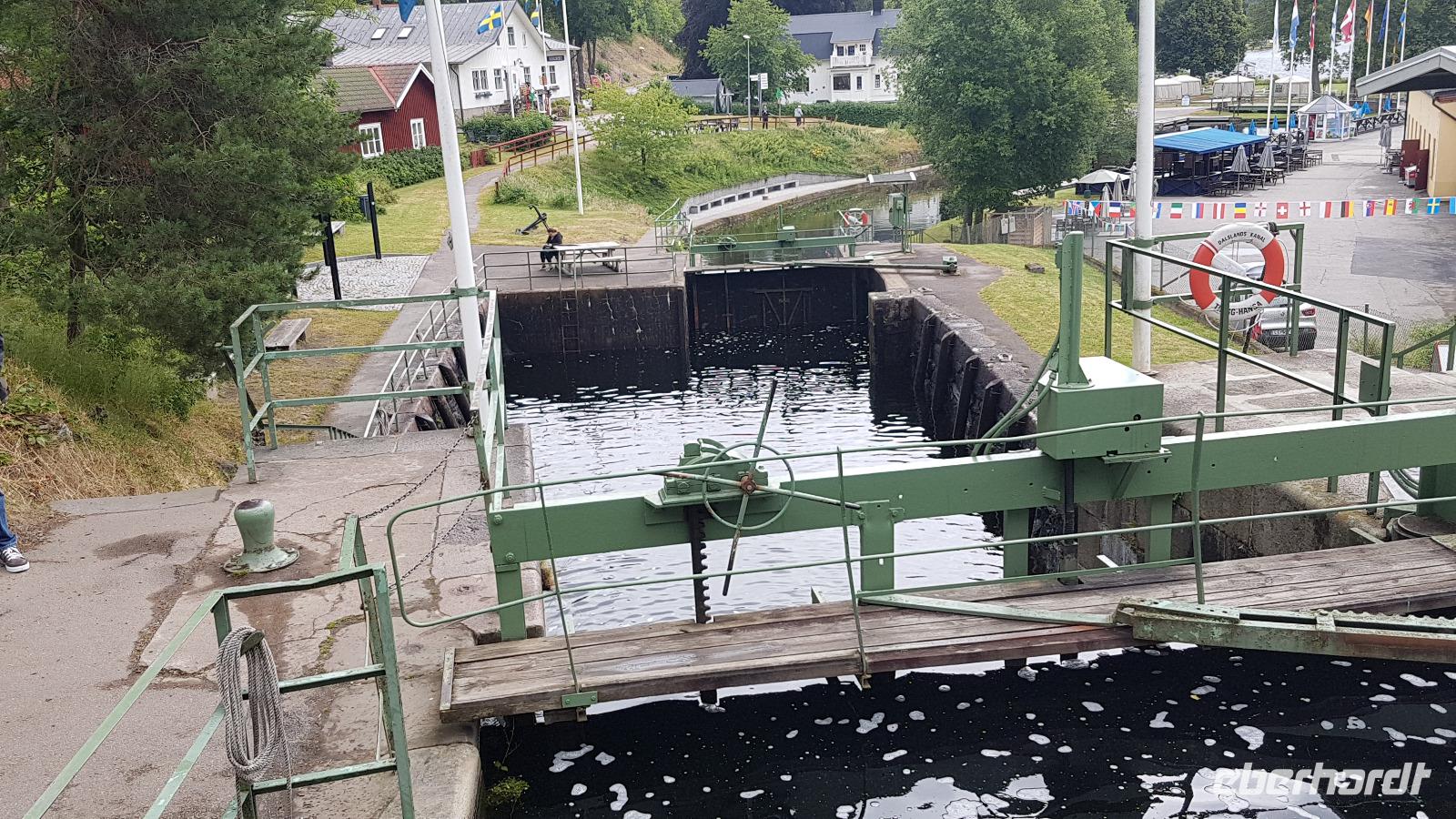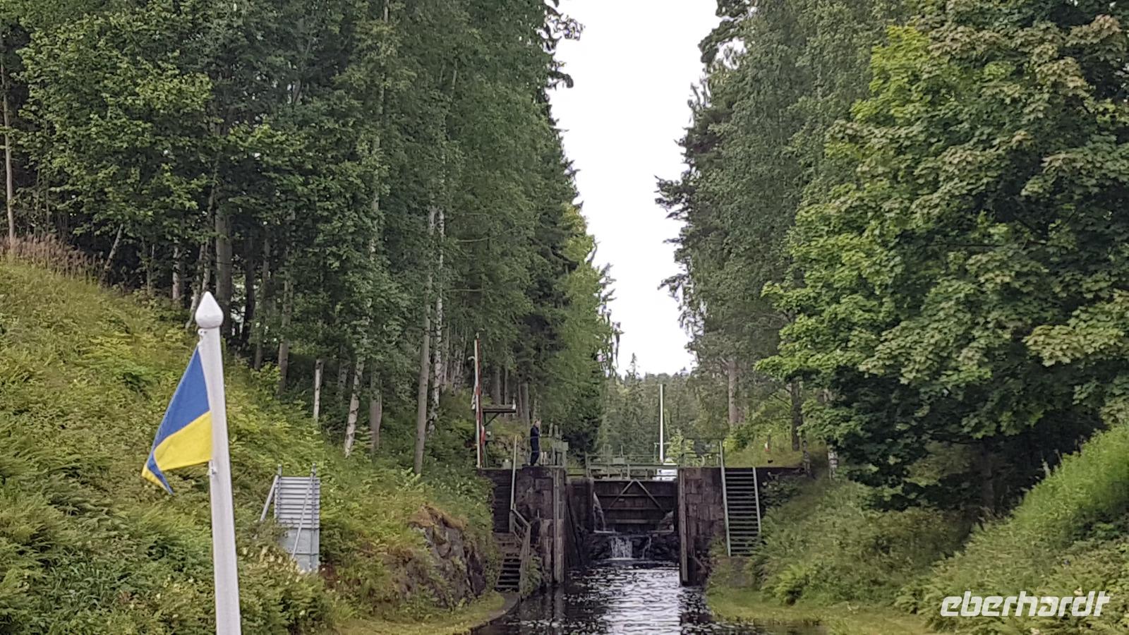 Dann geht es nach Berg zum größten Schleusensystem des Götakanals. Auf einer Länge von 190,5 km verbindet er mehrere Seen miteinander. 87,3 km bilden die eigentliche Kanalstrecke. Der Kanal wurde von 1810 an in 22 Jahren von 58.000 schwedischen Soldaten mit der Hand gegraben und ist zusammen mit dem Trollhätte-Kanal und dem Göta älv eine 390 km lange Wasserstraße quer durch Schweden, die einen Höhenunterschied von 91,5 m überwindet. Er passiert 58 Schleusen, 50 Brücken und zwei Aquadukte (Trogbrücke). Nach über drei sehr beschaulichen Stunden und schöne Ausblicke in die idyllische Landschaft endet unsere Fahrt in Borensberg.