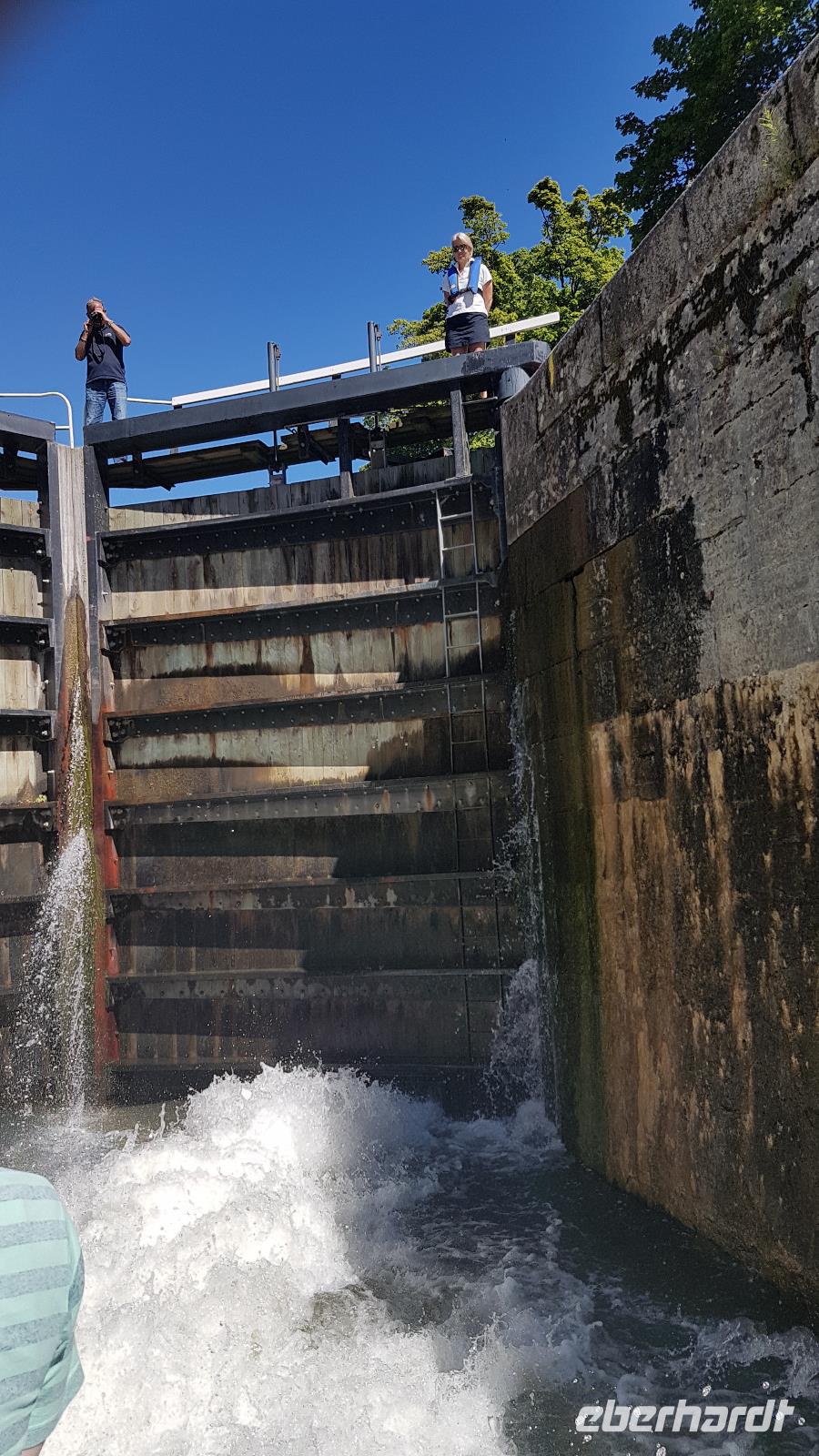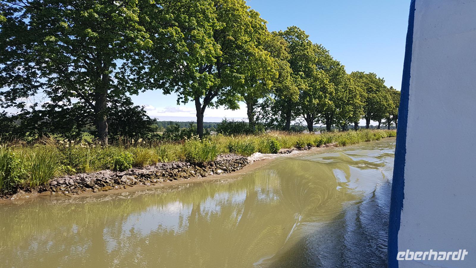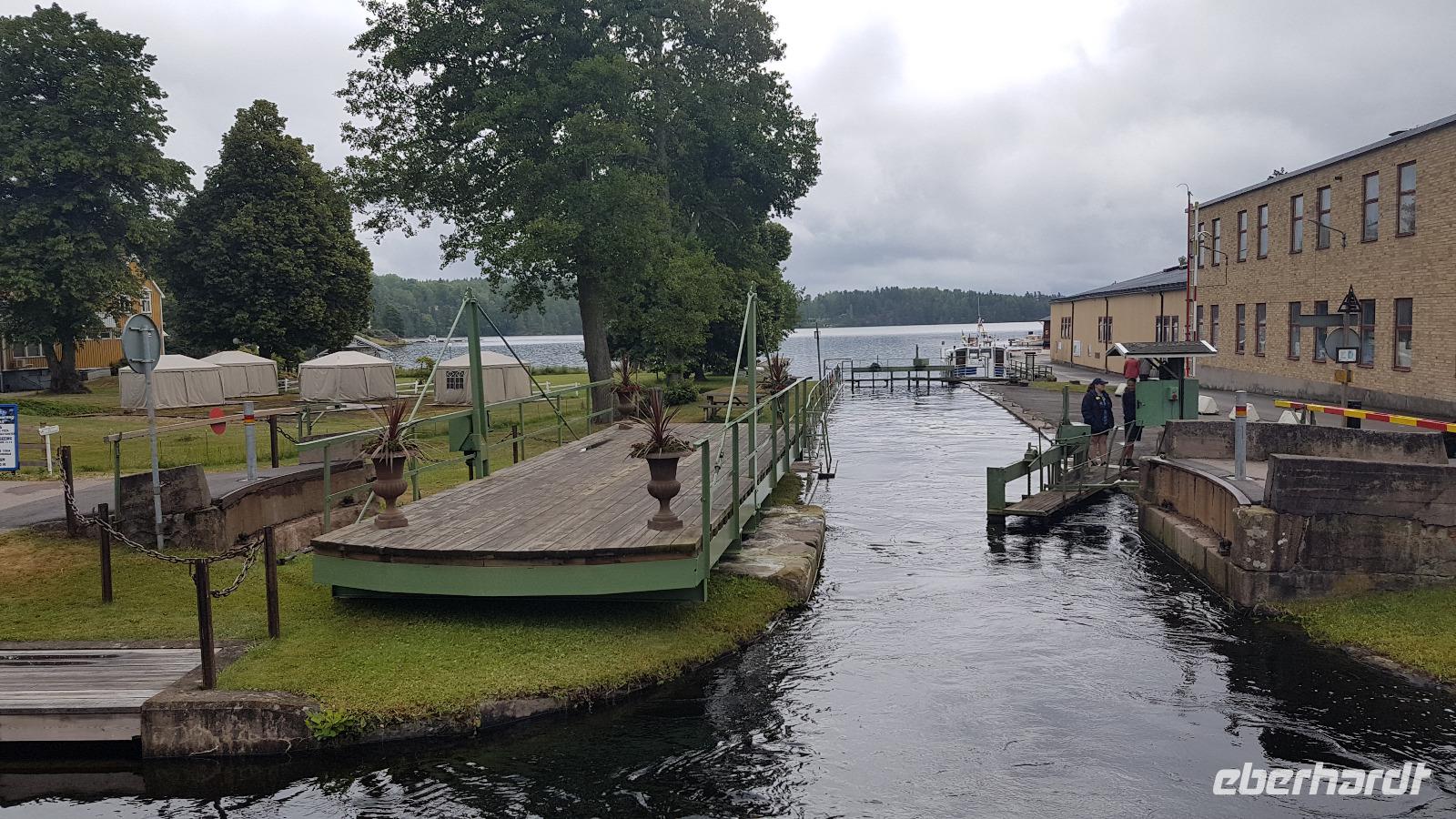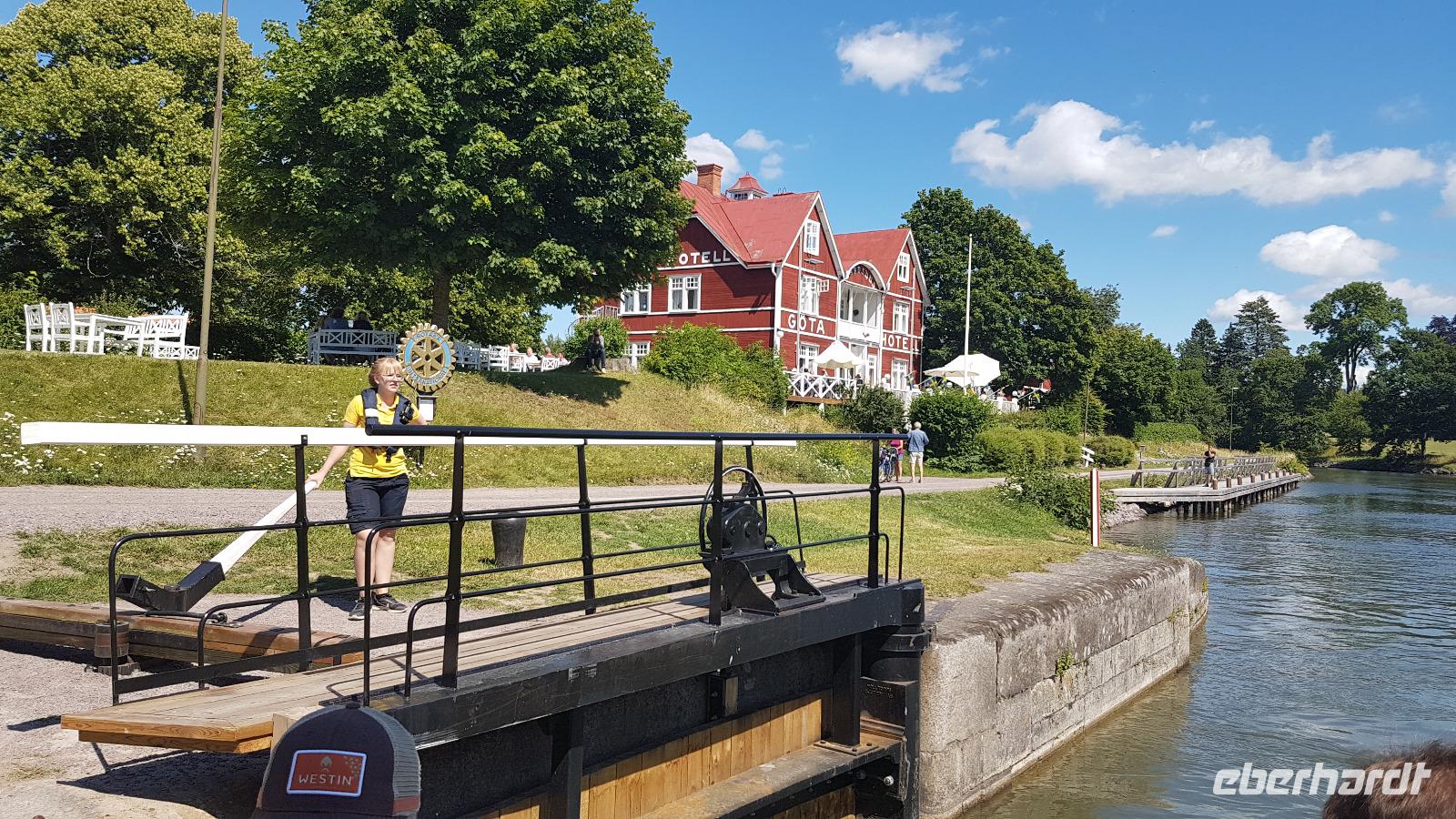 Dann geht es nach Berg zum größten Schleusensystem des Götakanals. Auf einer Länge von 190,5 km verbindet er mehrere Seen miteinander. 87,3 km bilden die eigentliche Kanalstrecke. Der Kanal wurde von 1810 an in 22 Jahren von 58.000 schwedischen Soldaten mit der Hand gegraben und ist zusammen mit dem Trollhätte-Kanal und dem Göta älv eine 390 km lange Wasserstraße quer durch Schweden, die einen Höhenunterschied von 91,5 m überwindet. Er passiert 58 Schleusen, 50 Brücken und zwei Aquadukte (Trogbrücke). Nach über drei sehr beschaulichen Stunden und schöne Ausblicke in die idyllische Landschaft endet unsere Fahrt in Borensberg.