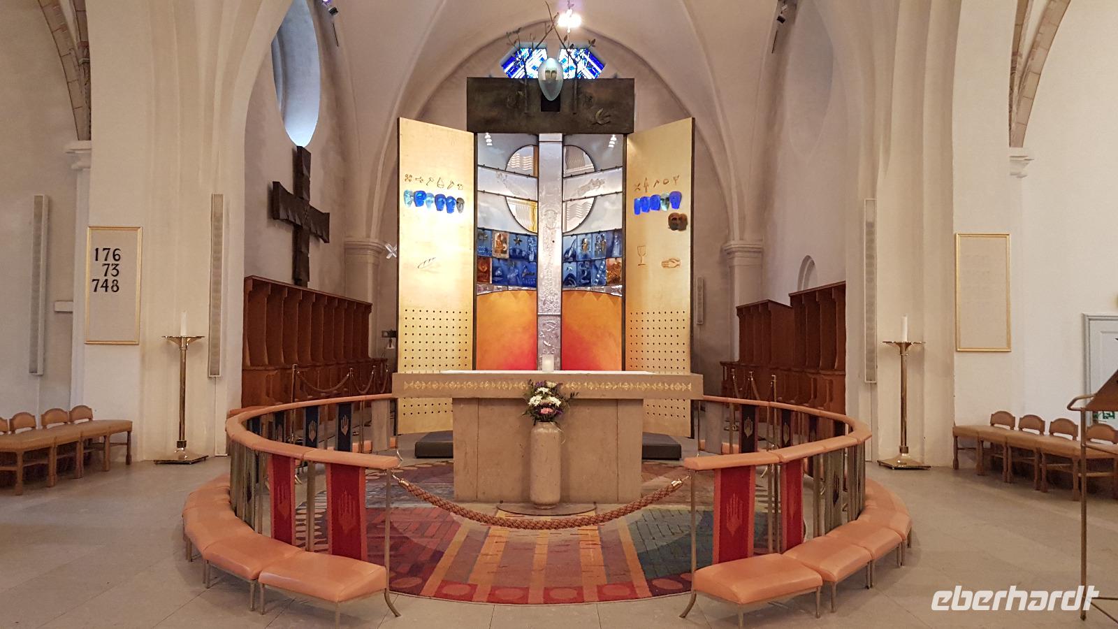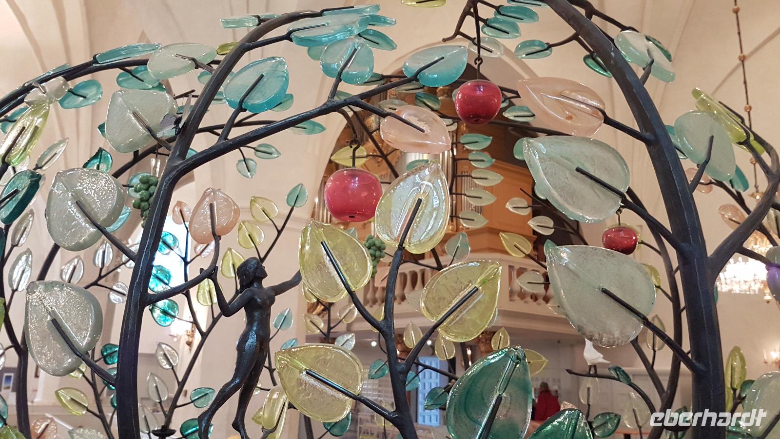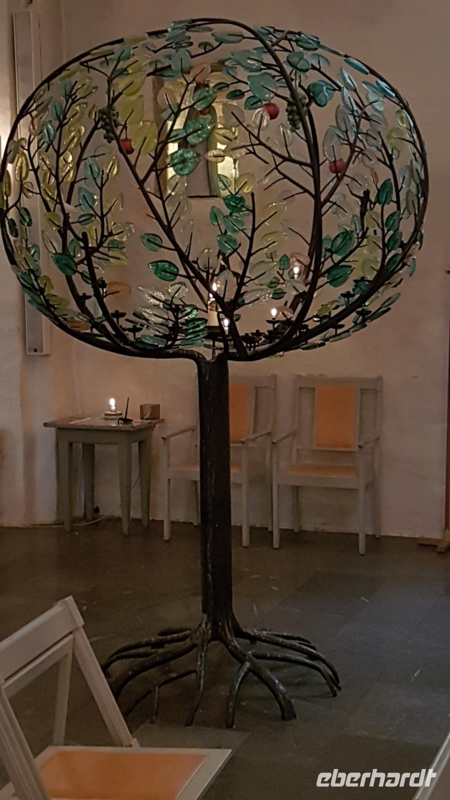 Gleich nachdem Frühstück machen wir einen Spaziergang zum Dom von Växjö, der schon von weitem mit seinen 2 grünen Türmen zu sehen ist. Im Inneren ist es gelungen, die moderne Gestaltung, zum Beispiel des Altars und des sich links befindlichen „Lebensbaumes" sowie der drei Orgeln mit den Darstellungen aus vergangenen Zeiten, zu vereinen. Viel Glas wurde verarbeitet.