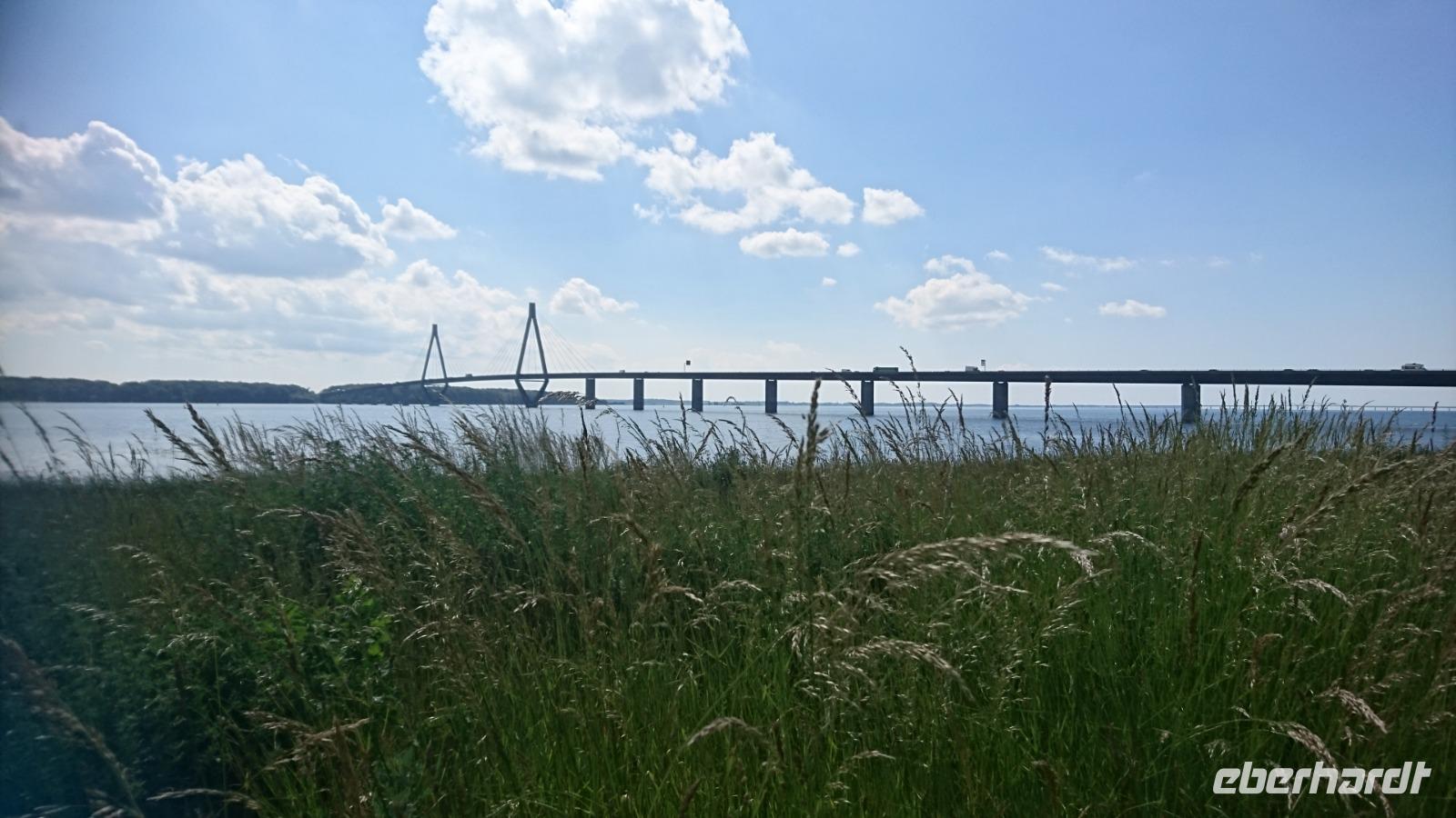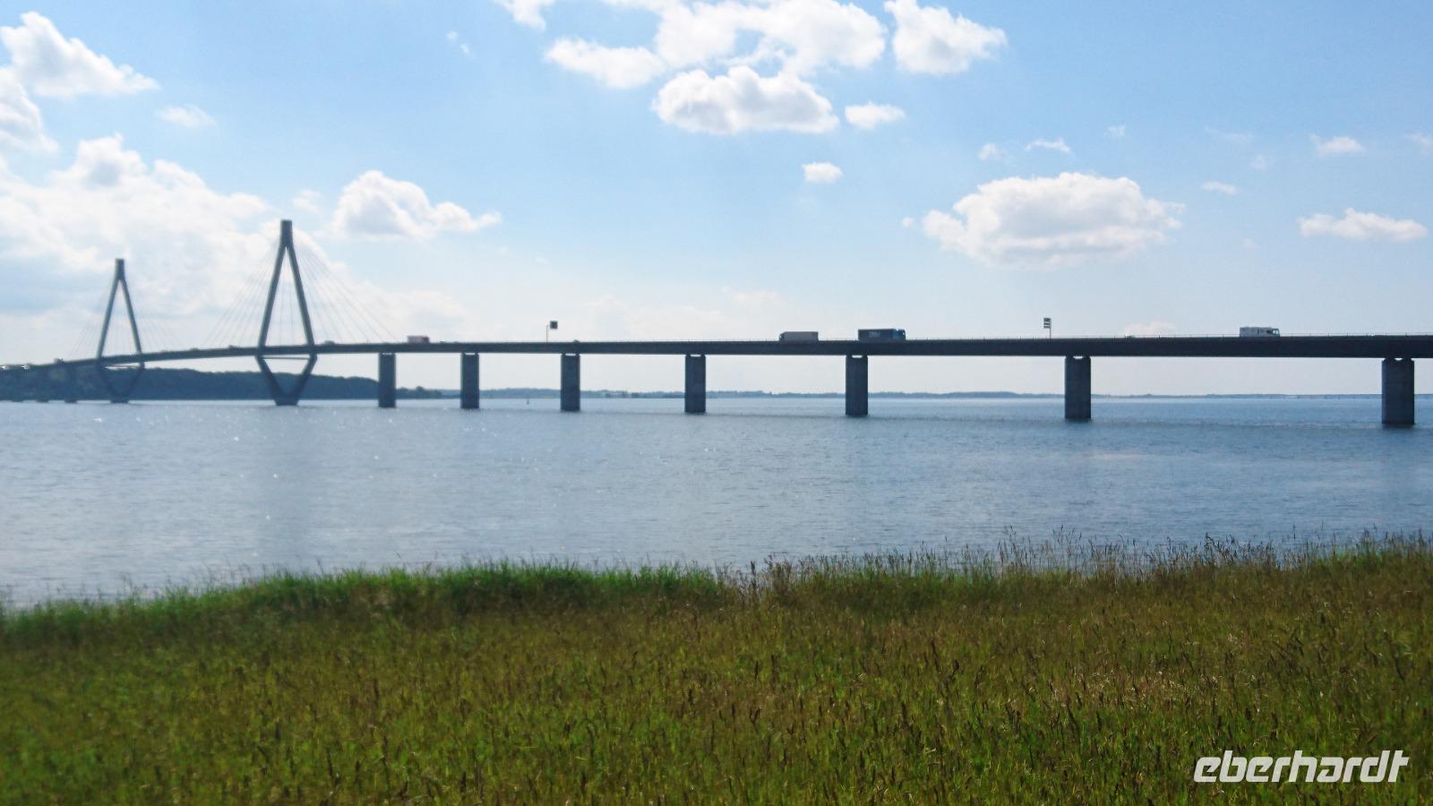 Knapp 50 km nördlich von Gedser hielten wir an den 1984 fertiggestellten Farobroernebrücken, um das herrliche warme Sommerwetter und den Ausblick auf die 2 Brücken zu genießen. Sie verbinden die Autobahn von Seeland nach Falster. Die südliche Brücke ist eine Schrägseilbrücke zwischen der Insel Faro und der Insel Falster über den Storstrom. Sie hat eine Spannweite von 290 Metern. Die Nordbrücke hingegen ist eine Balkenbrücke mit einer Länge von 1596 Metern, die Faro und Seeland verbindet und über den Kalvestrom gebaut wurde. Über die Brücken laufen die Europastraßen E 47 und 55 und damit bilden beide Straßen wichtige Verkehrsadern zwischen dem Süden und dem Norden Dänemarks.