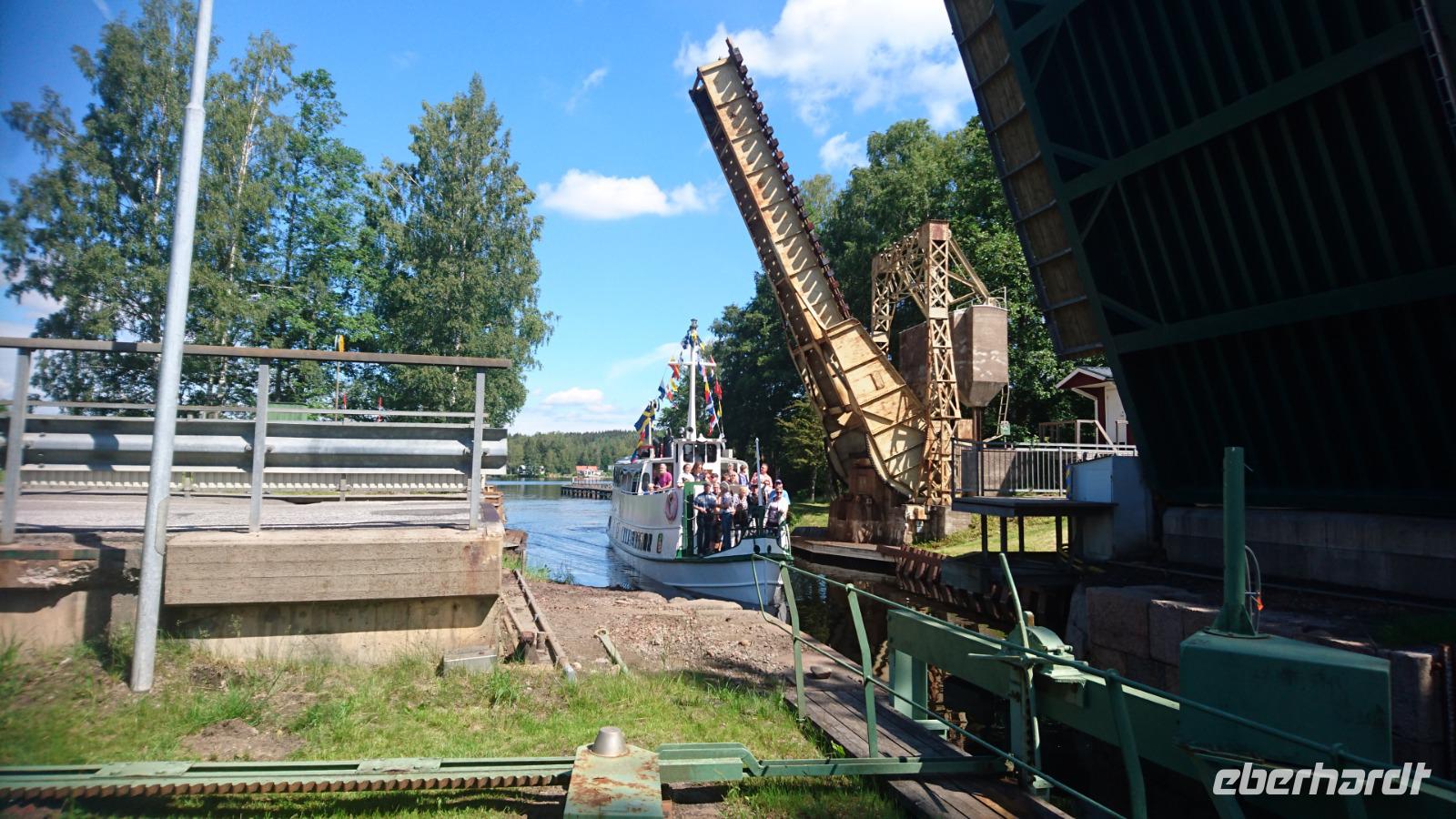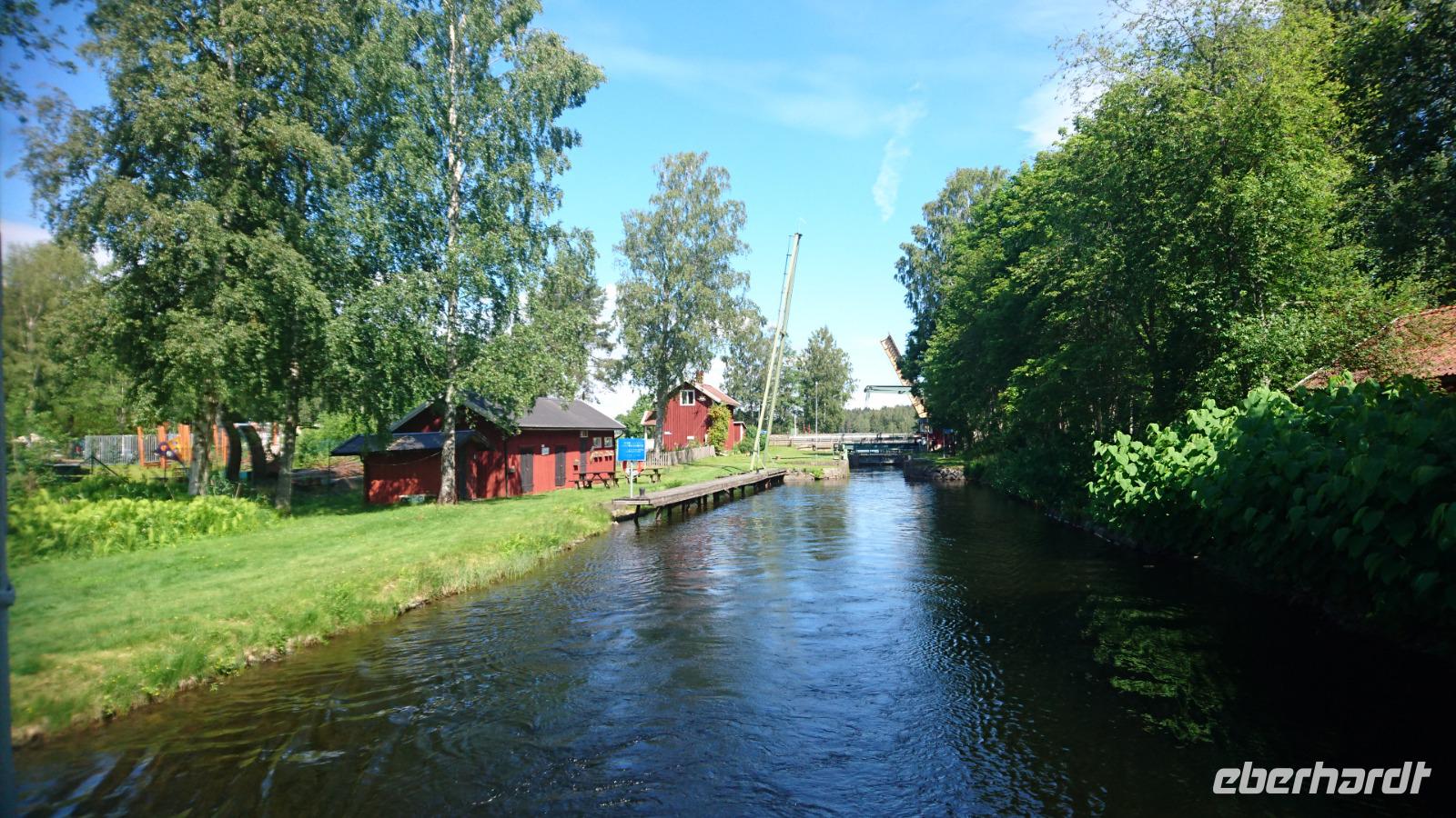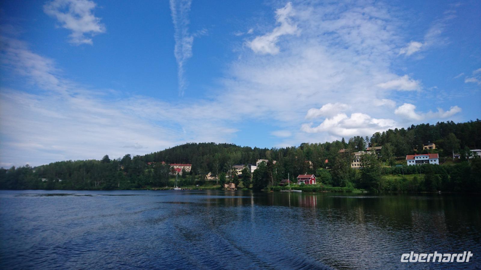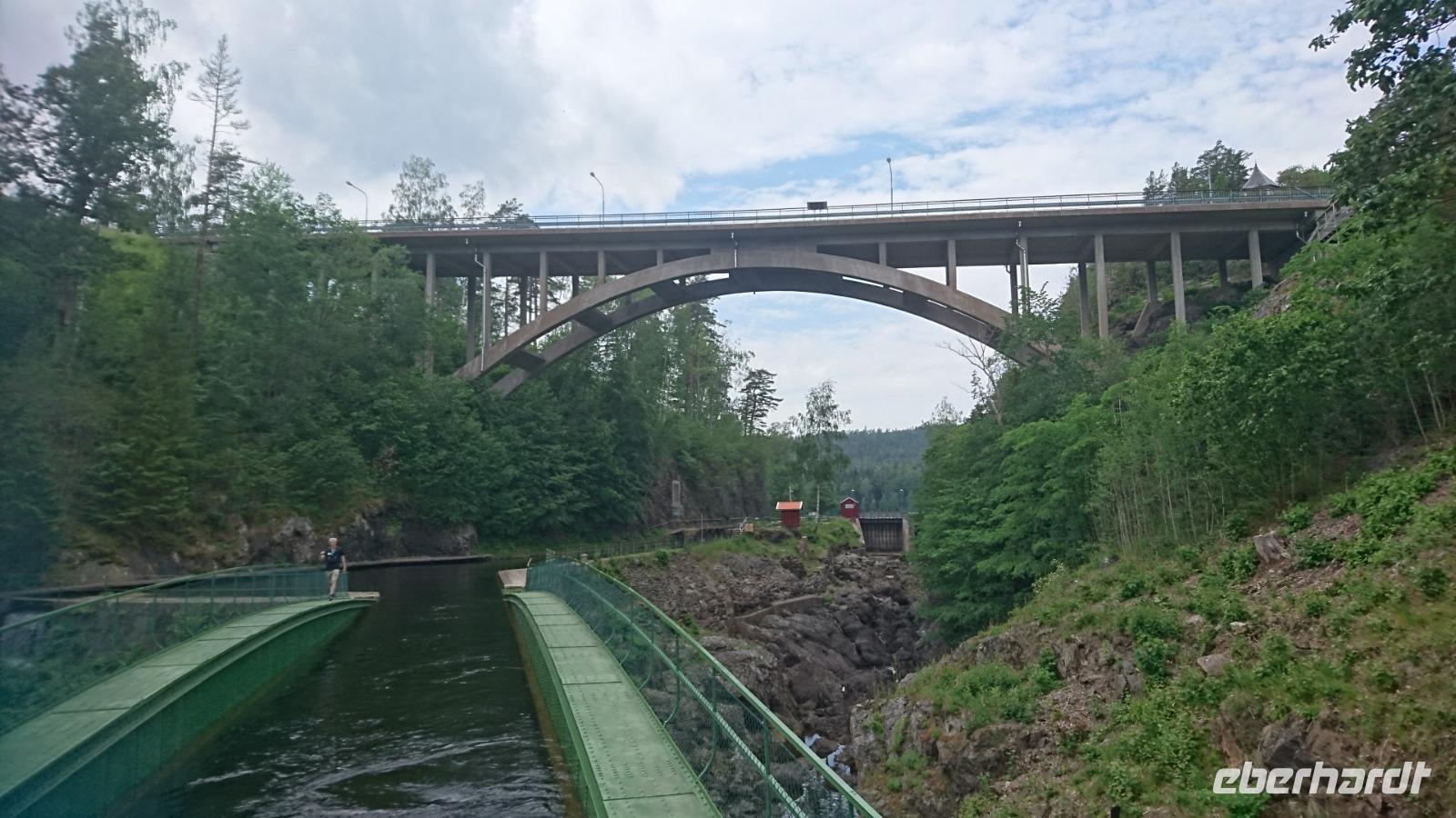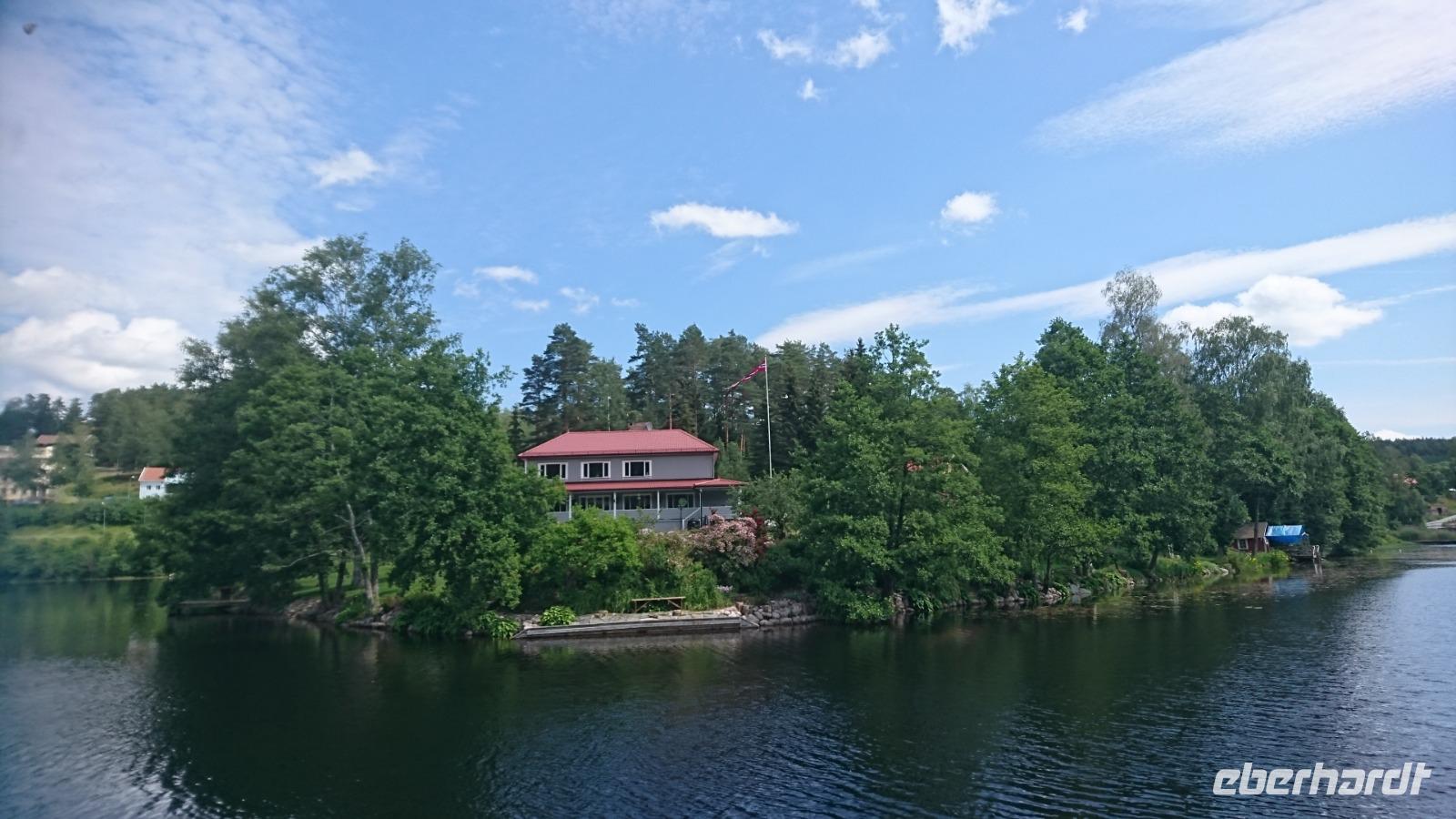 So staunten wir über die engen Schleusen und es verblüffte uns bei jeder aufs neue, wie tief wir runter sanken. Immer wieder kommt man auf einen herrlichen See und an den Ufern sieht man die so typischen Holzhäuschen in weiten Wäldern stehen. Kurz vor unserem Aussteig an der Glashütte in Haverud fährt man sogar über eine Brückenkonstruktion, die fast wirkte, wie ein langgezogener Pool.