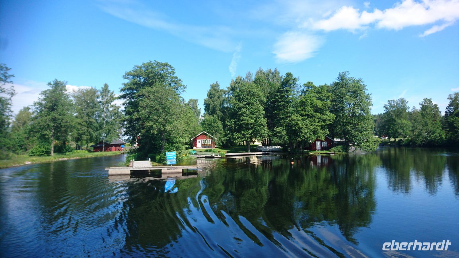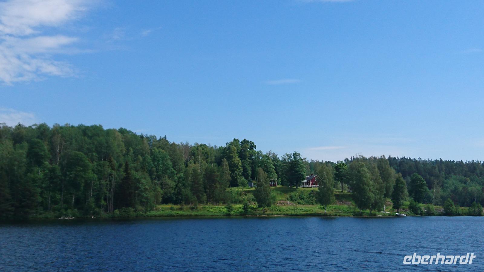 Bei strahlendem Sonnenschein machten wir uns auf den Weg am Vänersee entlang in Richtung Värmland und genossen die romantische südschwedische Landschaft mit vielen Wiesen, unterbrochen von Waldinseln und immer wieder ragte eines der roten, gelben oder weißen Holzhäuschen hervor mit schön geschnitztem Balkon. Unser Ziel war heute der Dalslandkanal.