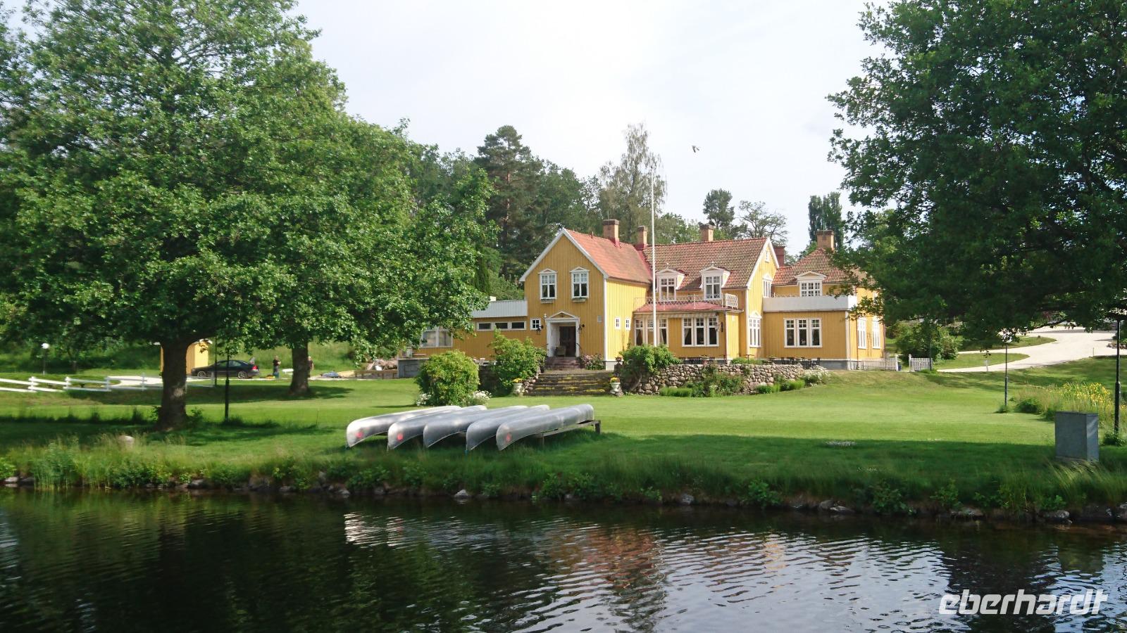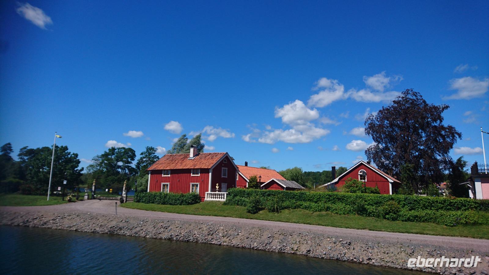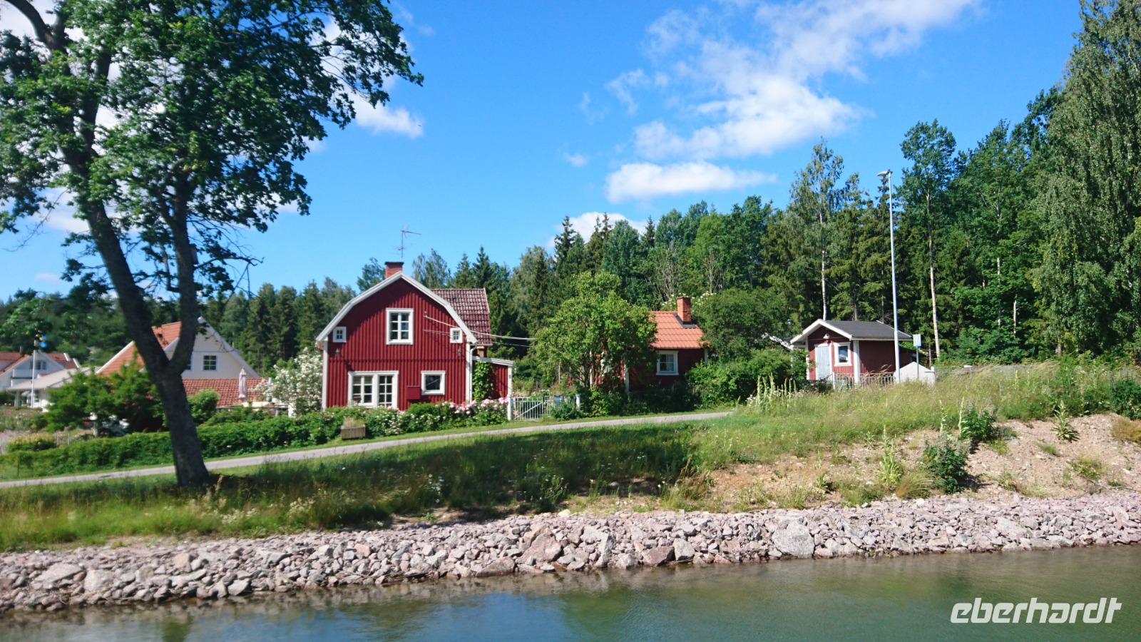 Wir genossen diese 3,5 Stunden dauernde Fahrt sehr, langsam schlängelten wir uns durch die Landschaft der historischen Region Smaland, aus der sowohl Astrid Lindgren als auch Ikeagründer Ingvar Kamprad stammen. Und genau wie in den Astrid Lindgren Filmen über Michel Lönneberga sieht die Landschaft rechts und links des Kanals aus. Weite Ebenen mit Wiesen und Feldern auf denen der blau blühende Flachs wächst, romantische Holzhäuschen in rot oder gelb, Fahrradfahrer, die die Szenerie vom Radweg aus genießen und an jeder Schleuse stehen Kinder, die einem fröhlich zuwinken.