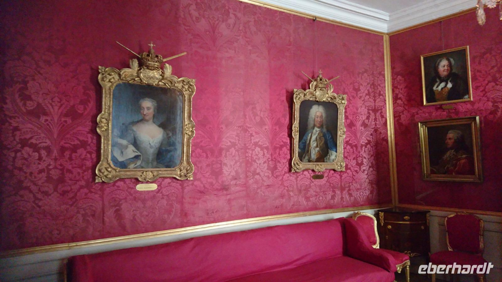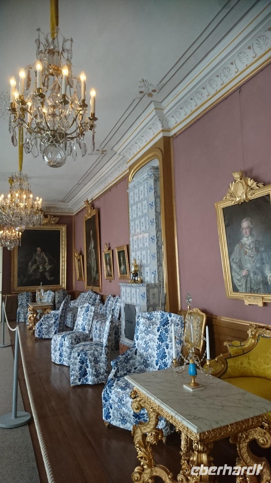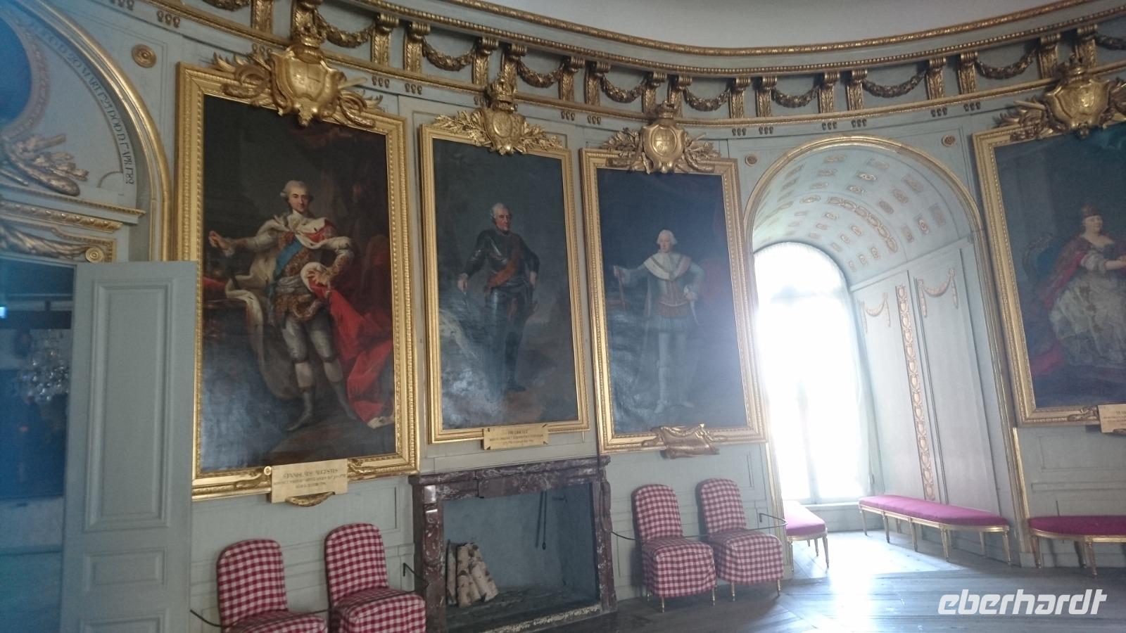 Zur Mittagszeit kamen wir am Schloß Gripsholm an, dem Inbegriff der schwedischen Romantik überhaupt. Die Wasaburg beherbergt heute eine 400jährige Geschichte. Es gibt Gemächer aus der Zeit der Wasakönige und eines der besterhaltenen Theater Europas aus dem 18. Jahrhundert, welches von Gustav III. eingebaut wurde. Umfangreich und bestaunenswert ist die fast 2000 Gemälde umfassende Portraitsammlung, die nahezu sämtliche Wände der Schloßräume füllt.