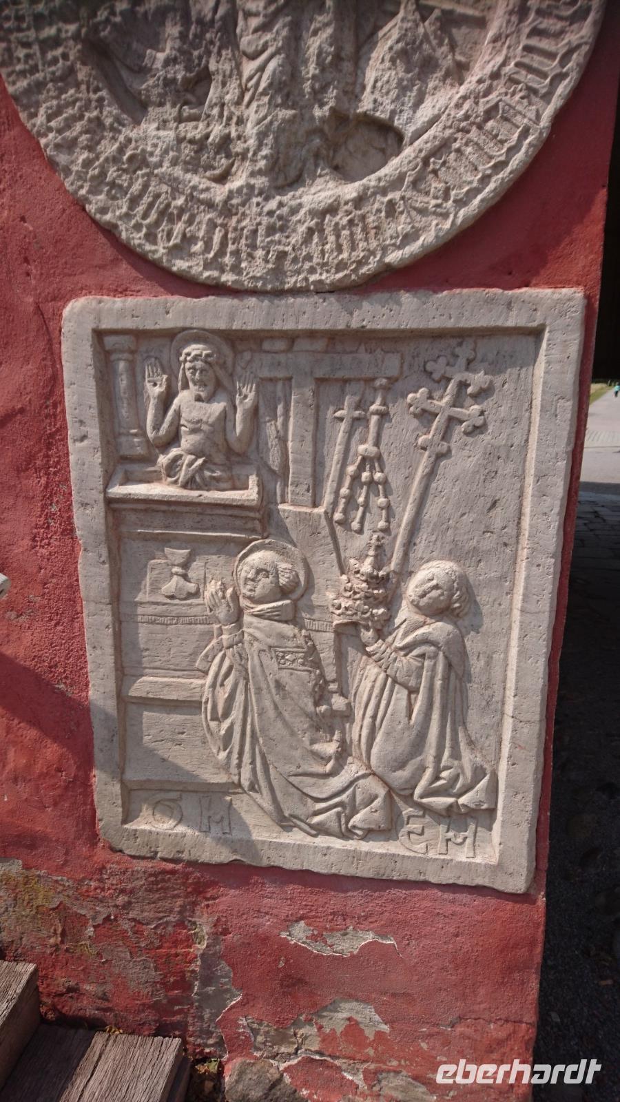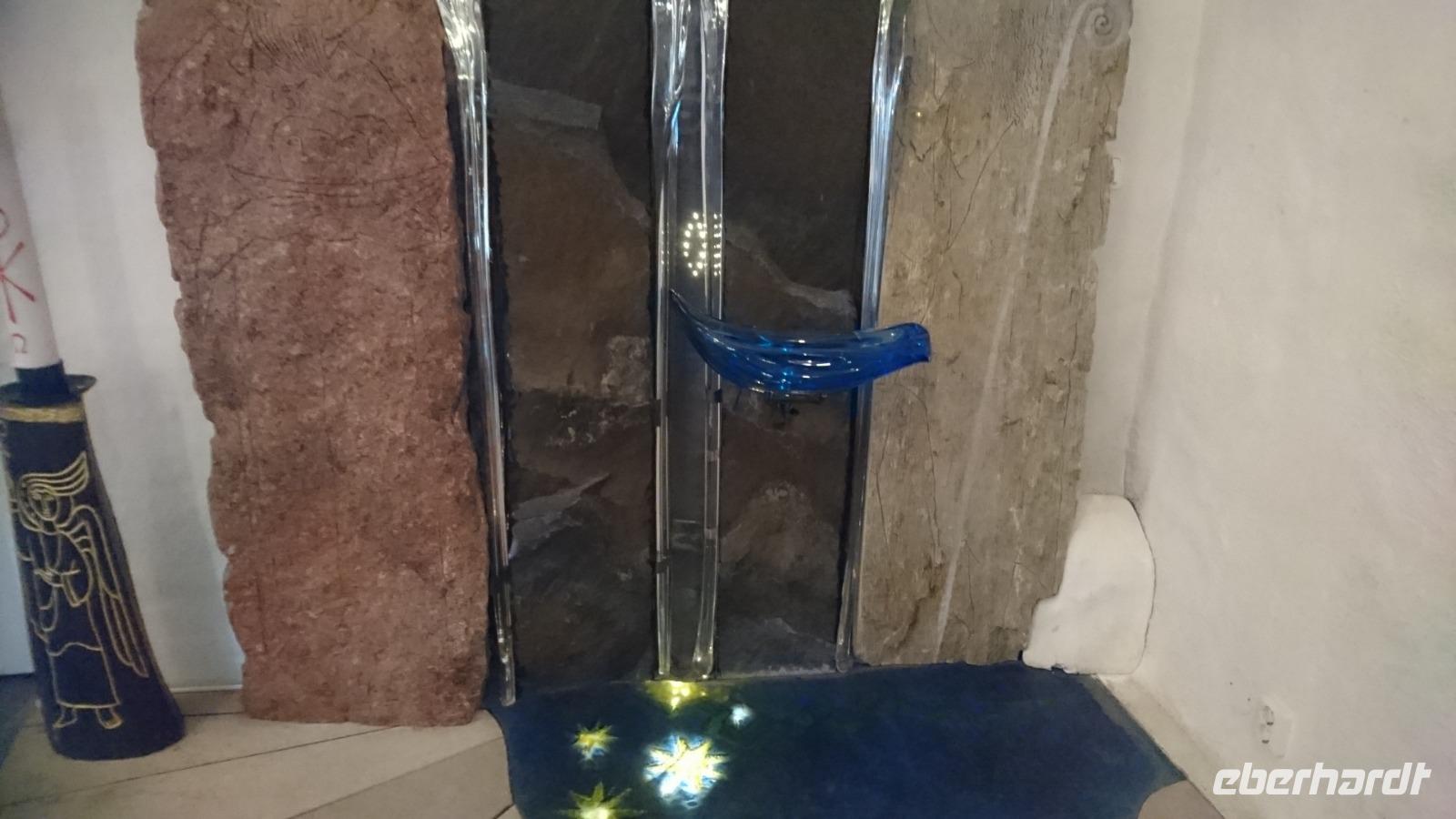 Rechts des Eingangs ist ein weiteres Kunstwerk von Göran Wärff geschaffen worden, ein Taufbecken aus Glas in der Form eines Schiffes, es soll die Arche Noah symbolisieren.