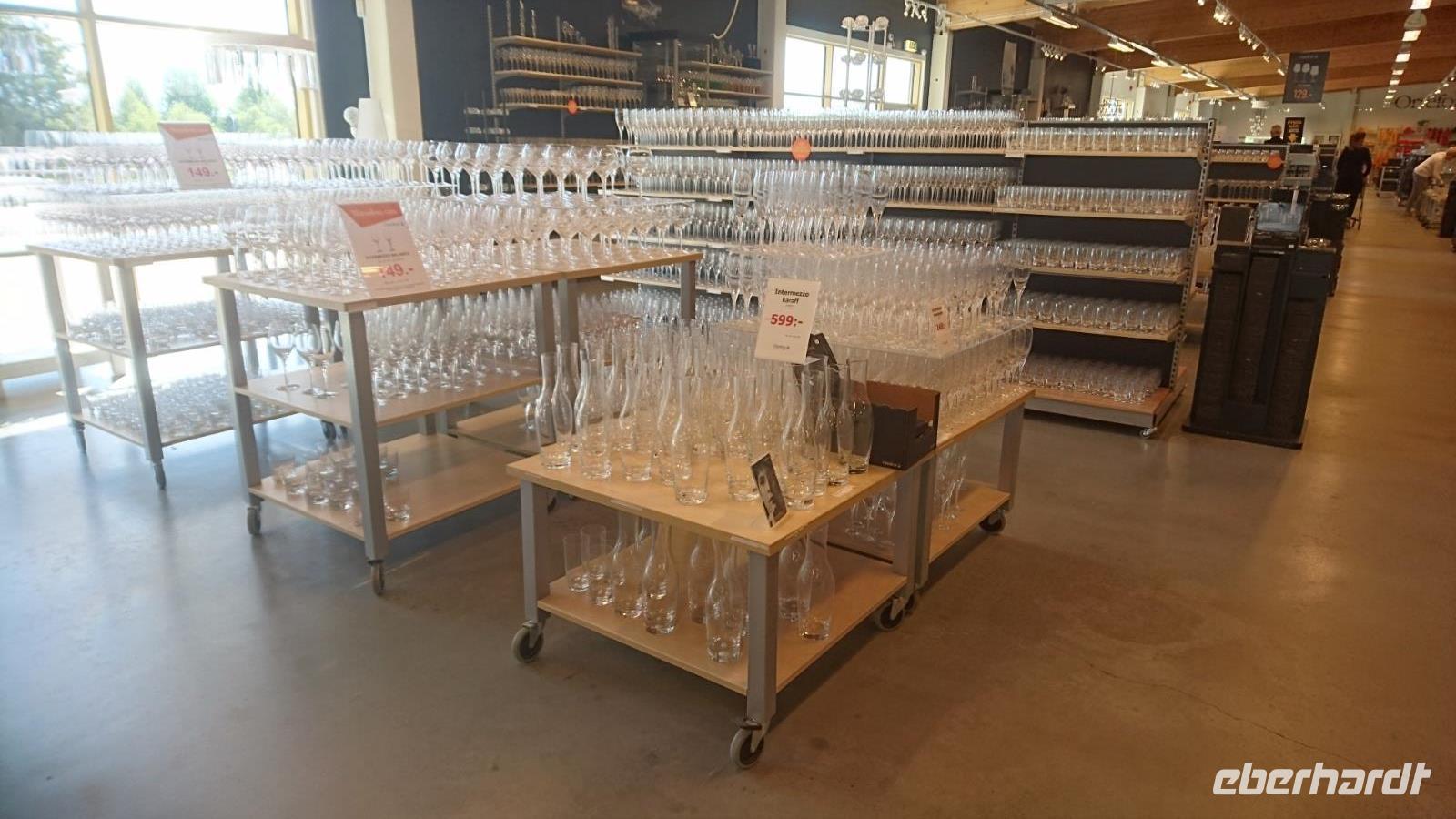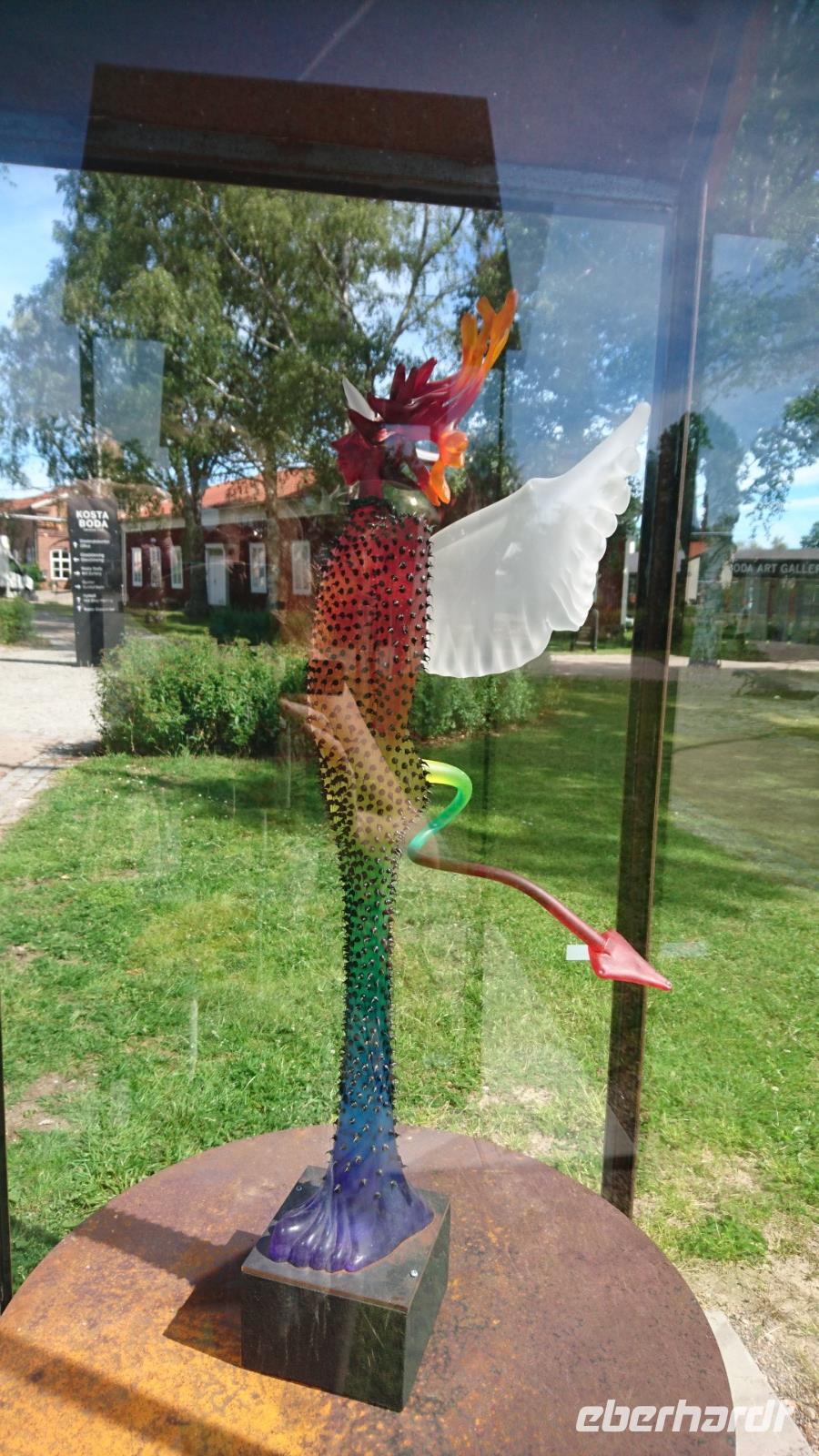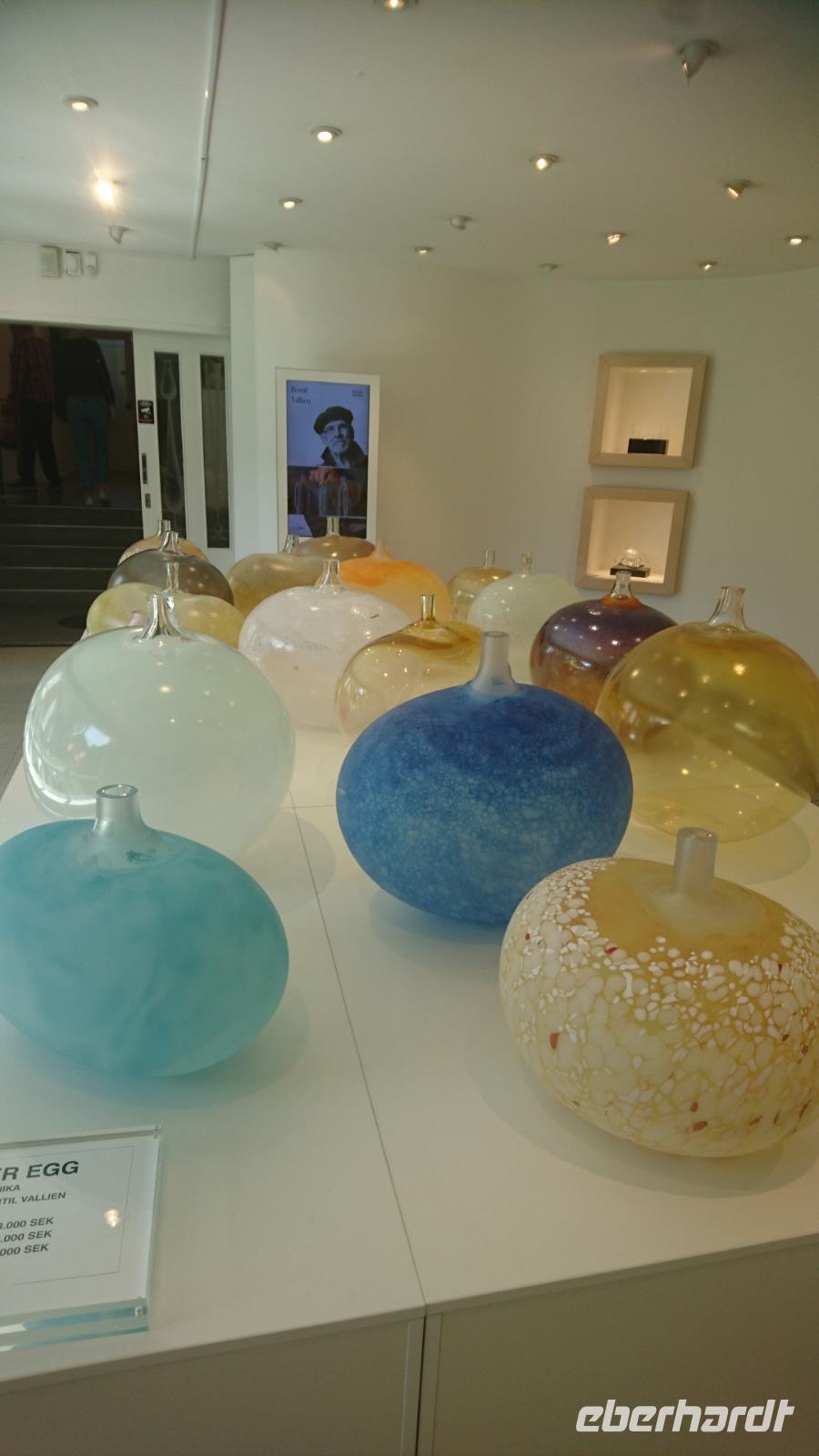 Nun waren wir auf die Glaskunst vorbereitet und gespannt, die Glasfabriken von Kosta und Boda zu besichtigen. Wir fuhren auf das riesige Fabrikgelände, um welches eine ganze Reihe von Läden und Outlets errichtet worden sind und wo man von beiden Fabriken Glaswaren und Haushaltsartikel im typisch nordischen Design kaufen kann. Es gibt auch die schon am Morgen bewunderte Glaskunst von Bertil Vallien zu bestaunen. Bei unserem Besuch gab es einen ganzen Raum mit riesigen von ihm gestalteten Vasen zu bewundern.