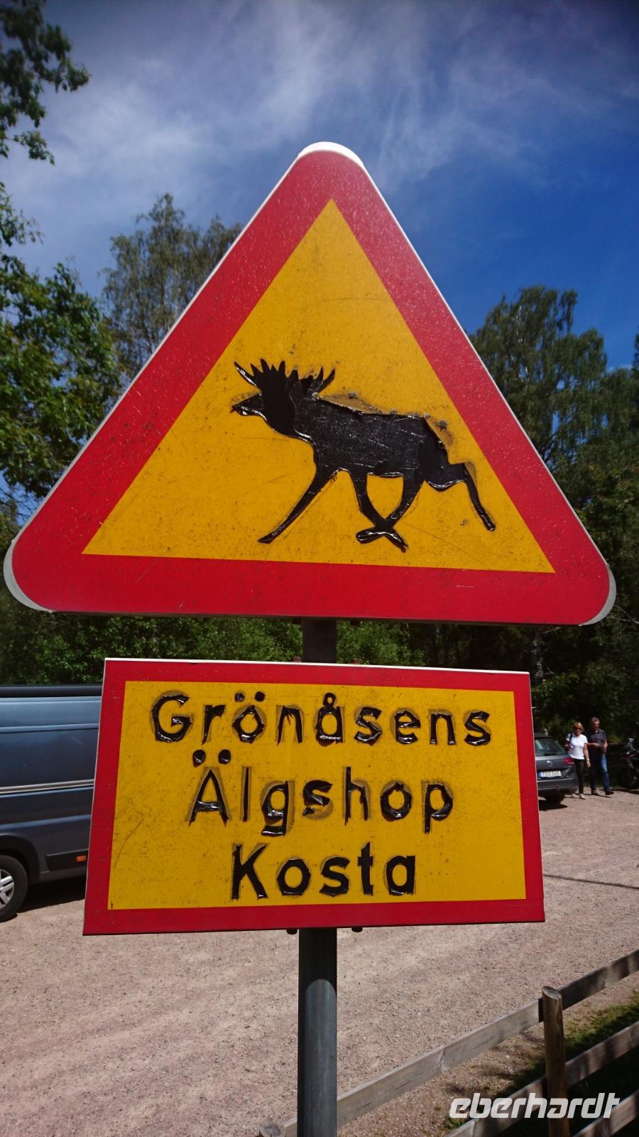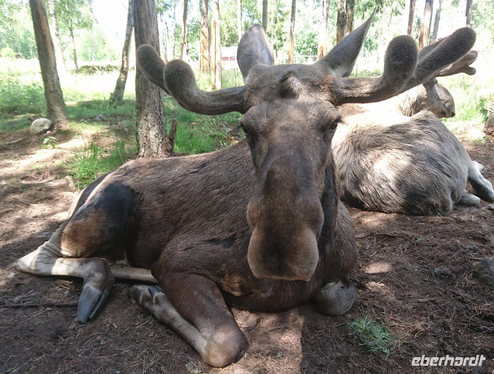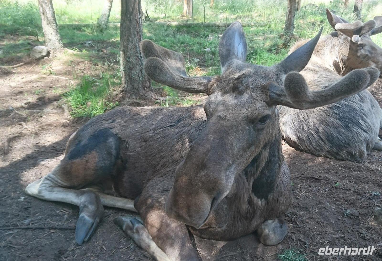 So fasziniert von der Fülle an Formen und Farben der unzähligen Glasobjekte brauchten wir eine Pause und die wollten wir im nahe gelegenen Elchpark verbringen. Dies ist ein Wildgehege, in dem eine Familie vor Jahren einige Elche aufgenommen hat und diese in großen Gehegen hält. Dieser Park erfreut sich großer Beliebtheit, schließlich hat man hier die 100prozentige Garantie, Elche in ihrer natürlichen Umgebung zu Gesicht zu bekommen. Wir hatten ganz besonderes Glück, die Männchen lagen direkt am Zaun keinen Meter vor uns und die Kühe hatten Jungtiere, die noch ganz ungelenk auf den Beinen versuchten, ihren Müttern hinterherzukommen.