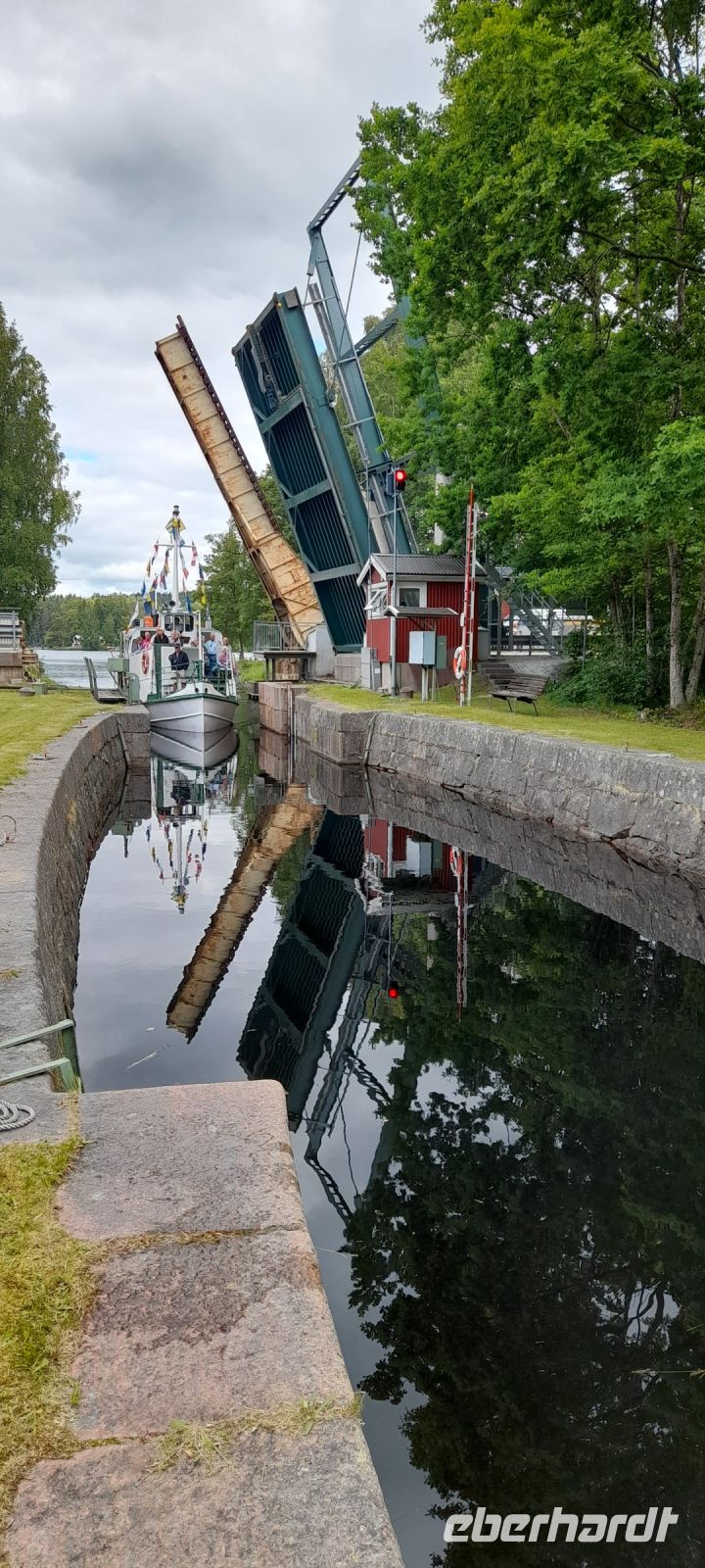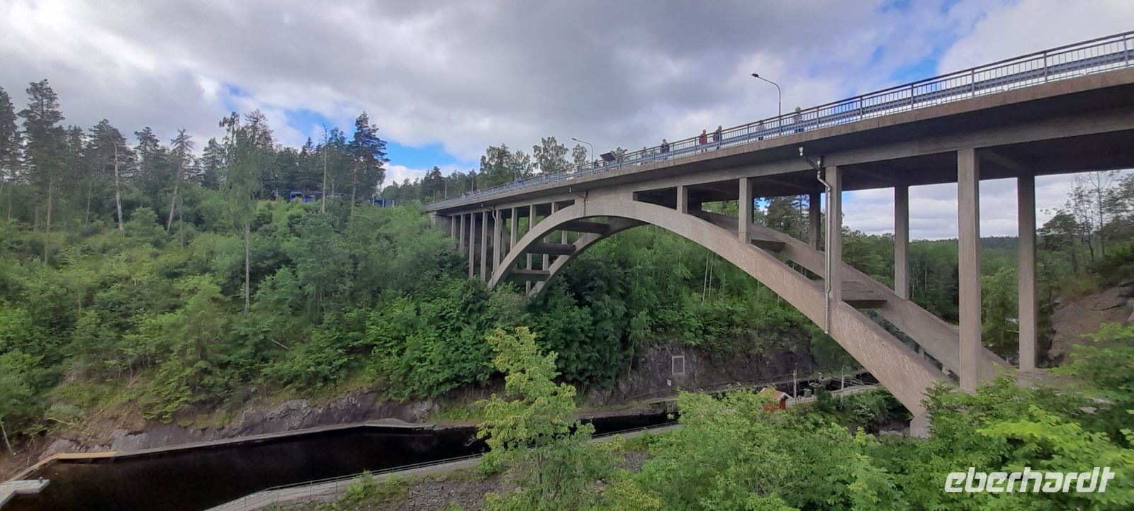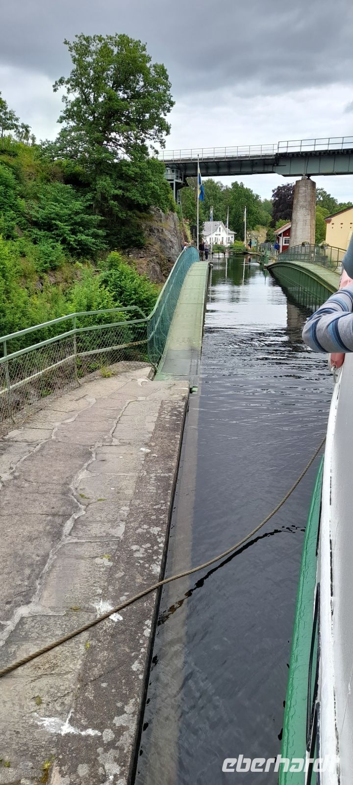 Am Morgen starten wir mit dem Bus nach Haverud und hier machen wir eine schöne Pause zum Fotografieren. Wir sehen das Aquädukt, welches mit einer schiffstauglichen Fahrrinne, die die Schlucht überspannt und noch zwei Schleusenkammern, die die Enden verbindet, ausgestattet. Eine technische Meisterleistung, erdacht vom Kanalbauingenieur Nils Ericsson. Einige Meter über der Schleuse verläuft seit 1925 eine gleichfalls eiserne Eisenbahnbrücke, um 1930 vervollständigte eine wiederum darüber erbaute Bogenbrücke aus Beton für den Straßenverkehr diese technische Kuriosität. Weiter geht unsere Fahrt im Bus bis Langbron, denn dort begeben wir uns an Bord der