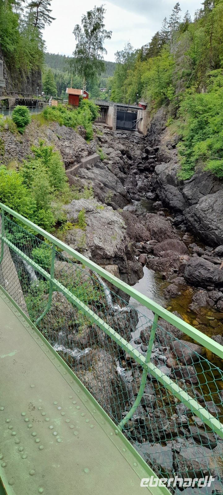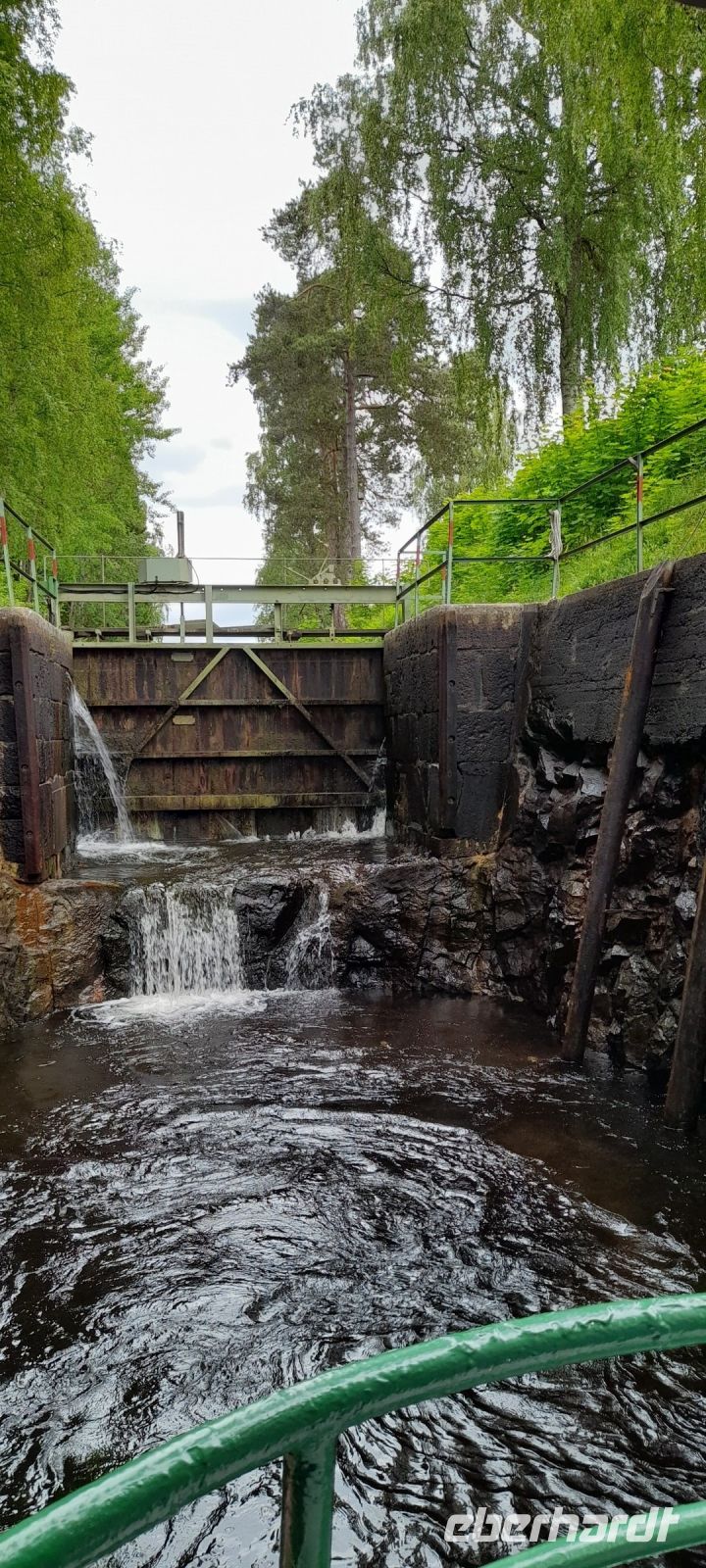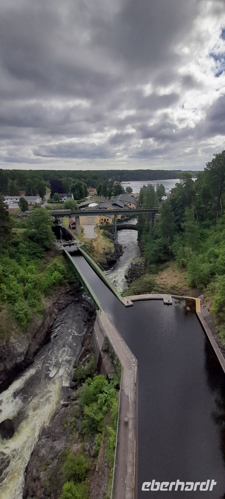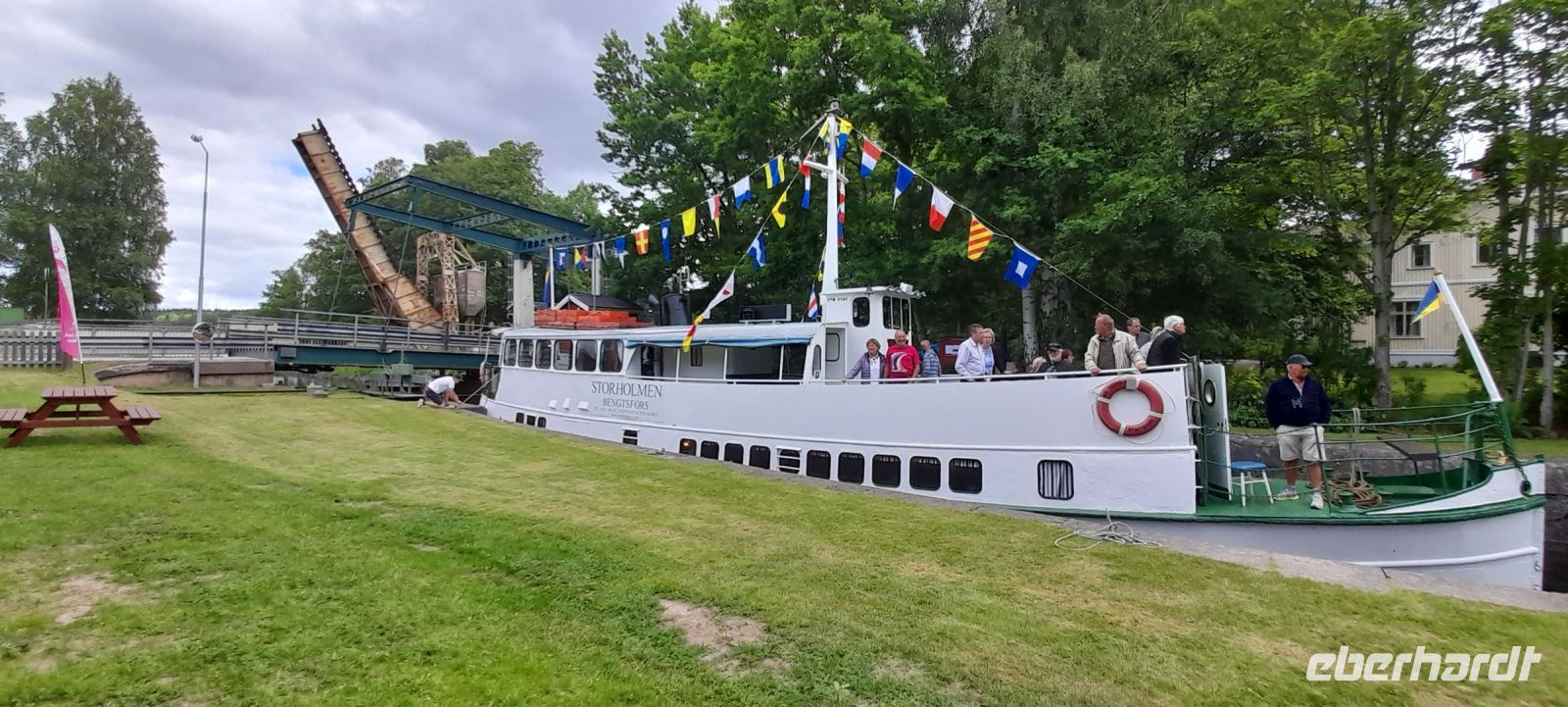 Am Morgen starten wir mit dem Bus nach Haverud und hier machen wir eine schöne Pause zum Fotografieren. Wir sehen das Aquädukt, welches mit einer schiffstauglichen Fahrrinne, die die Schlucht überspannt und noch zwei Schleusenkammern, die die Enden verbindet, ausgestattet. Eine technische Meisterleistung, erdacht vom Kanalbauingenieur Nils Ericsson. Einige Meter über der Schleuse verläuft seit 1925 eine gleichfalls eiserne Eisenbahnbrücke, um 1930 vervollständigte eine wiederum darüber erbaute Bogenbrücke aus Beton für den Straßenverkehr diese technische Kuriosität. Weiter geht unsere Fahrt im Bus bis Langbron, denn dort begeben wir uns an Bord der