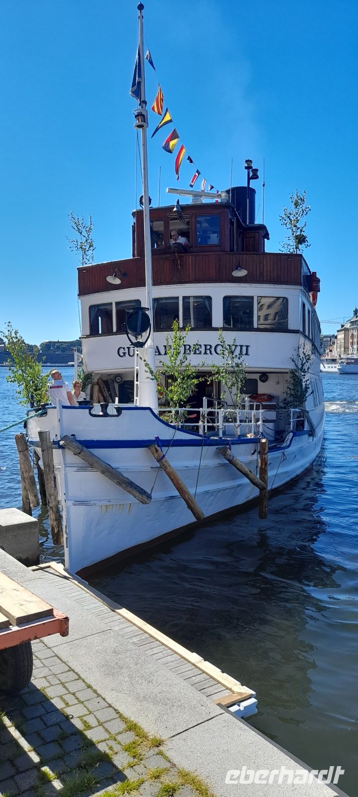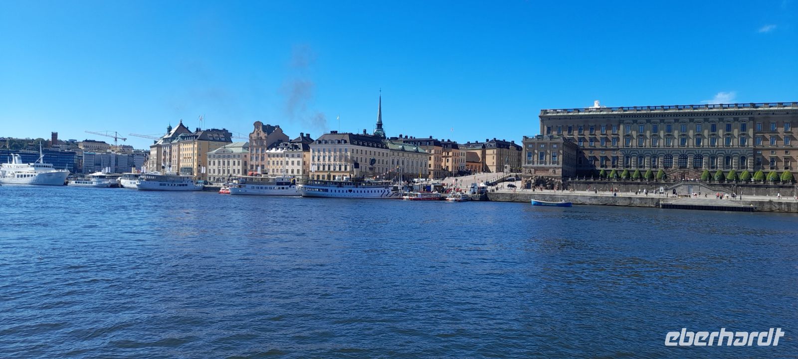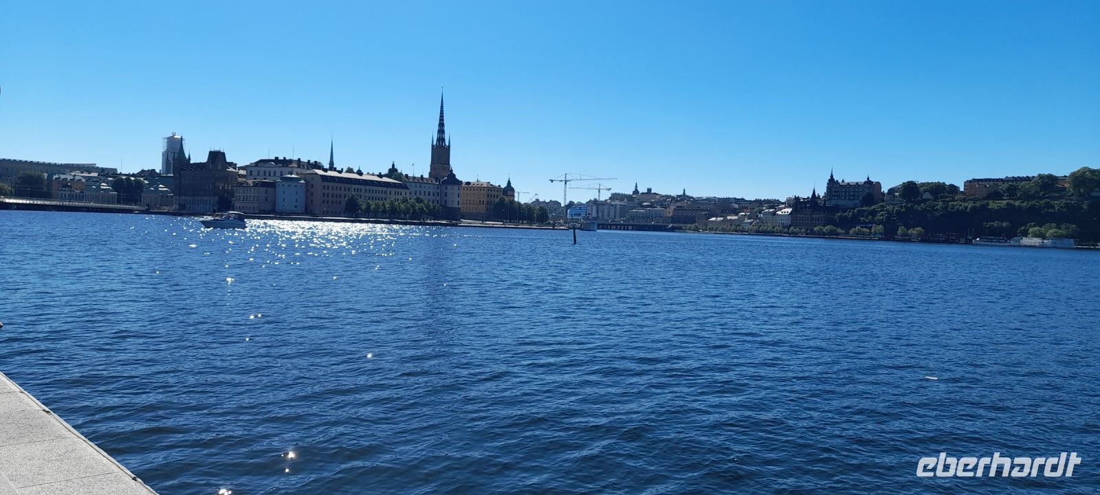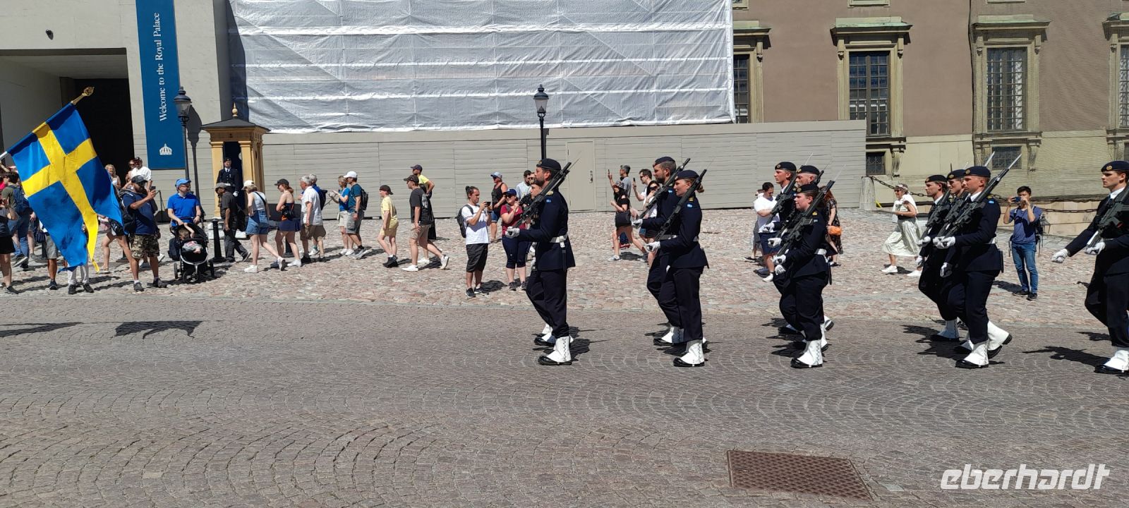 die mittelalterliche Altstadt zu Fuß zu erkunden. Am Schloss erleben wir zur Mittagszeit die Wachablösung mit Musik und alles bei traumhaftem, eher viel zu heißem Wetter. Stockholm erstreckt sich über 14 Inseln, die wiederum durch 57 Brücken miteinander verbunden sind. Wenige Reisegäste verbringen ihre Freizeit in der Altstadt. Mit fast allen Reisegästen fahren wir hinüber zur Insel Djurgarden