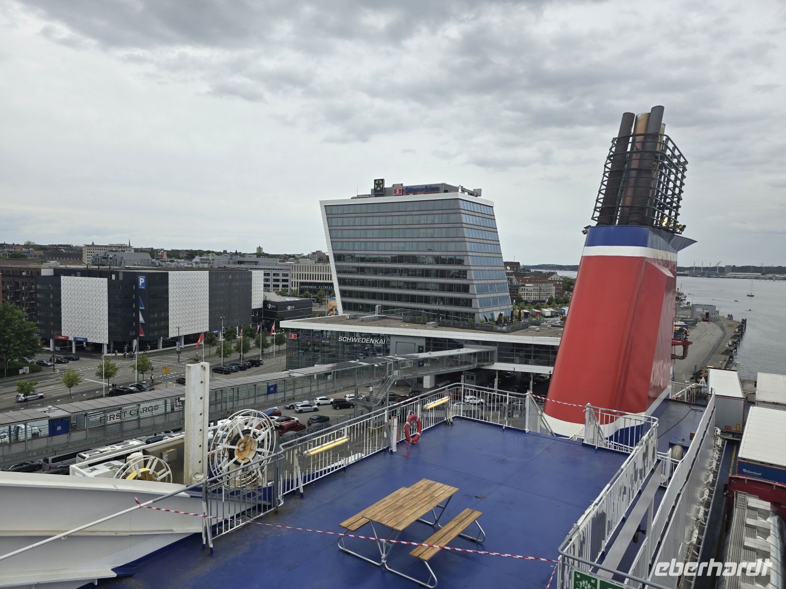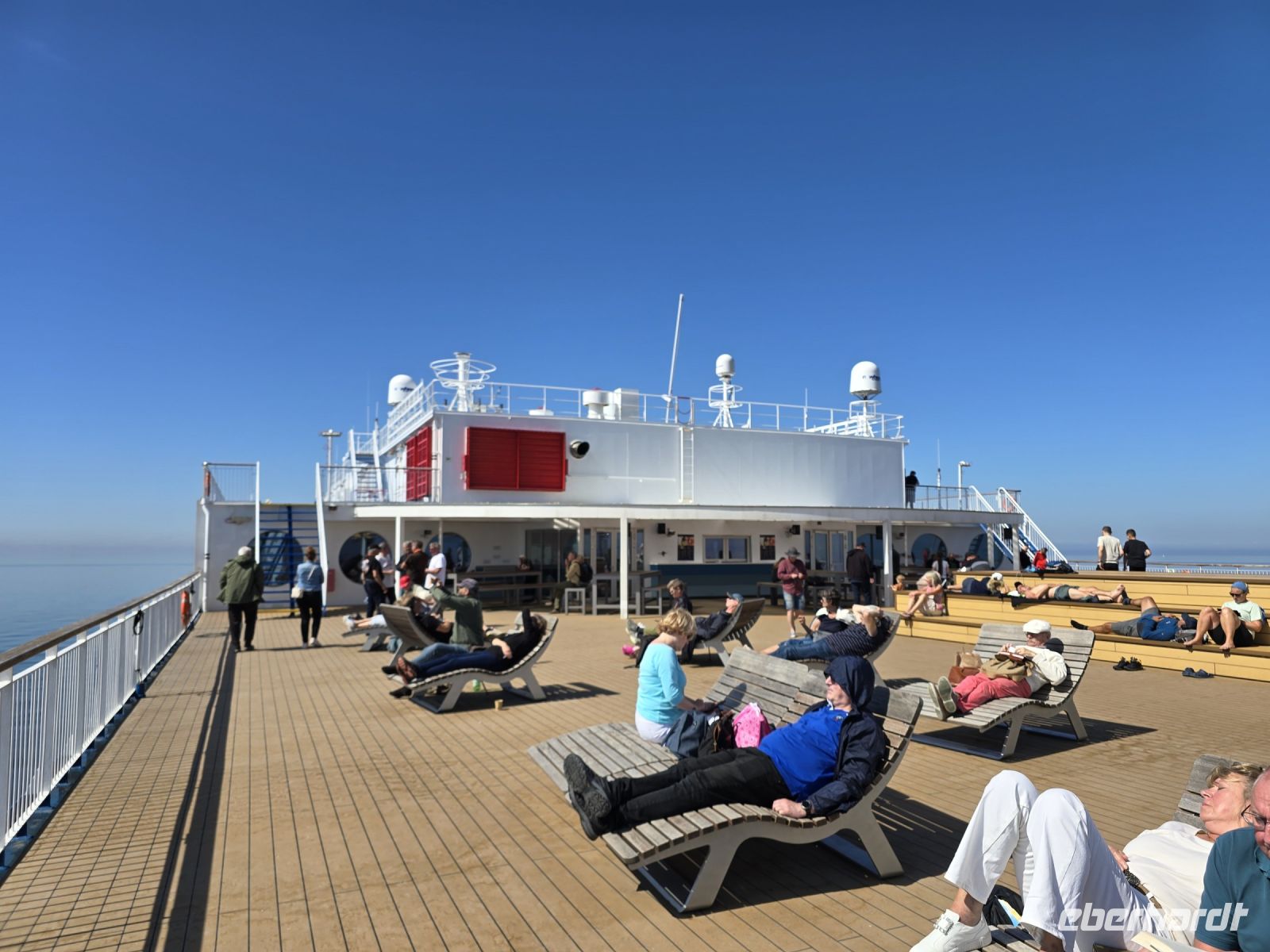 Am frühen Morgen, noch ohne Frühstück, brechen wir auf um die Fähre von Trelleborg nach Rostock zu erreichen. Bei der TT-Line Fähre ist alles auf den Fahrzeugbetrieb ausgelegt. Auch wir Reisegäste fahren zusammen mit dem Reisebus in eines der Garagendecks der Fähre. Über ein Treppenhaus kommen wir nach oben zu den Restaurantdeck und zum Außendeck.