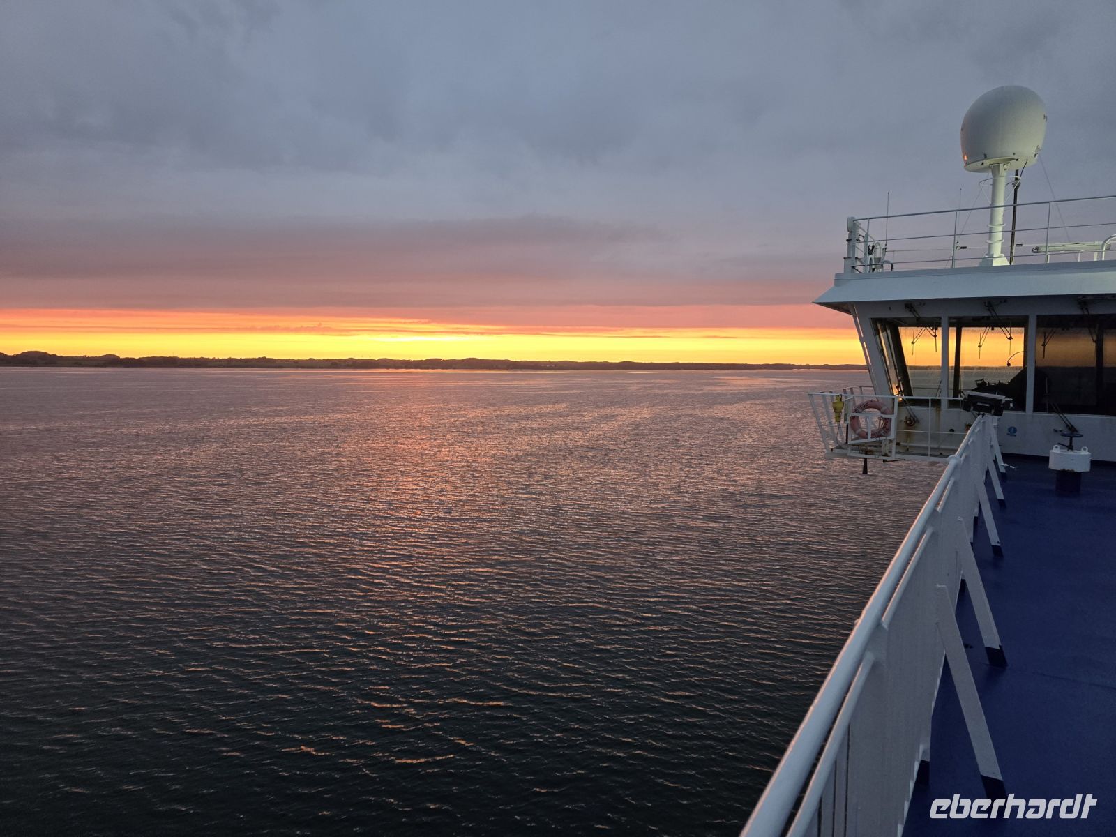 Am Nachmittag um 16:00 Uhr wollen wir auf die Göteborg Fähre in Kiel einchecken. Wir starten unsere Busreise am frühen Morgen um 05:00 Uhr in Kesselsdorf am Betriebshof. Der Reiseleiter und 4 seiner Gäste haben die Nacht schon im Hotel verbracht und steigen gleich zu Beginn in den Bus. David, unser Busfahrer, ist das erste Mal auf dieser Tour unterwegs und hat auch schon eine gewisse Vorfreude auf Schweden. Gleichzeitig mit unserer Reisegruppe die sich auf eine romantische Schwedenreise freut, startet eine Radfahrergruppe die Schweden mit dem Fahrrad erkunden möchte. Gleichzeitig fahren wir zu weiteren Einstiegspunkten um jeweils unsere Gäste abzuholen. Wir fahren die selbe Stecke, selbe gleiche Autobahn hoch nach Kiel und begegnen uns hin und wieder auf den auf der Überholspur und entwickeln eine kleine Freude wenn wir uns gegenseitig überholen. Da unsere Reise eine größere Reisegruppe beherbergt, kommen wir etwas später in Kiel an und steigen gemeinsam mit der Radfahrergruppe auf die Fähre nach Göteborg. Wir haben eine sehr schöne Überfahrt nach Göteborg mit einem leuchtend orangenen Sonnenuntergang und einem üppigen Fisch/Fleisch/sonstiges Buffet zum Abendessen, das ist eine gute Einstimmung auf Schweden.