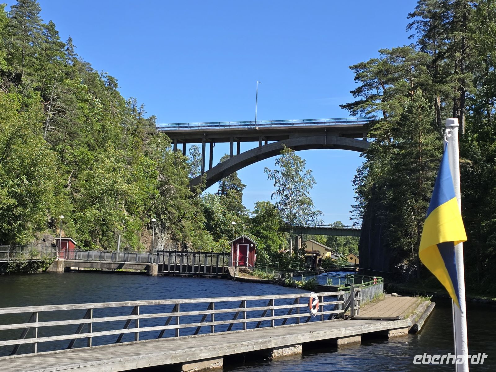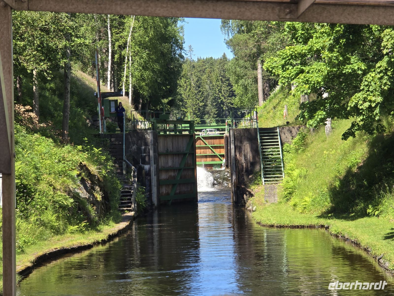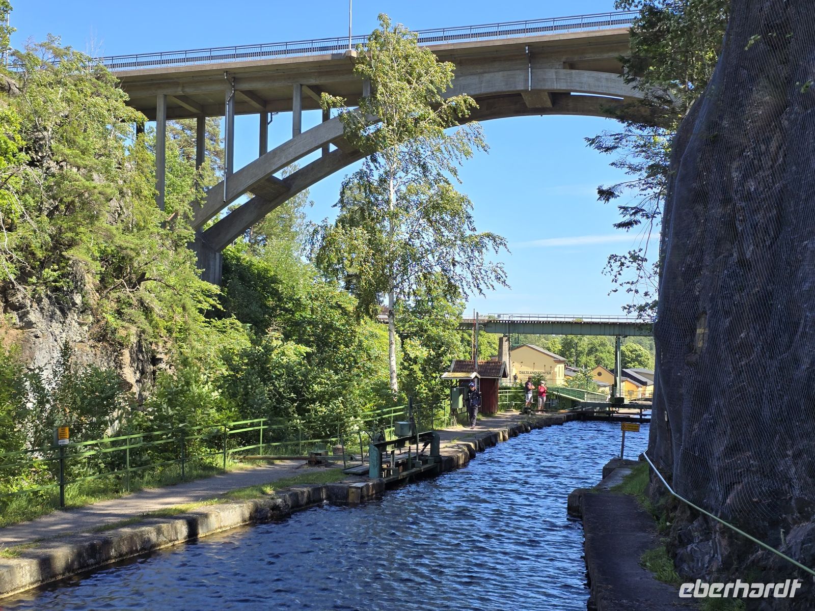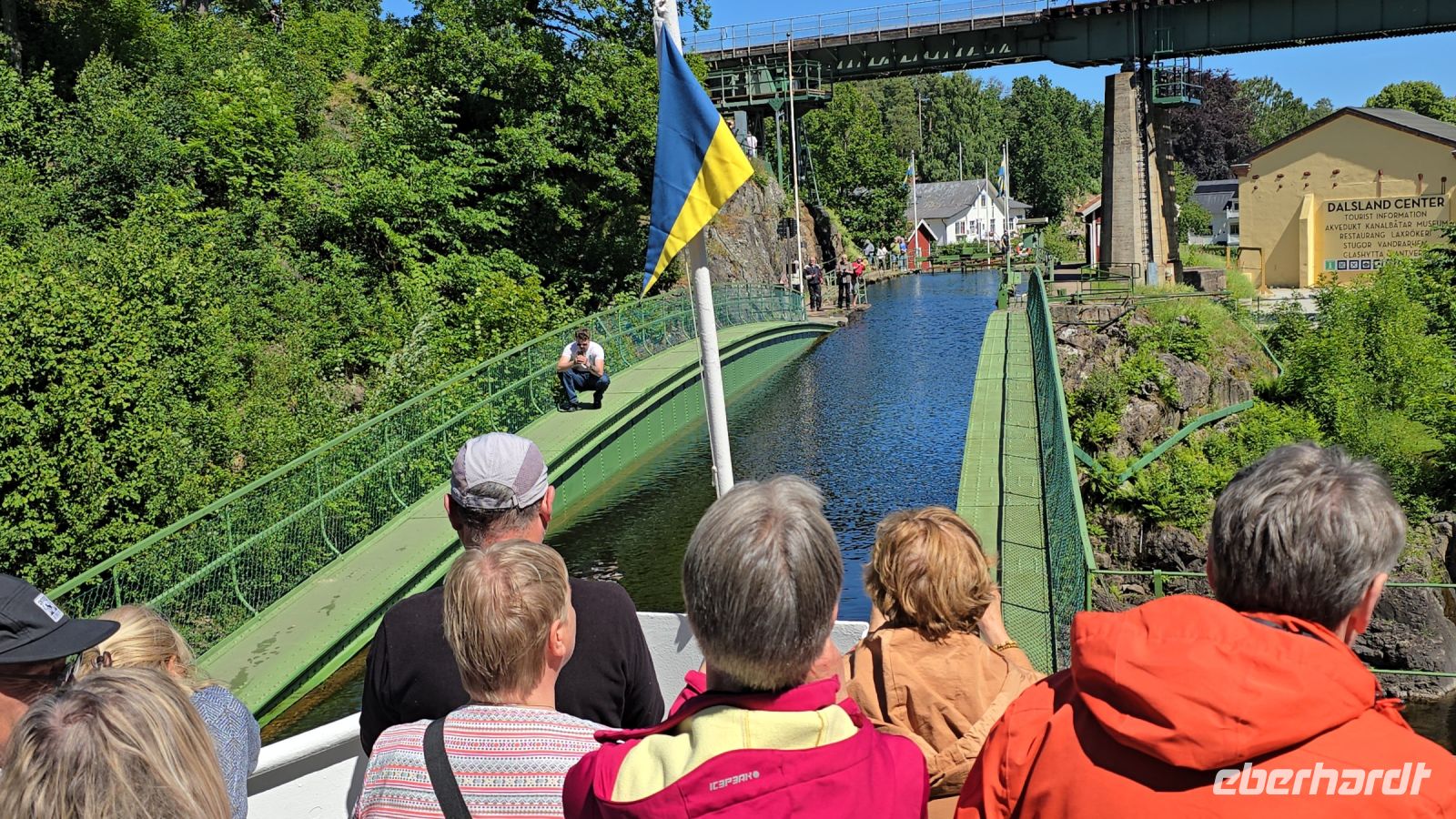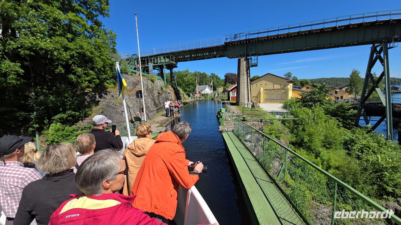 Gleich heute steht ein kleines Highlight auf dem Reiseprogramm. Wir wollen eine Fahrt auf dem Dalslandkanal unternehmen und fahren mit dem Bus erstmal Richtung Mellerud und machen einen Stopp in Haverod. Hier befindet sich eine spektakuläre Kreuzung mehrerer Transportmittel. Auf 3 Ebenen überqueren der Dalslandkanal, eine Eisenbahnlinie und eine Landstraße ein Tal und einen kleinen Fluss. Der Kanal wird dabei mit einer Trogbrücke über die Schlucht geführt, wobei wiederum die Trogbrücke unter der Eisenbahnbrücke verläuft. Eine spektakuläre Installation die wir hier erstmal auf unsere Fotos bannen bevor wir am Nachmittag selbst mit dem Dalsland Schiff über den Trog fahren werden. Jetzt fahren wir noch eine halbe Stunde den Kanalaufwärts bis wir zu unserer Einstiegsstelle an der Brücke Longborn kommen. Bei einem Cafehaus auf der vorgelagerten Wiese, warten wir auf unser Kanalboot das sich ankündigt durch das Hochziehen der Straßenbrücke, bevor es selbige passiert und zu uns an die Anlegestelle kommt. Nachdem unsere Gruppe eingestiegen ist durchqueren wir eine mehrstufige Schleuse und sind direkt beteiligt bei einen aufwendigen Schleussen Manöver. Oft ist nur ein handbreiter Platz zwischen der Schleusenkammer und unserem Schiff so dass der Captain mit großem Geschick das Boot in der Mitte der Schleuse halten muss. Gleich neben der Wasserrinne, dem Kanallauf, ist alles grün bewachsen, saftige Wiesen und bemooste Felsen begleiten unsere Fahrt auf dem Dalsland Kanal. Nach 3 Stunden erreichen wir das Aquädukt, dass wir heute Vormittag schon inspiziert hatten, nun schauen wir aber von dem Kanal heraus und beobachten das Manöver wie wir über Schleusen zur Trogrinne gelangen und schließlich in weitere Schleusen abgelassen werden, auf den dahinterliegenden See an dem wir anlegen um das Schiff zu verlassen.