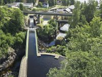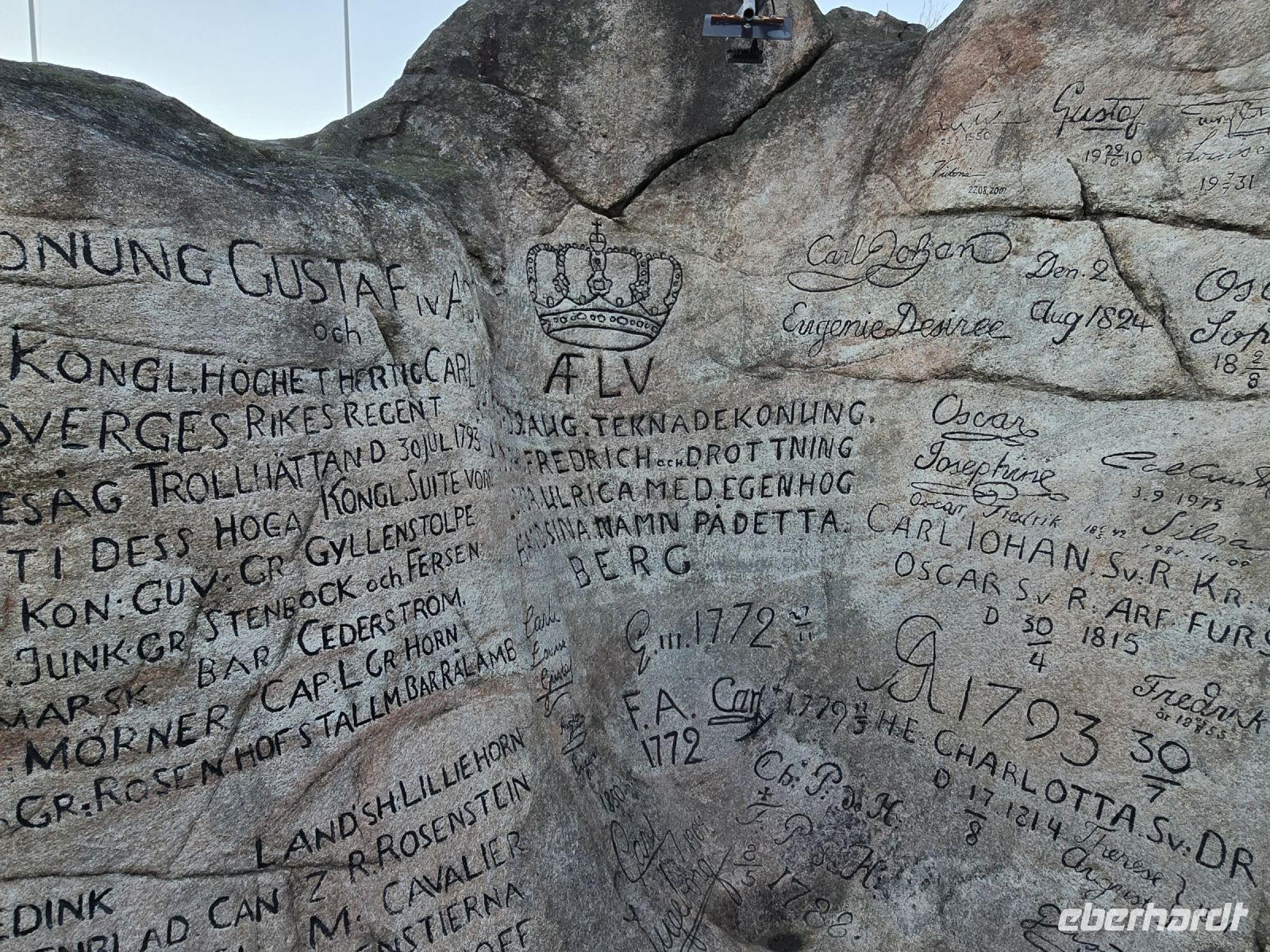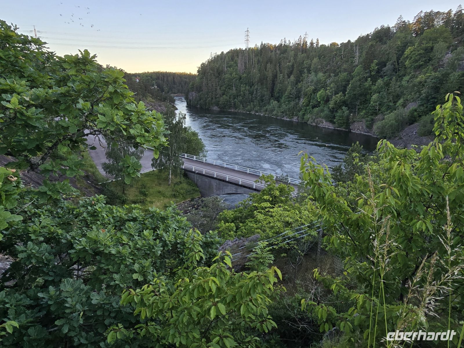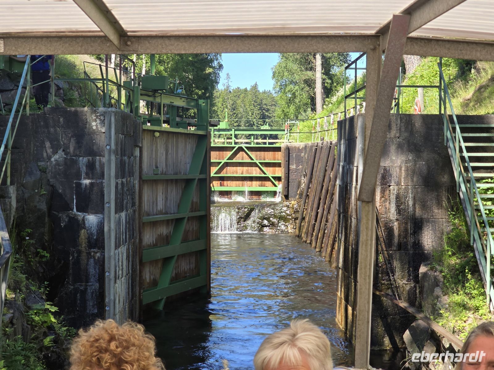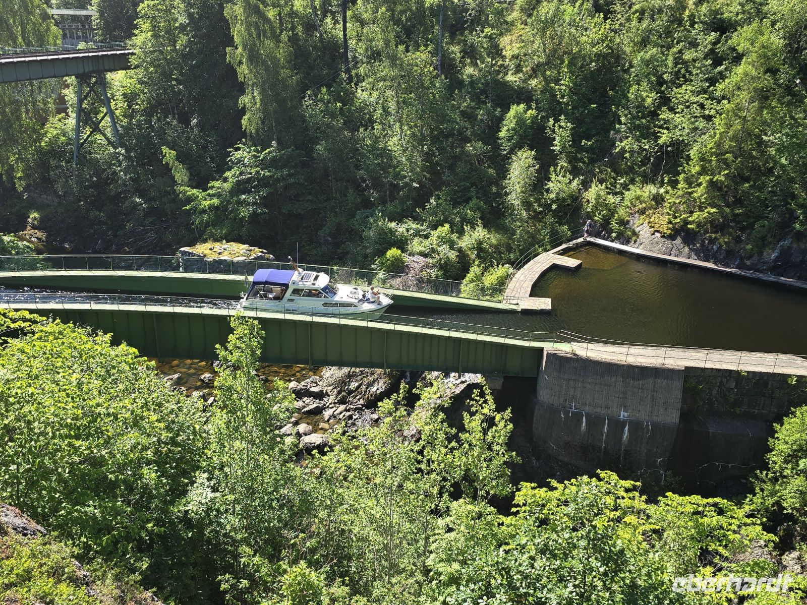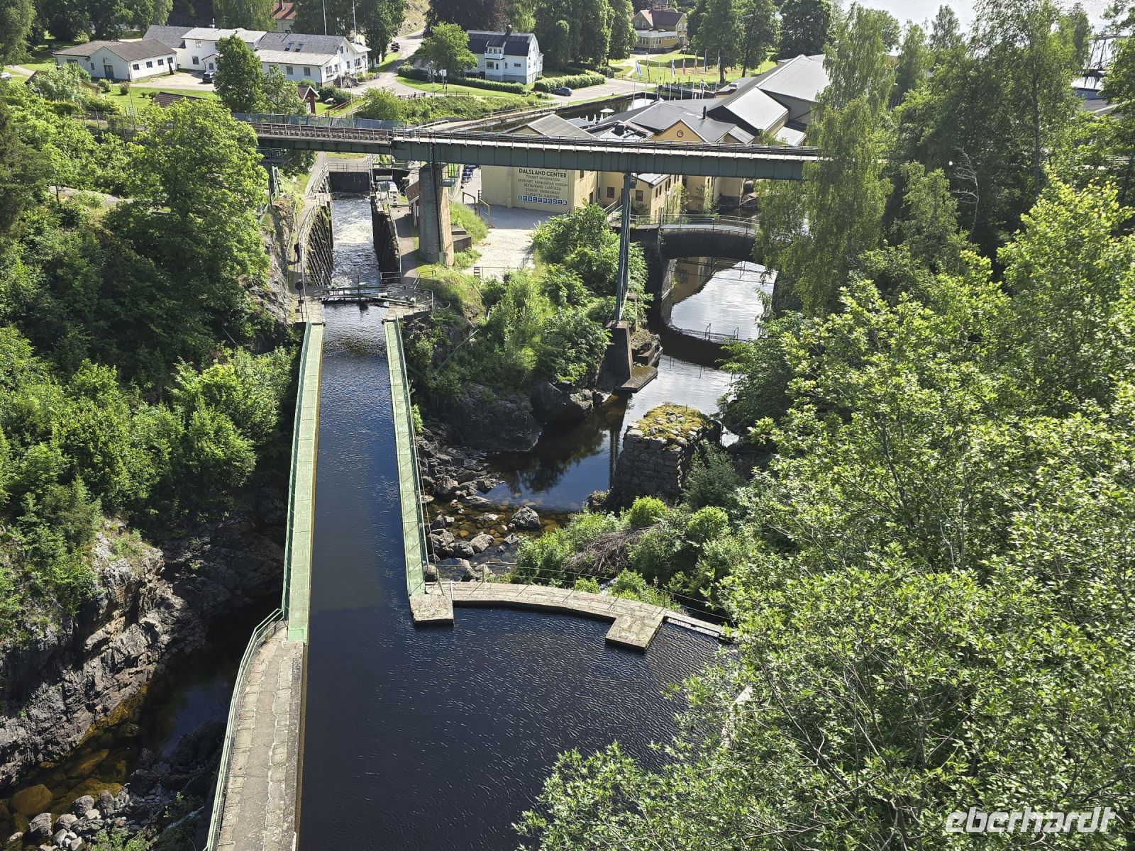 Gleich heute steht ein kleines Highlight auf dem Reiseprogramm. Wir wollen eine Fahrt auf dem Dalslandkanal unternehmen und fahren mit dem Bus erstmal Richtung Mellerud und machen einen Stopp in Haverod. Hier befindet sich eine spektakuläre Kreuzung mehrerer Transportmittel. Auf 3 Ebenen überqueren der Dalslandkanal, eine Eisenbahnlinie und eine Landstraße ein Tal und einen kleinen Fluss. Der Kanal wird dabei mit einer Trogbrücke über die Schlucht geführt, wobei wiederum die Trogbrücke unter der Eisenbahnbrücke verläuft. Eine spektakuläre Installation die wir hier erstmal auf unsere Fotos bannen bevor wir am Nachmittag selbst mit dem Dalsland Schiff über den Trog fahren werden. Jetzt fahren wir noch eine halbe Stunde den Kanalaufwärts bis wir zu unserer Einstiegsstelle an der Brücke Longborn kommen. Bei einem Cafehaus auf der vorgelagerten Wiese, warten wir auf unser Kanalboot das sich ankündigt durch das Hochziehen der Straßenbrücke, bevor es selbige passiert und zu uns an die Anlegestelle kommt. Nachdem unsere Gruppe eingestiegen ist durchqueren wir eine mehrstufige Schleuse und sind direkt beteiligt bei einen aufwendigen Schleussen Manöver. Oft ist nur ein handbreiter Platz zwischen der Schleusenkammer und unserem Schiff so dass der Captain mit großem Geschick das Boot in der Mitte der Schleuse halten muss. Gleich neben der Wasserrinne, dem Kanallauf, ist alles grün bewachsen, saftige Wiesen und bemooste Felsen begleiten unsere Fahrt auf dem Dalsland Kanal. Nach 3 Stunden erreichen wir das Aquädukt, dass wir heute Vormittag schon inspiziert hatten, nun schauen wir aber von dem Kanal heraus und beobachten das Manöver wie wir über Schleusen zur Trogrinne gelangen und schließlich in weitere Schleusen abgelassen werden, auf den dahinterliegenden See an dem wir anlegen um das Schiff zu verlassen.