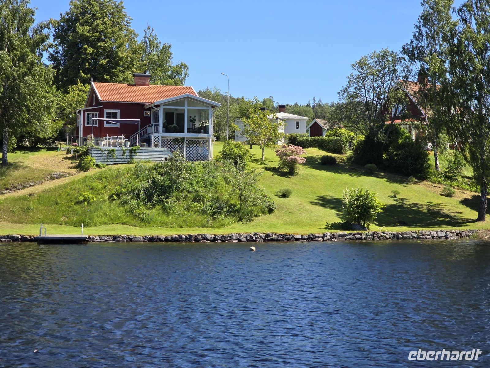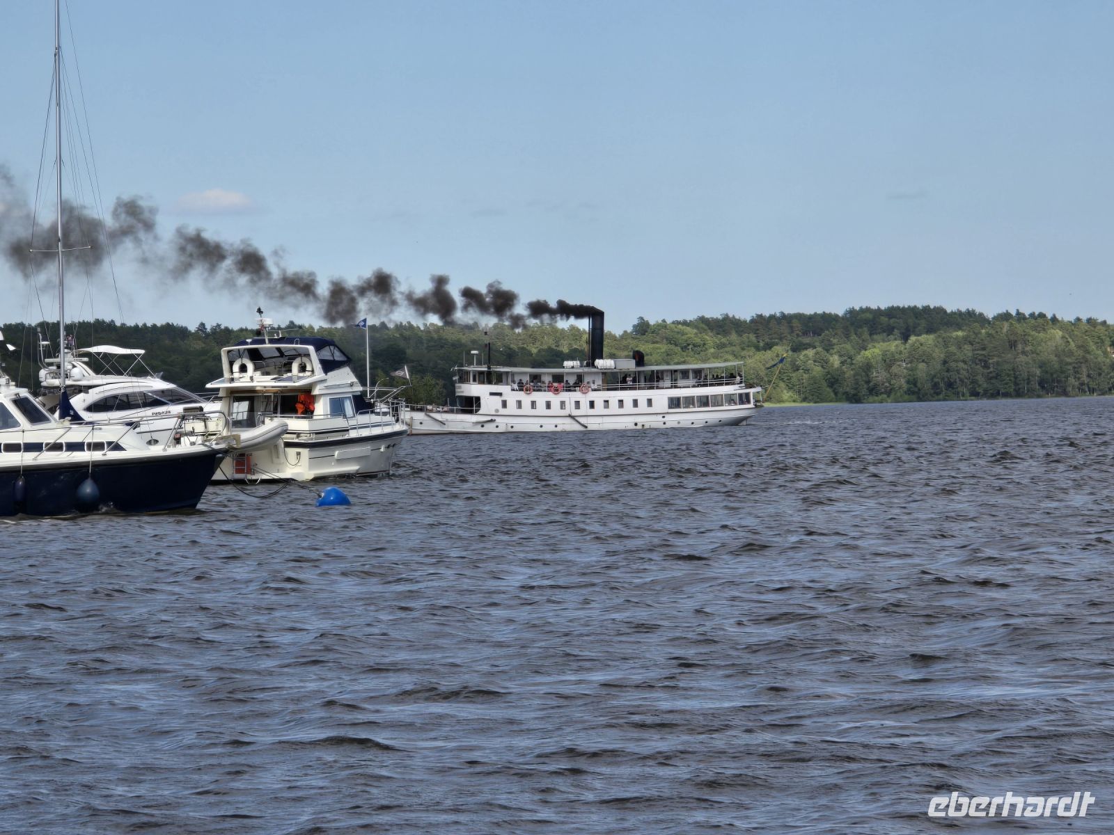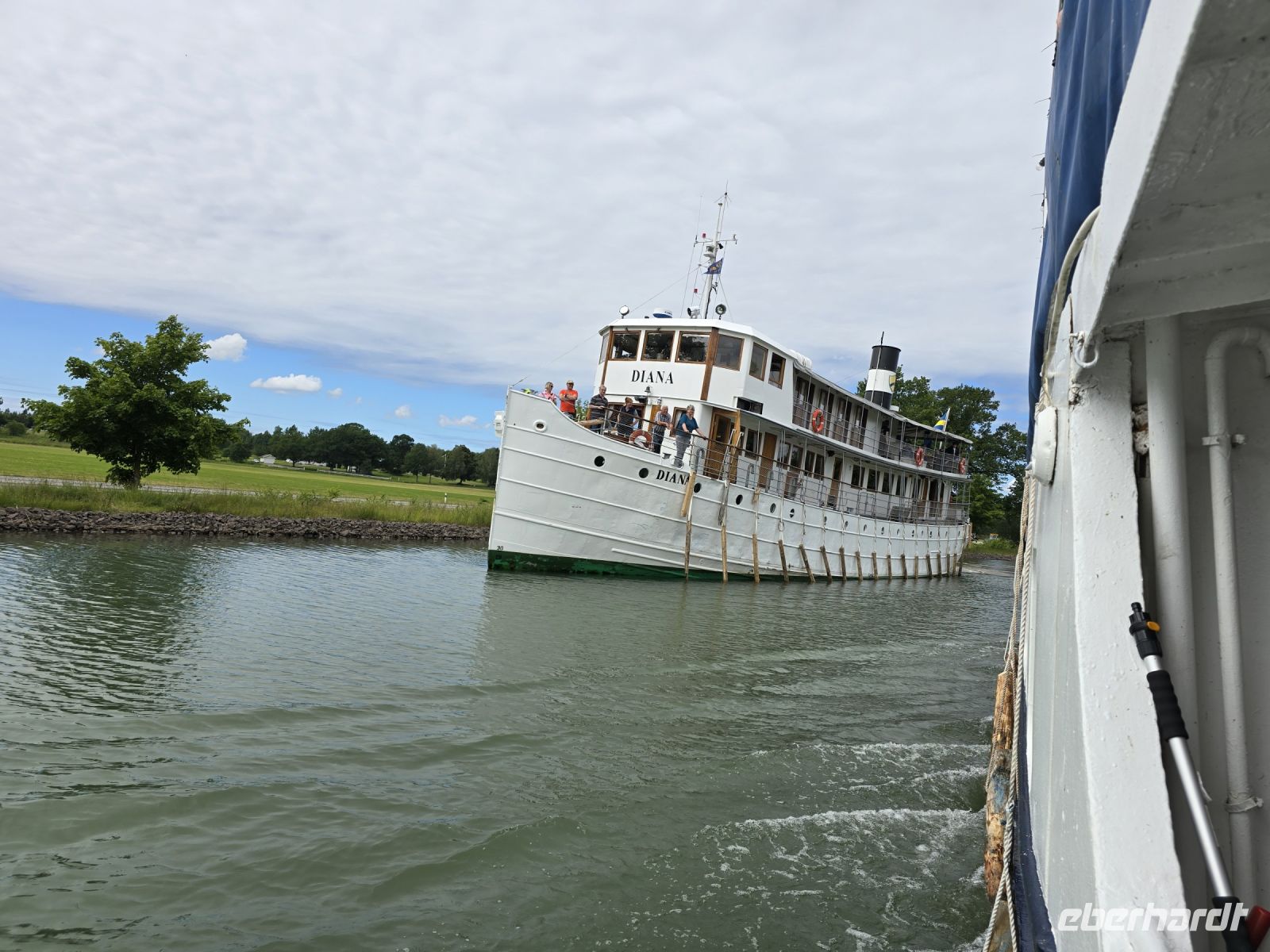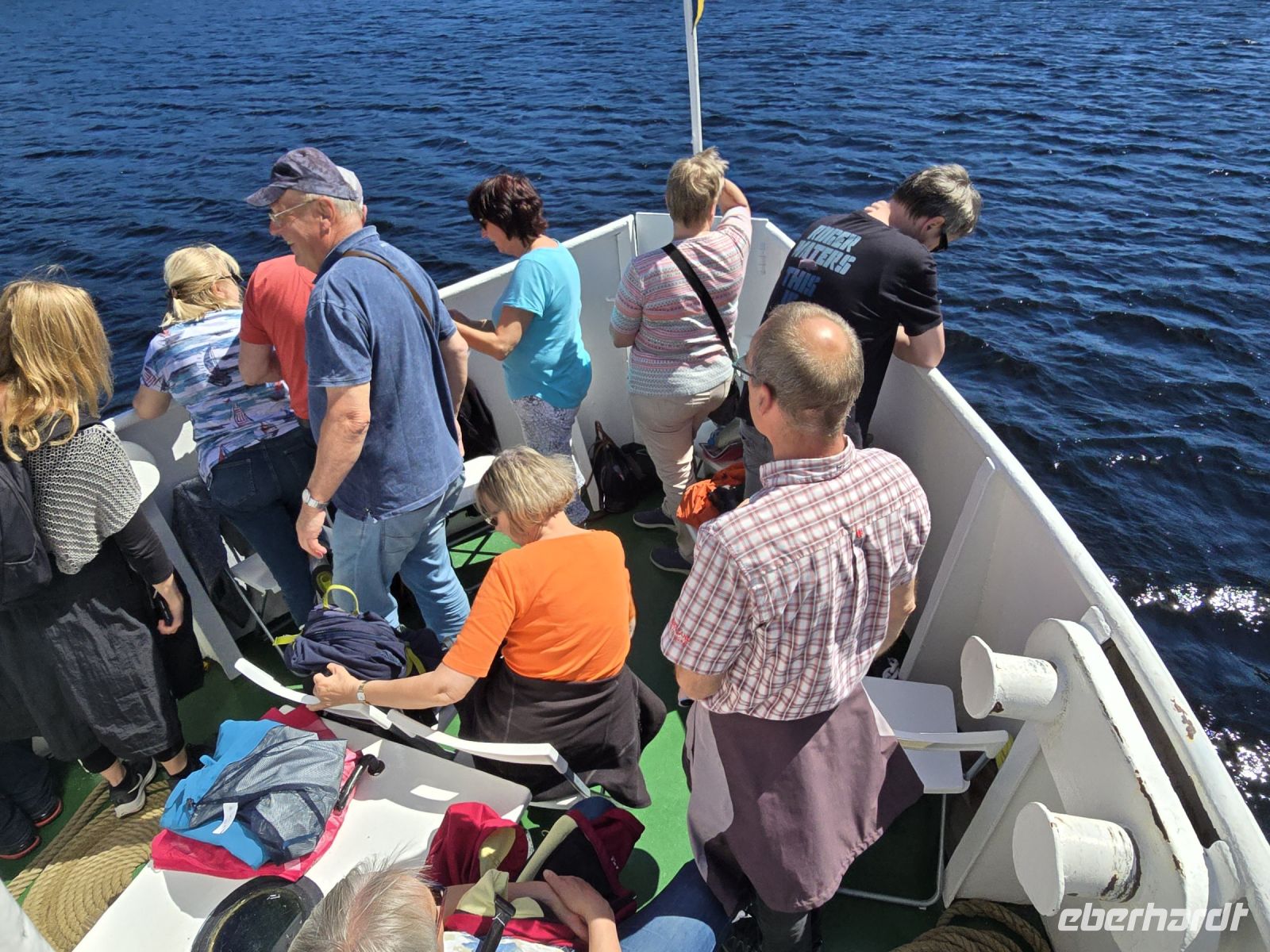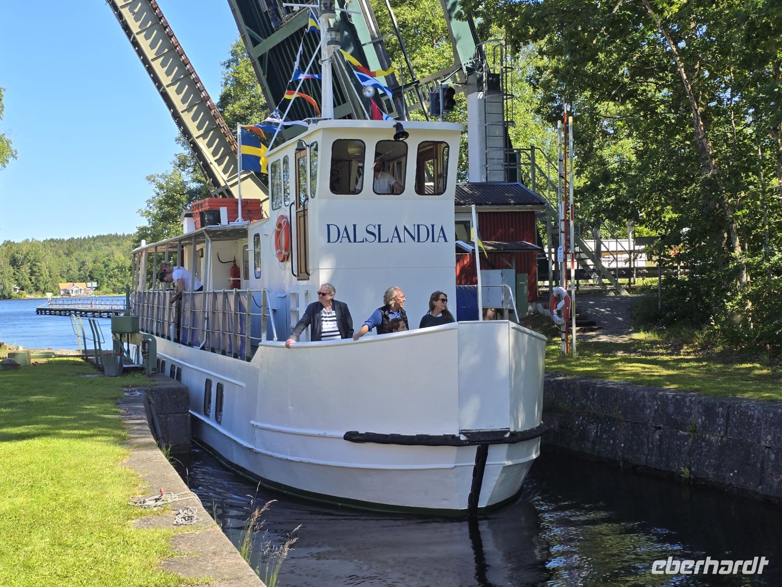 Kurz vor 10:00 Uhr gehen wir auf unser Schiff, die MS Leon, wir haben einen Bereich unter Deck für uns reserviert, aber bei diesem schönen Sonnenschein halten die meisten sich lieber am Oberdeck auf. Die Schleusen die wir durchfahren haben alle größere Steigungen zu überwinden als bei unserer Fahrt auf dem Dalslandkanal, hier werden wir schon 2 bis 3 Meter nach oben befördert, bevor wir die Schleusenkammer wieder verlassen. Immer wieder kommen uns kleinere Schiffe entgegen, der Kanal ist breit genug, dass wir aneinander vorbeikommen. Jedoch plötzlich steht das Große Kreuzfahrtschiff Diana vor uns, jetzt müssen wir ausweichen und am Rand warten bis das große Schiff passiert hat. Jedes Mal, wenn wir einem Schiff begegnen wird heftig gewunken, wir freuen uns dass wir diese Fahrt mit den anderen teilen können. Nach zirka dreieinhalb Stunden kommen wir in Borensberg an, fahren an dem schönen Göta Hotel vorbei, nehmen noch eine letzte Schleuse und unterfahren eine Hebebrücke und dann sind wir schon an der Anlegestelle um auszusteigen. Unser David hat den Bus für alle sichtbar, schon in Position gebracht und die Würstchenküche angeheizt, denn die meisten von uns hatten zuvor eine Portion heiße Würstchen bestellt die jetzt den Mittagshunger stillen sollen. Wir setzen uns noch etwas an den Kanal, lassen noch einige Schiffe vorbeifahren und setzen dann unsere Reise fort in Richtung Växjö.
