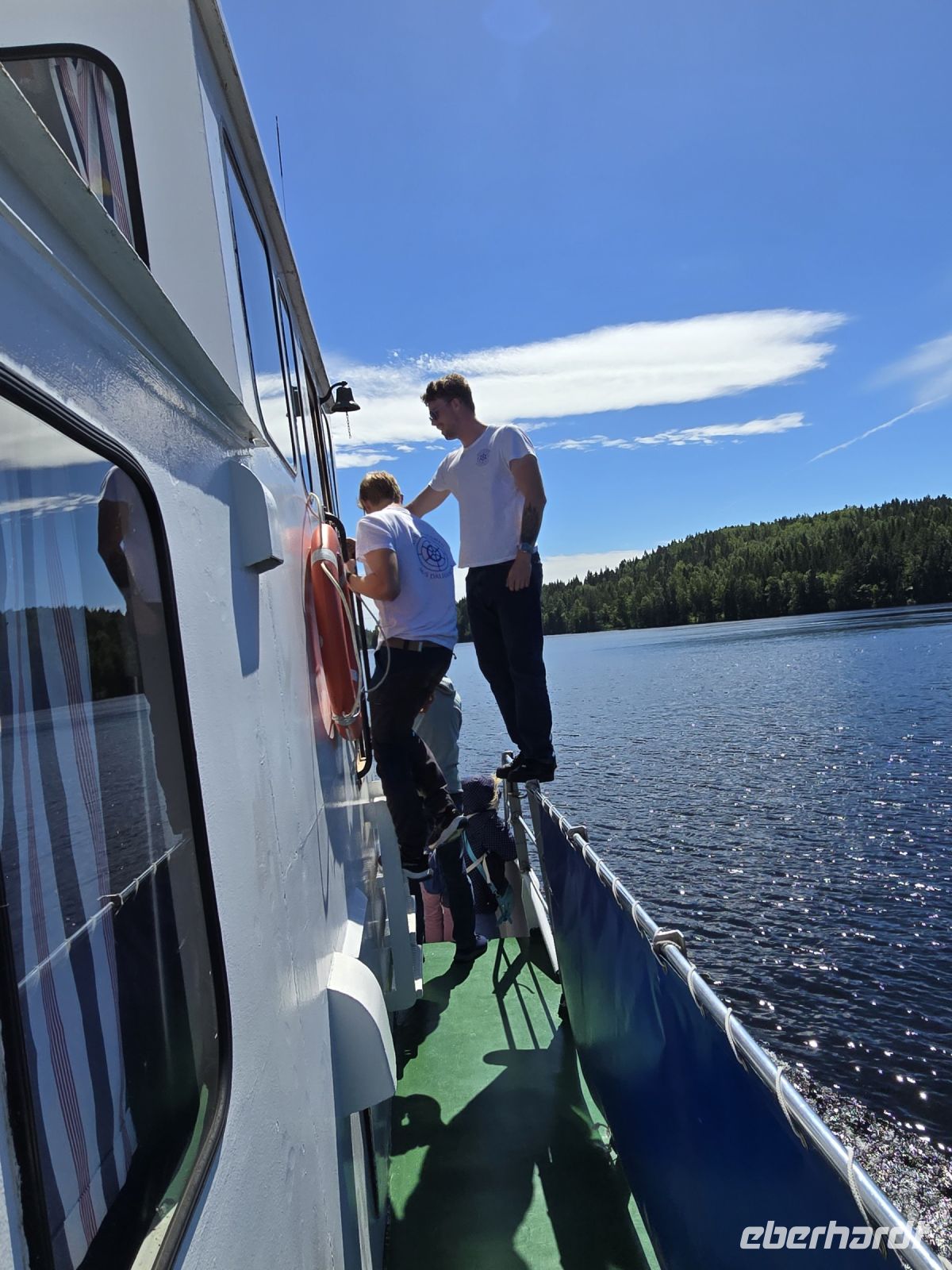 An der Anlegestelle verlassen wir das Schiff, steigen den Weg empor, wo David schon auf uns wartet und in der Bordküche heiße Würstchen für uns vorbereitet hat. Nach einer kleinen Stärkung verlassen wir den Parkplatz und machen uns auf den Weg nach Süden in Richtung des Vänern See.