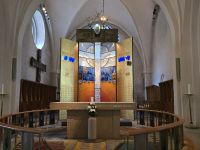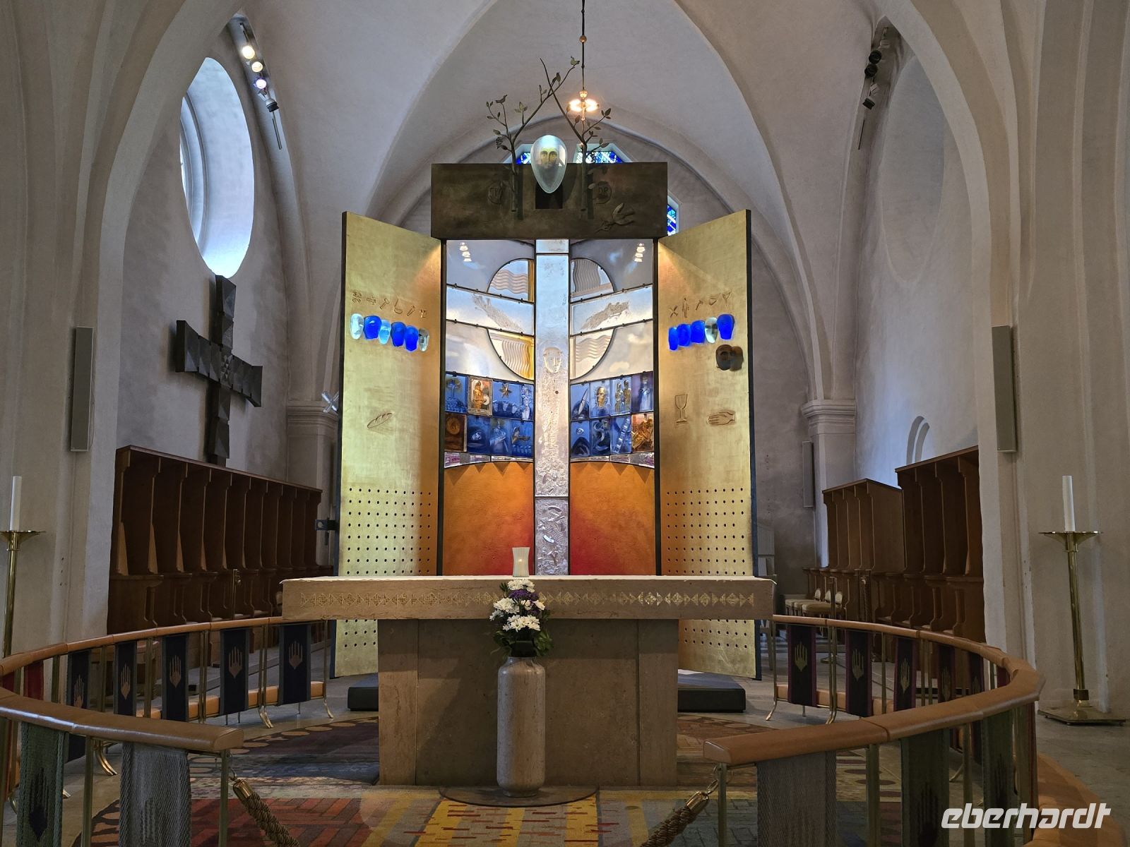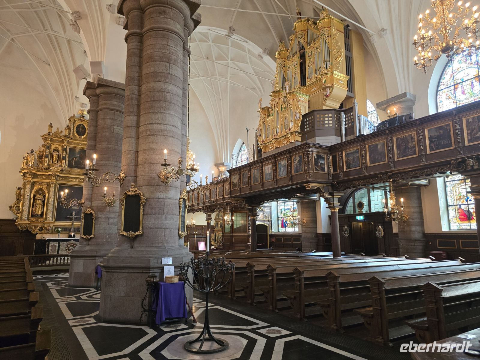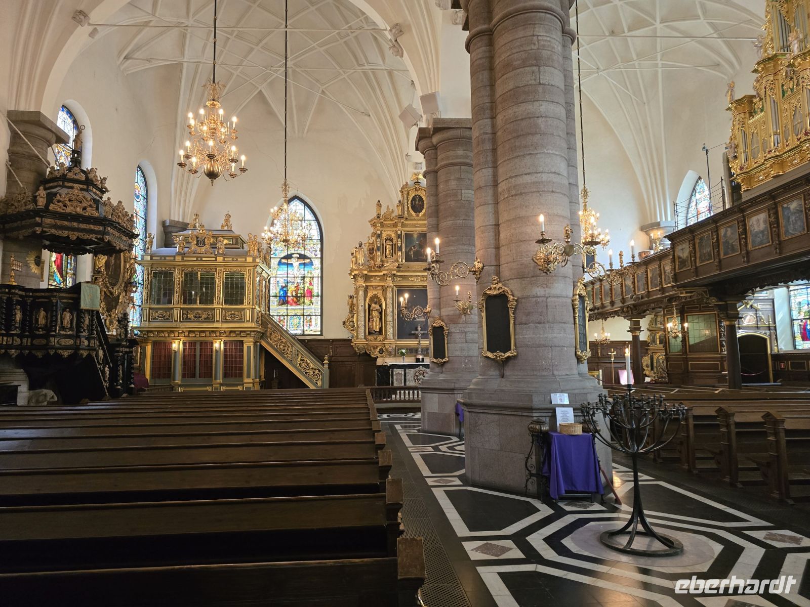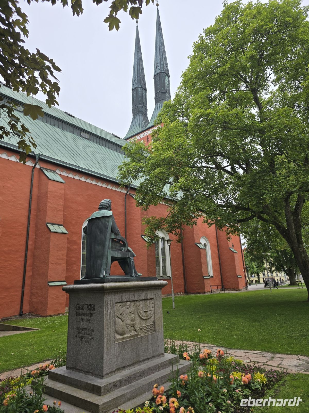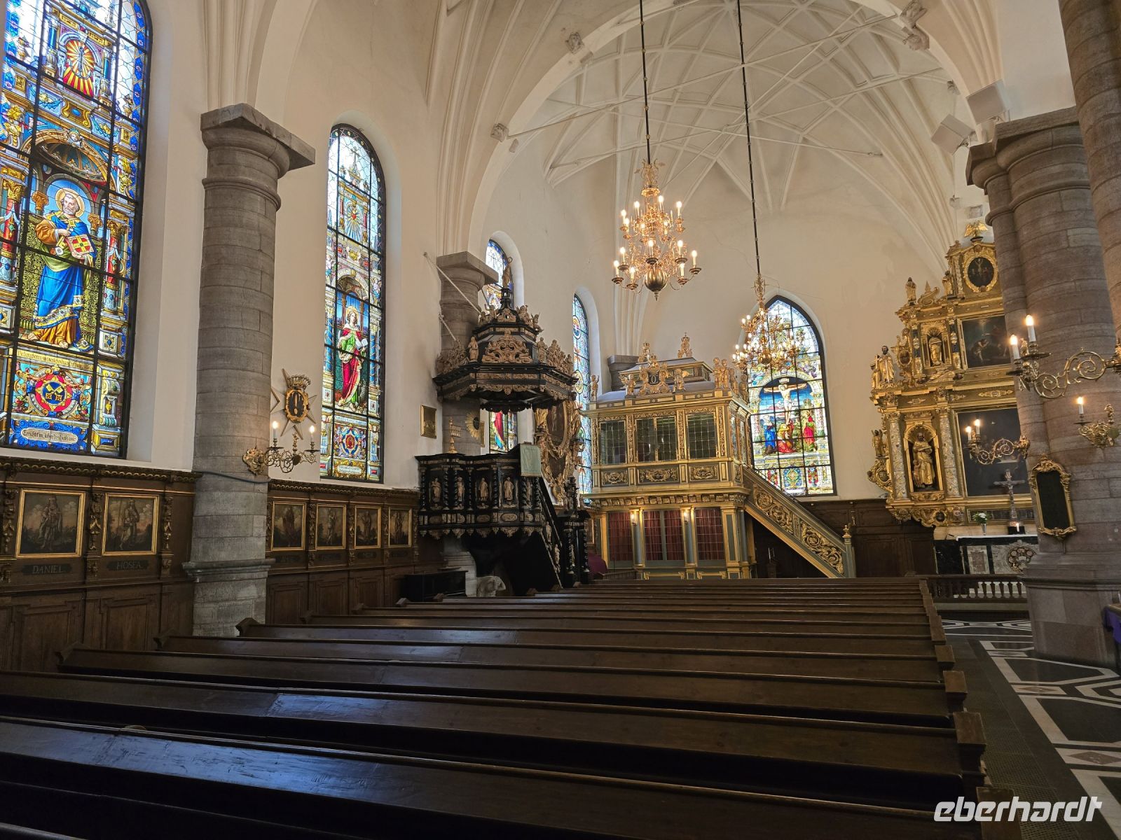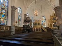 Heute Morgen erkunden wir erstmal die Stadt Växjö zu Fuß. Wir gehen erstmal nach dem Frühstück durch die Fußgängerzone bis hin zur Domkirche. Diese Kirche wurde im 12. Jahrhundert von einem Bischof gegründet und wurde auch bald Ziel für die Pilger. Durch die Pilger kam Geld in die Kirchenkasse, und es konnte im 14. Jahrhundert ein Dom gebaut werden. Nach dem der Dom mehrmals abgebrannt und von den Dänen zerstört wurde, und mehrmals wieder neu aufgebaut wurde kam es 1960 zu einer Komplettrenovierung, wobei der originale Zustand wieder hergestellt wurde. Das Innere wurde neugestaltet und 1995 eröffnet. Der wunderschöne Glasaltar stammt aus dem Jahre 1959 und hat eine herrliche Ausstrahlung über das gesamte Kirchenschiff. Weitere Kunstwerke sind der ‚Baum des Lebens‘, ein Taufbecken aus Glas und Stein und ein Altarteppich. Alle Kunstwerke sind jüngeren Datums, aus dem 20.Jahrhundert.