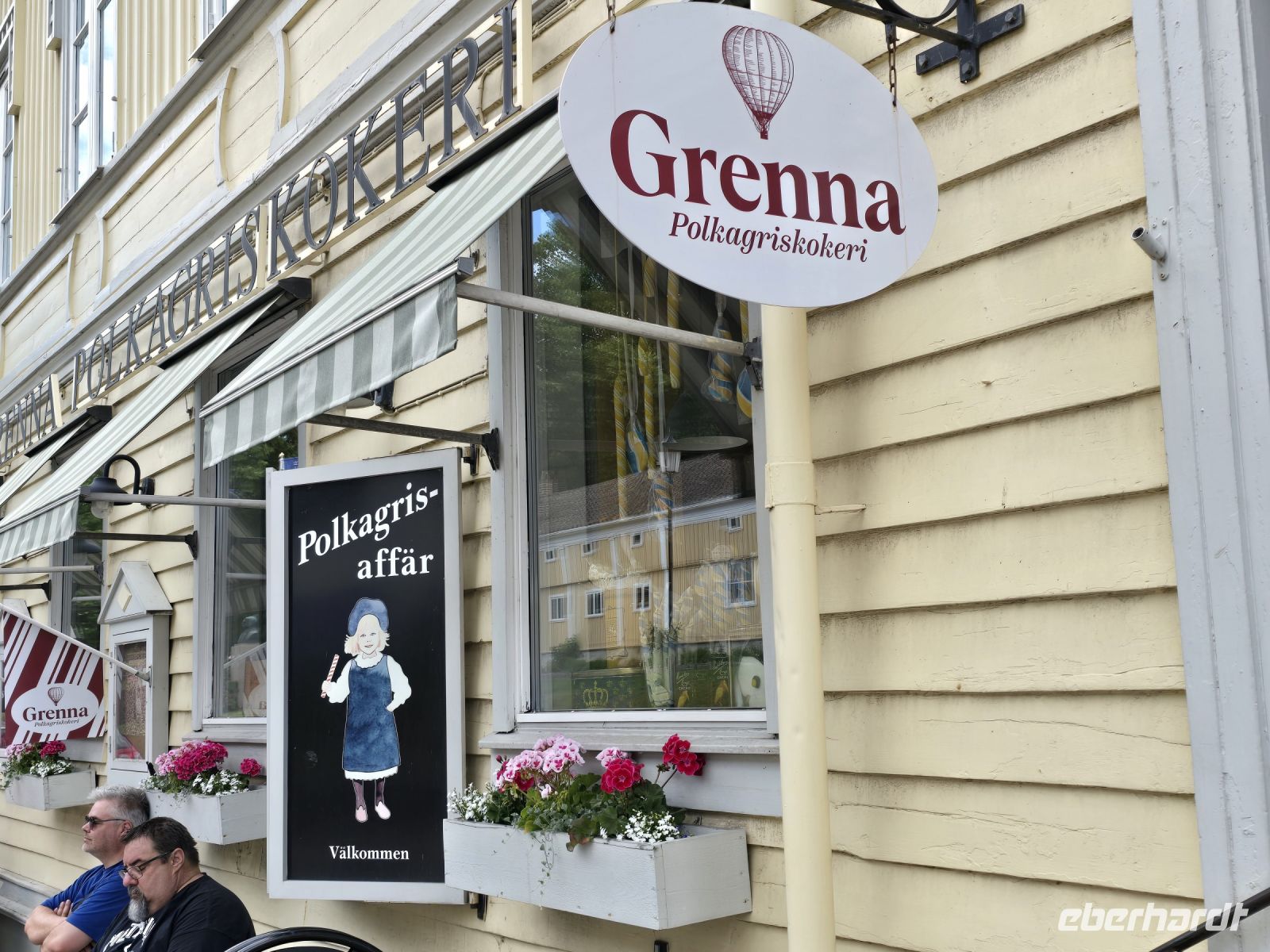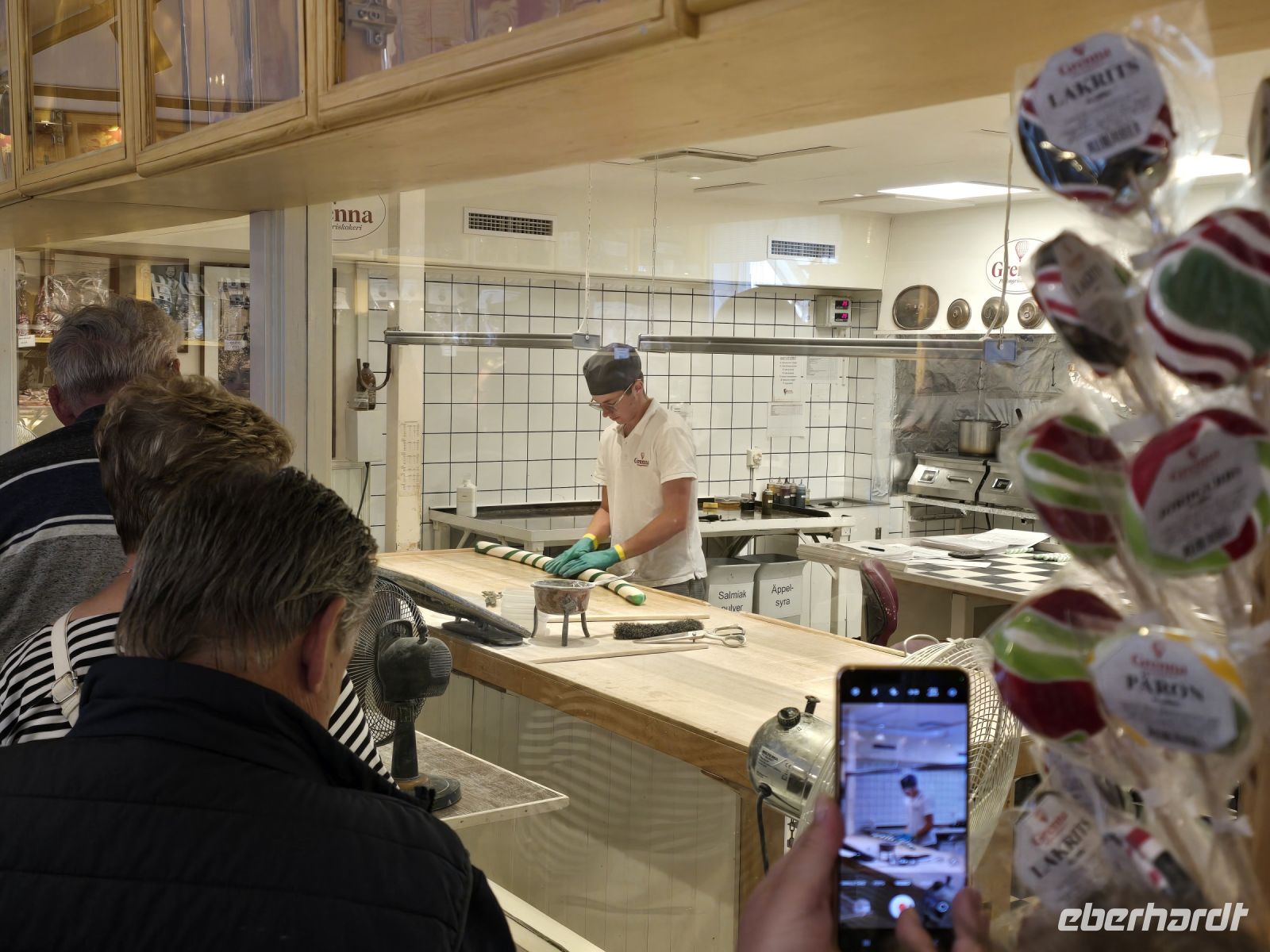 Auf dieser Strecke kommen wir am Vättern See vorbei, und machen einen Stopp in dem kleinen Städtchen Gränna. Hier dreht sich alles um die Zuckerstangen die sogenannten Polkagries. Nach dem vor 130 Jahren die Witwe Eriksson diese leckeren Zuckerstangen erfunden hat, produziert nun fast die ganze Stadt diese Leckereien. Aber wir haben uns mit der Original Zuckerbäckerei verabredet und lassen uns die Produktion dieser Polkagries Stangen präsentieren. Es ist beeindruckend mit welcher Sicherheit die Bäcker die Zuckermasse kneten, formen, drehen und jeder Handgriff an die jeweilige Temperatur der Masse angepasst ist. Nach diesem Stopp nehmen wir endgültig Kurs auf Växjö, der Hauptstadt im Glassland von Smöland.