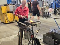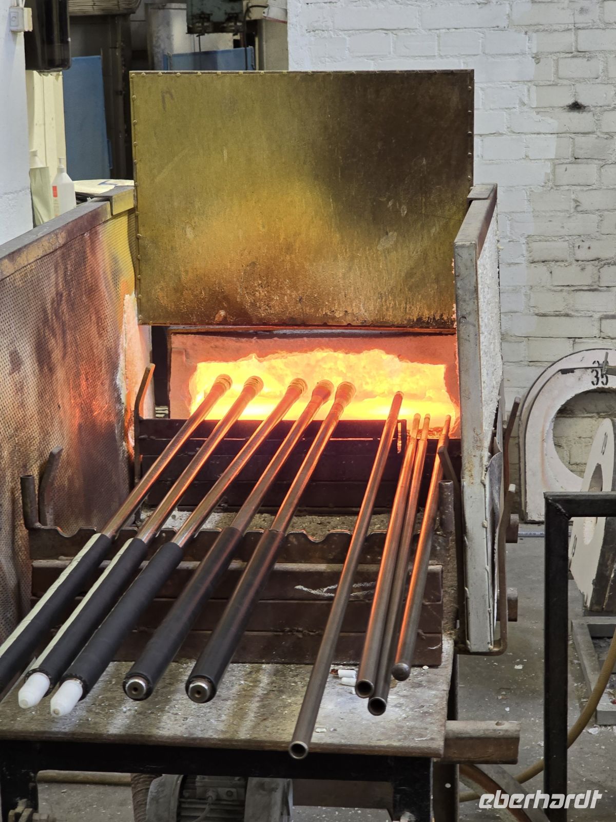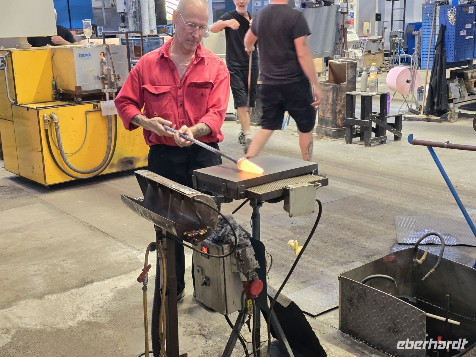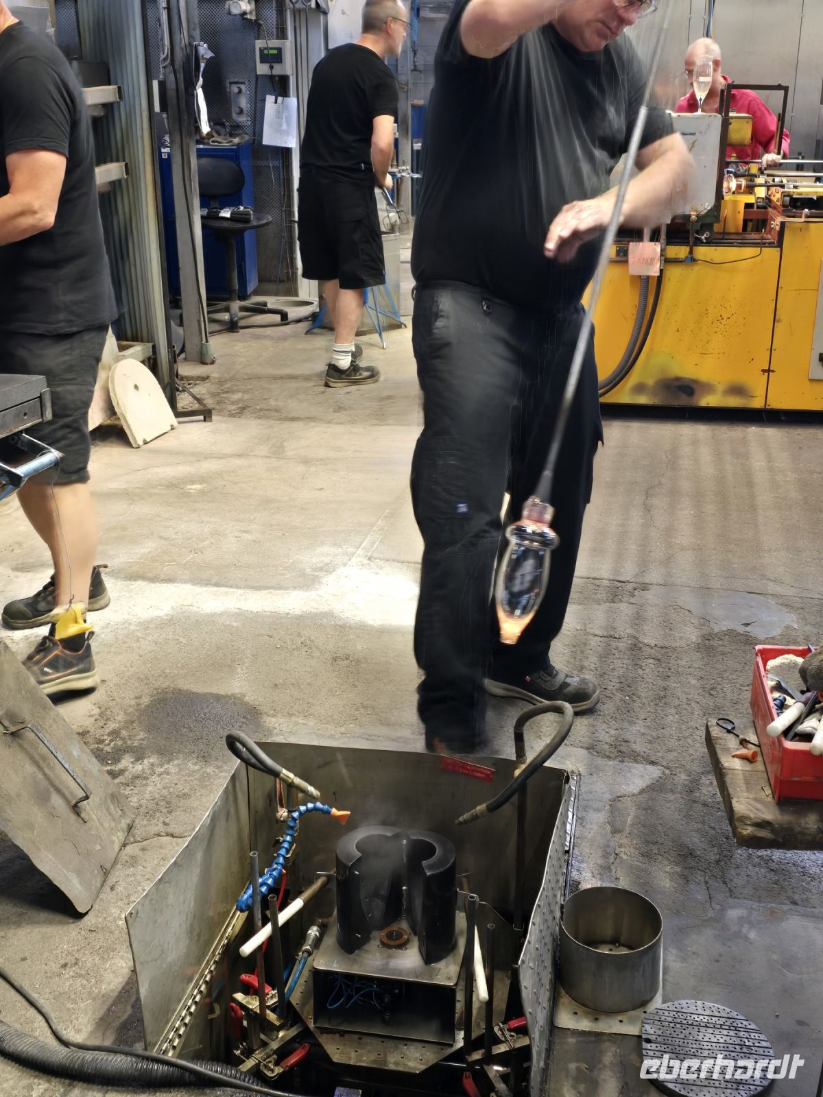 Wir setzen unseren Spaziergang fort schauen uns kurz das Glasmuseum und das Auswandererhaus an, bevor wir durch den Bahnhof in das Gemeindehaus kommen. Diese beiden Häuser ergänzen sich wunderbar und bilden eine richtige Wohlfühlatmosphäre, was man sonst von Bahnhöfen nicht erwarten kann. In der nächsten Straße finden wir aufgereiht mehrere Kunstwerke die das Thema Glas gemeinsam haben. Ja wir sind ja auch in der Glashauptstadt von Smàland. Nach einer starken Stunde kehren wir zum Bus zurück und besuchen eine Glashütte die schon im 18. Jahrhundert gegründet wurde. Hier herrscht eine rege Produktivität, jeweils 3 bis 5 Glaskünstler arbeiten zusammen, Hand in Hand an gemeinsamen Glaskunstwerken. Jeder weiß was der nächste Handgriff ist und welche Glasteile zusammengefügt werden, oder wann der Kollege Hilfe , eine dritte Hand, bei seinem Arbeitsschritt benötigt. Alles läuft ohne Worte, jeder weiß wie die Abläufe sind und ist genau zur richtigen Zeit bereit zu helfen. Es ist fantastisch diesen Glaskünstlern bei der Arbeit zuzuschauen.
