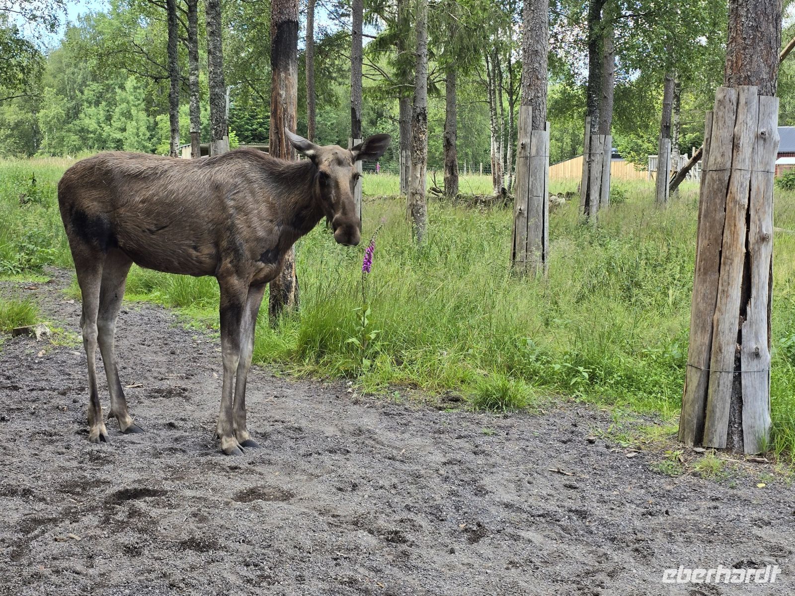 Nach weniger als 30 min Busfahrt kommen wir am Elchpark an. Wir werden schon von den Betreibern Patrik und Gill erwartet, die beiden leben mit und für ihre Tiere, was wir auch gleich beim Rundgang mit Patrik spüren können. Er hat zu jedem seiner Elche ein inniges Verhältnis. Hans hat er als Baby mit der Flasche selbst großgezogen, da die Elchmama ihn nicht angenommen hatte. Die beiden sind seither ein vertrautes Team. Dass der Playboy Hans manchmal, im Spiel mit Patrik, seine körperliche Kraft zu sehr einsetzt und Patrik weichen muss, liegt an seinem jugendlichen Alter. Auch wenn es grundsätzlich nötig ist, seine Elche im Ringtausch mit anderen Parks weiter zu geben, Hans würde er nie weggeben wollen.