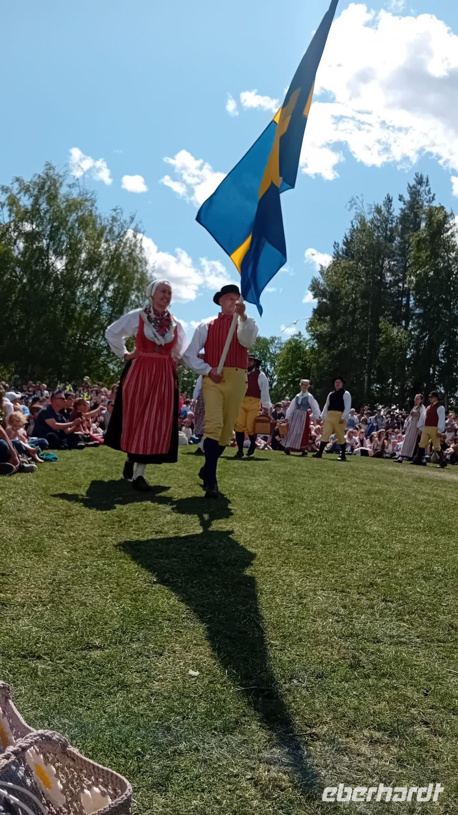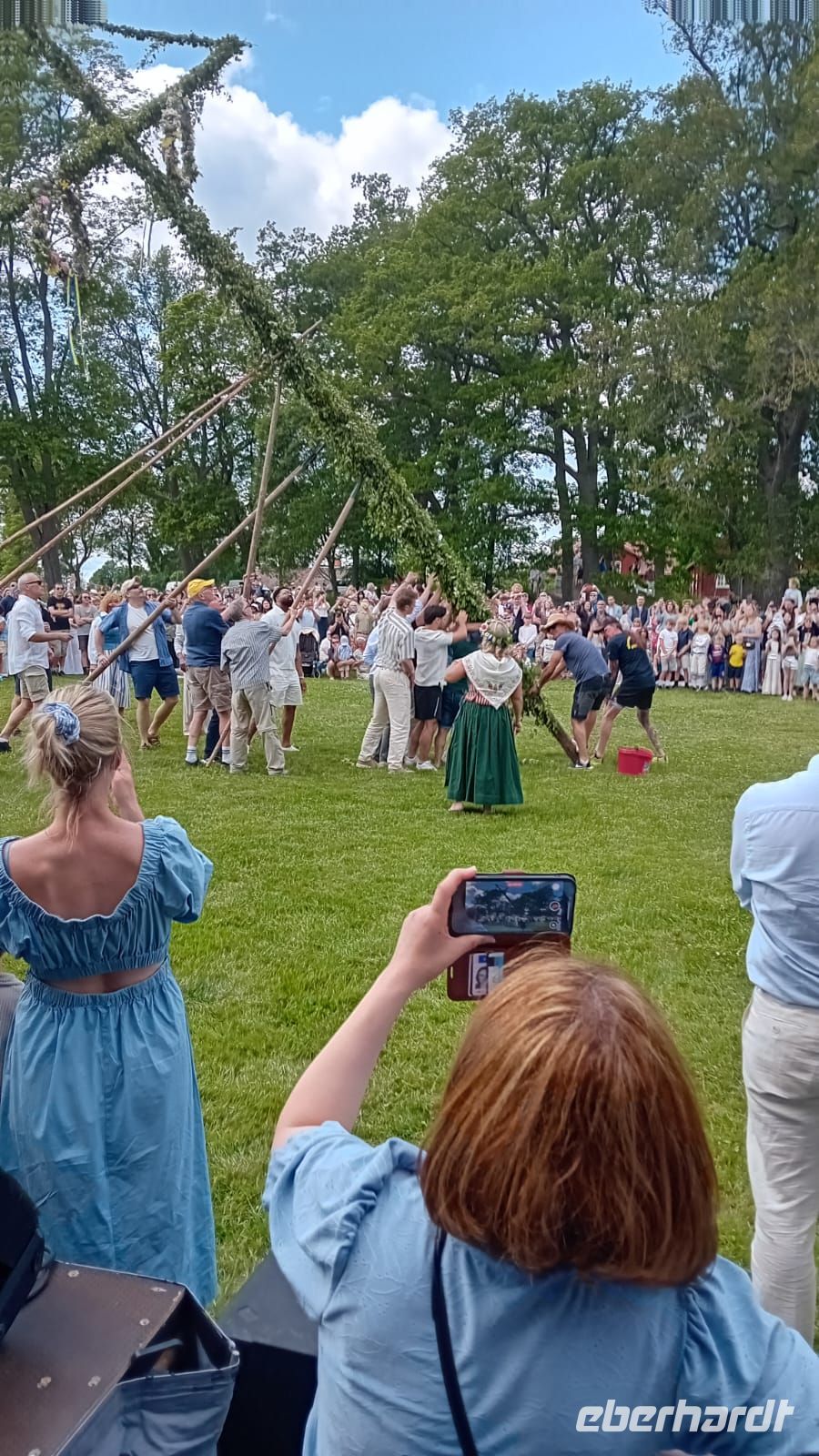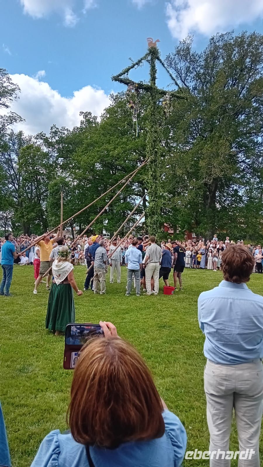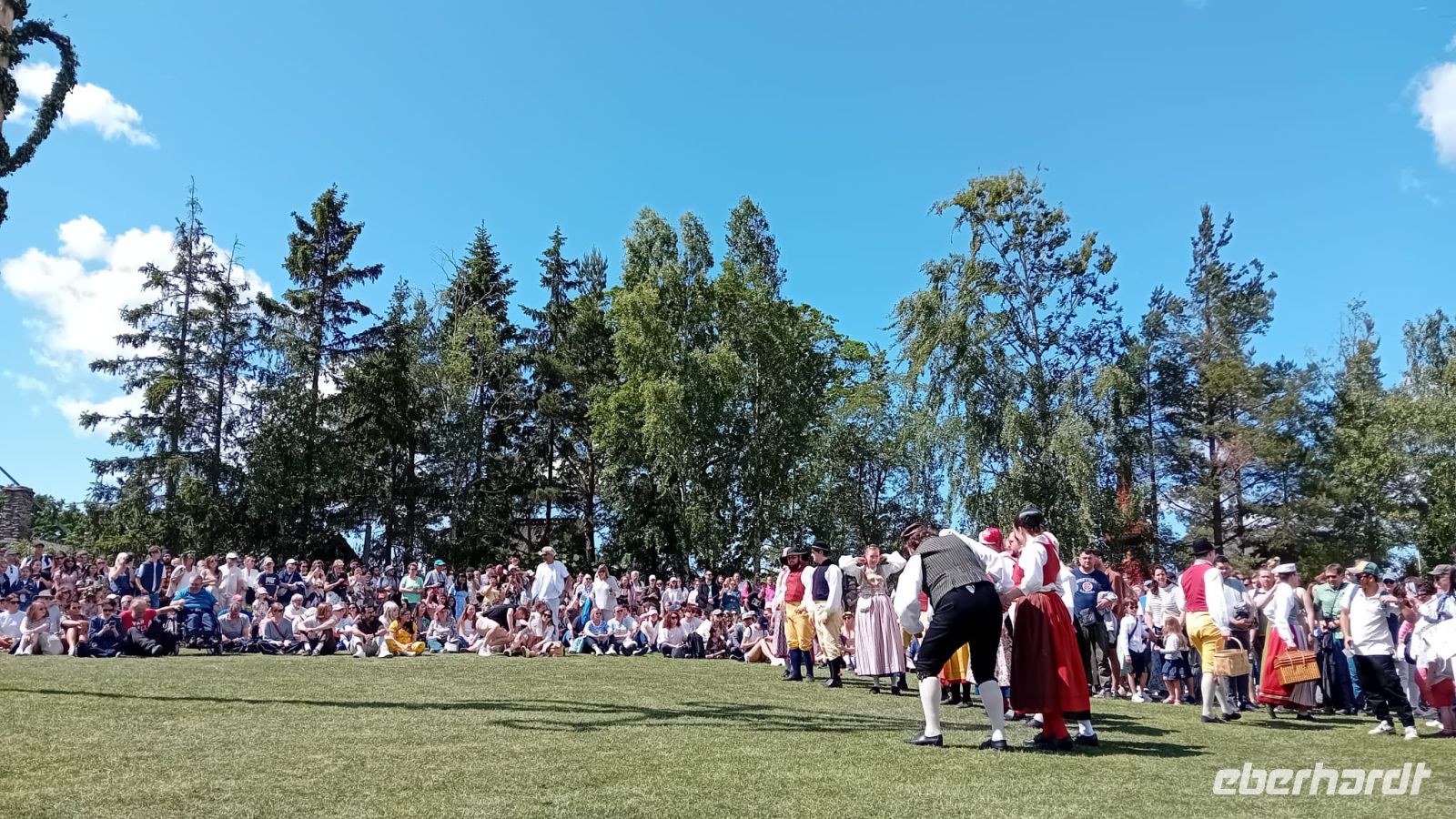 Währenddessen lag die Wiese vor dem Schloss in lebendigem Treiben: Die Vorbereitungen für das Mittsommerfest waren in vollem Gange. Familien breiteten ihre Picknickkörbe aus, Kinder rannten lachend umher, und die Luft war erfüllt von Vorfreude und dem Duft frischer Blumen. Gegen 14 Uhr versammelte sich eine Trachtengruppe, um den Mittsommerpfahl feierlich aufzustellen – ein farbenfrohes Spektakel voller Tradition und Lebensfreude.