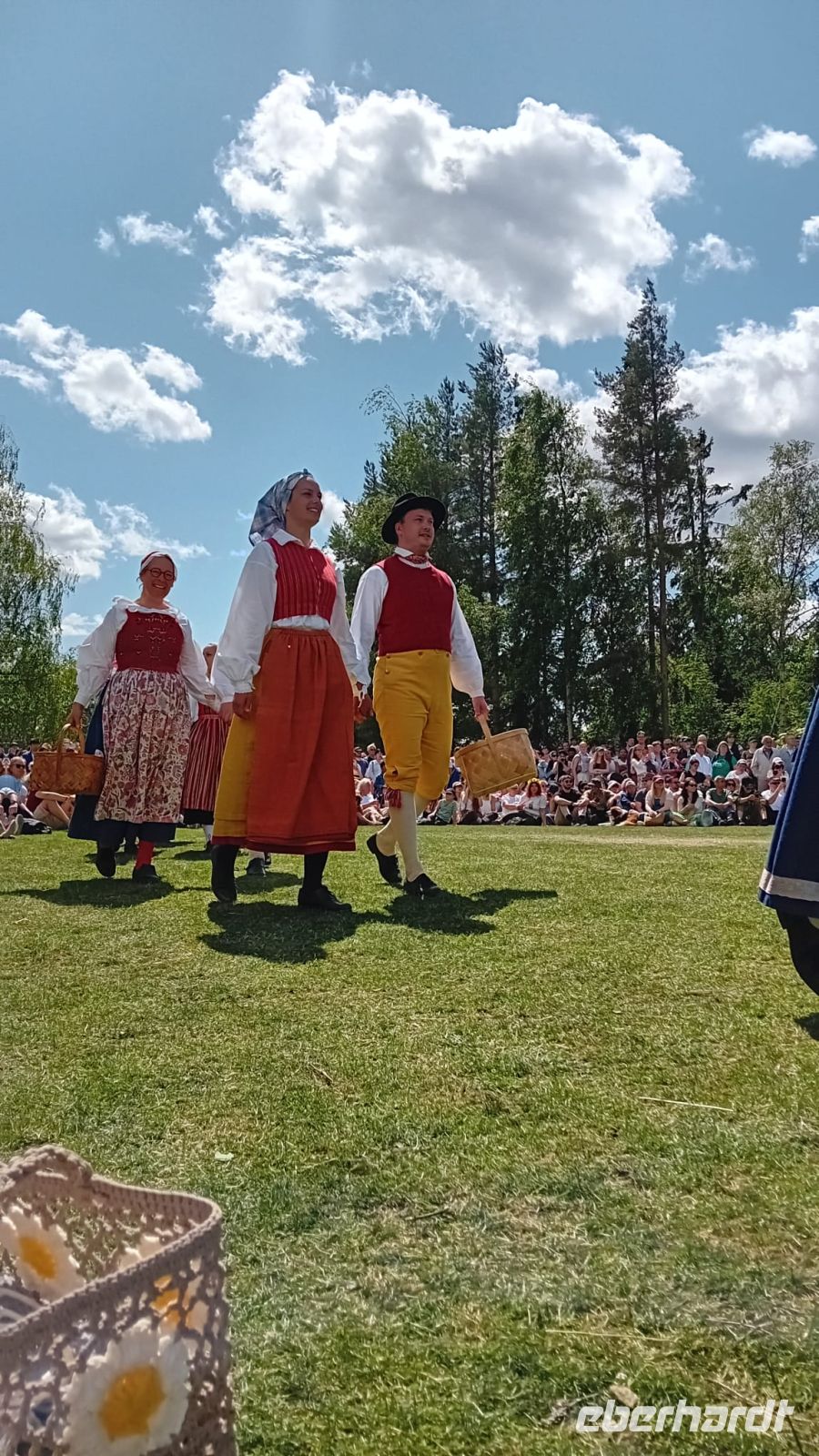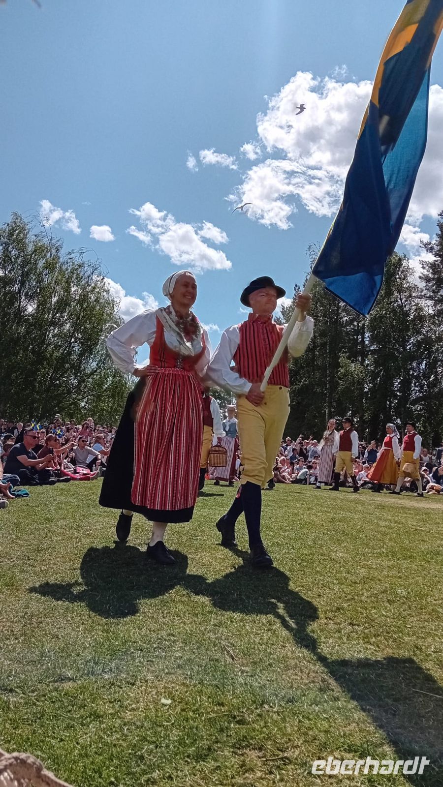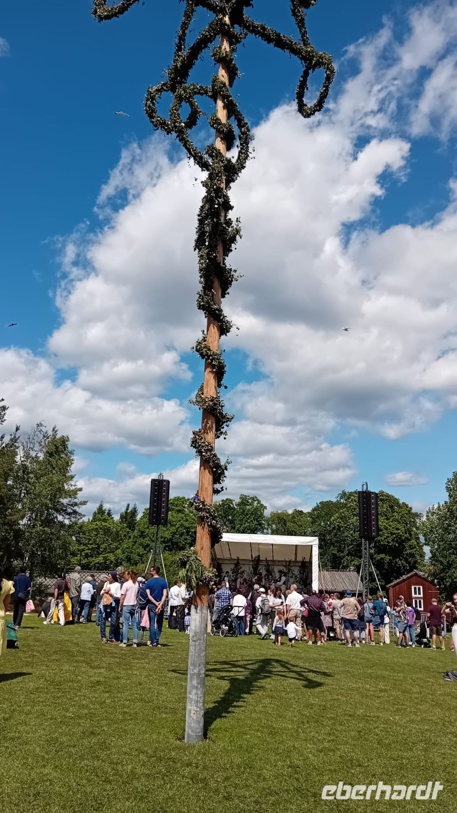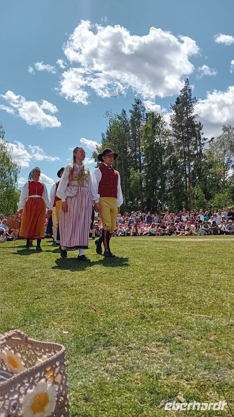 Währenddessen lag die Wiese vor dem Schloss in lebendigem Treiben: Die Vorbereitungen für das Mittsommerfest waren in vollem Gange. Familien breiteten ihre Picknickkörbe aus, Kinder rannten lachend umher, und die Luft war erfüllt von Vorfreude und dem Duft frischer Blumen. Gegen 14 Uhr versammelte sich eine Trachtengruppe, um den Mittsommerpfahl feierlich aufzustellen – ein farbenfrohes Spektakel voller Tradition und Lebensfreude.