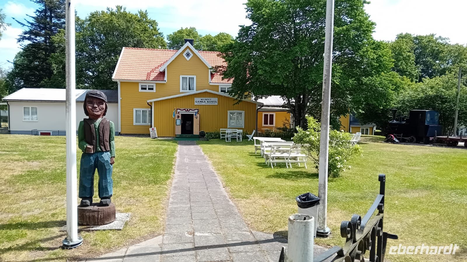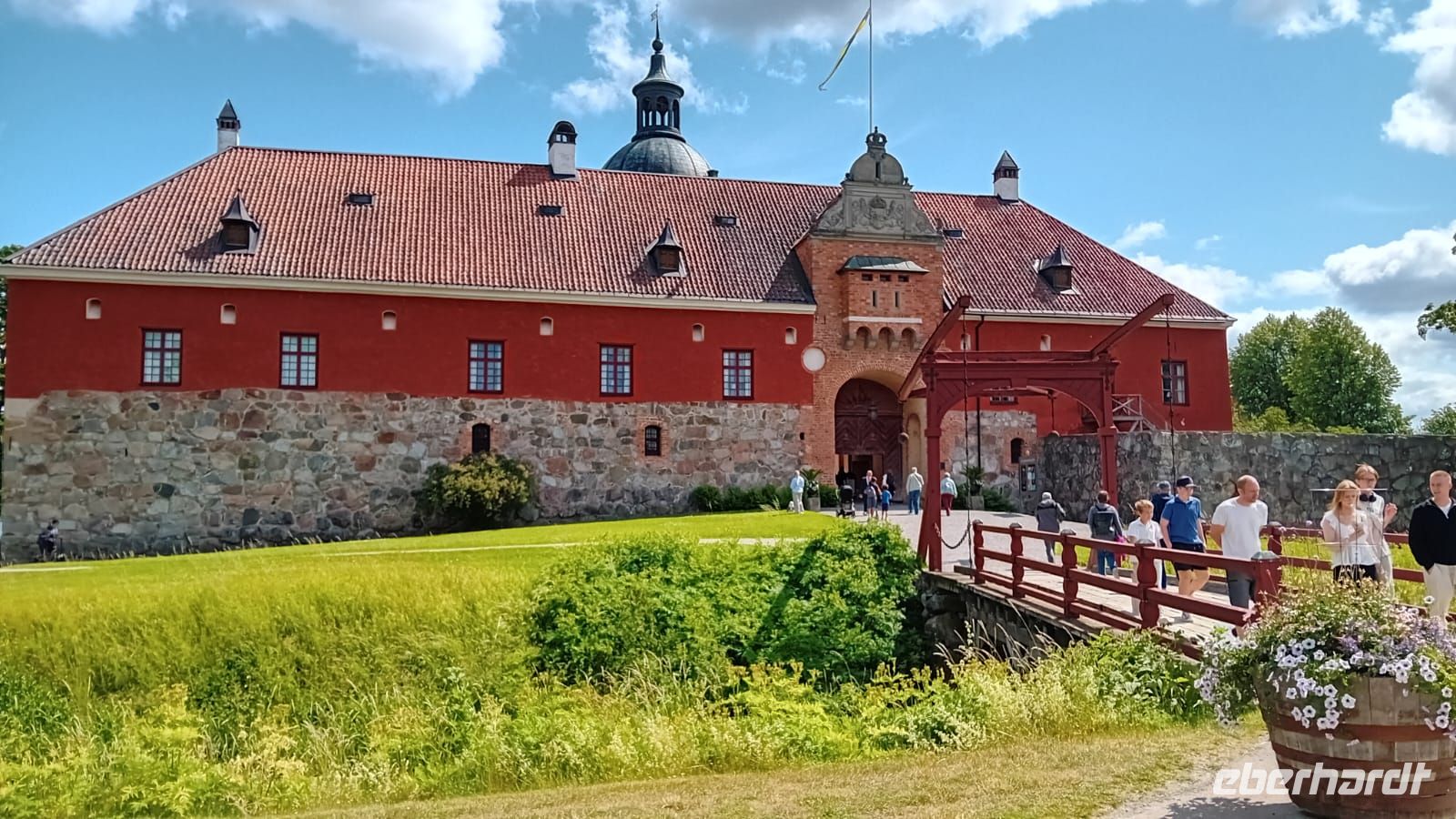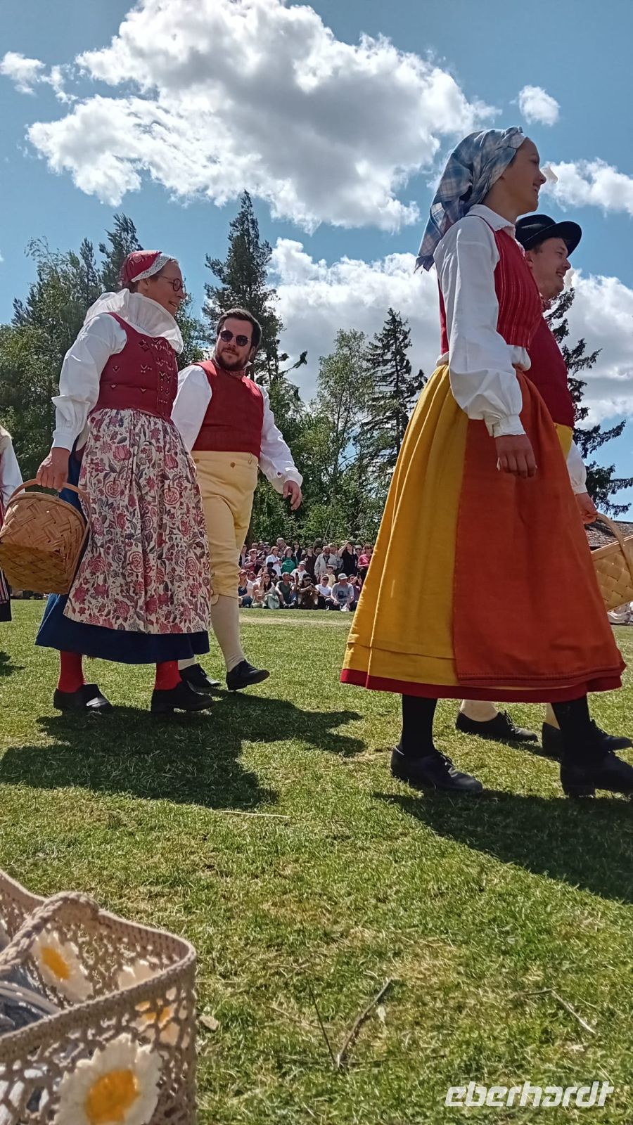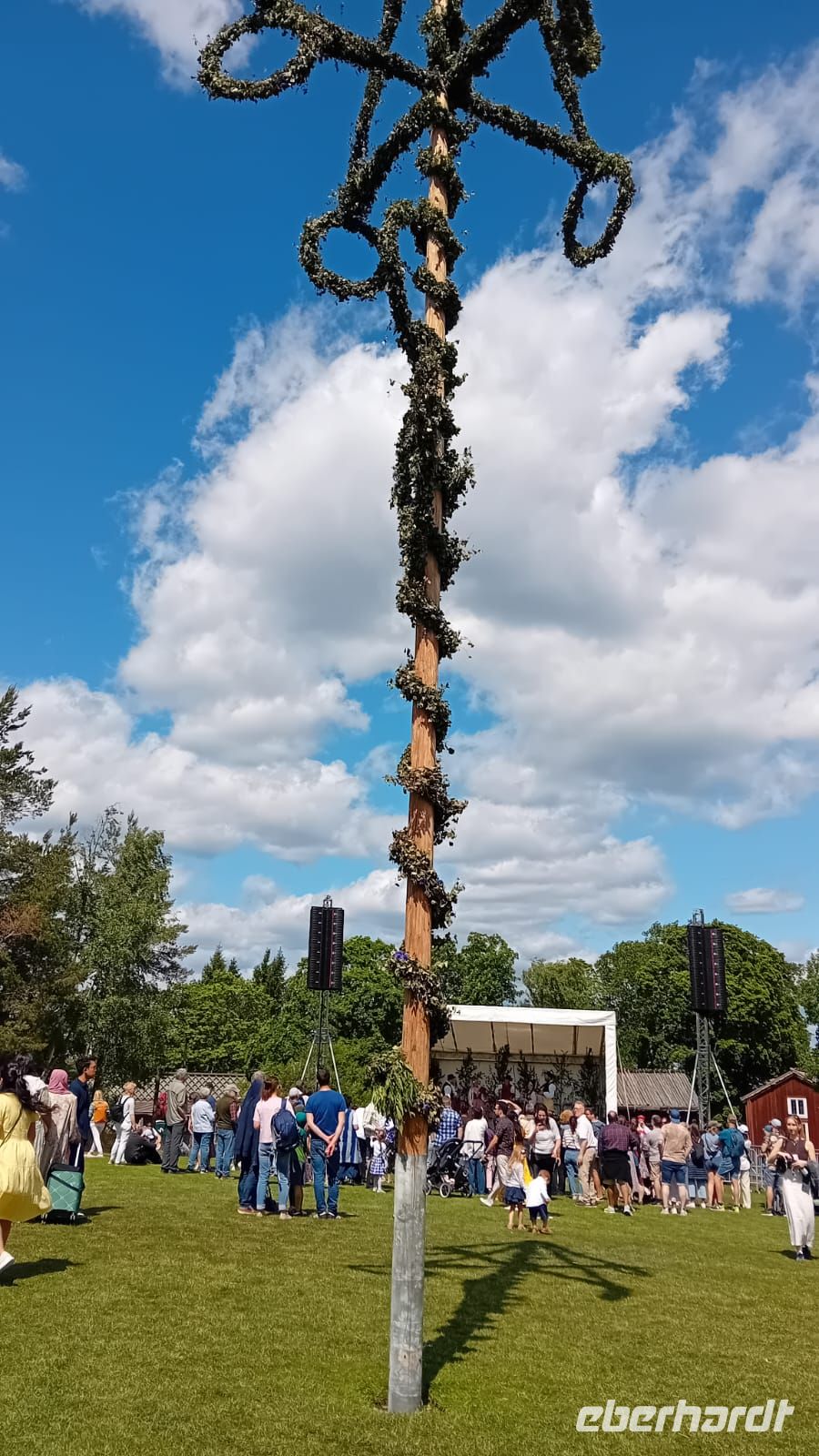 Währenddessen lag die Wiese vor dem Schloss in lebendigem Treiben: Die Vorbereitungen für das Mittsommerfest waren in vollem Gange. Familien breiteten ihre Picknickkörbe aus, Kinder rannten lachend umher, und die Luft war erfüllt von Vorfreude und dem Duft frischer Blumen. Gegen 14 Uhr versammelte sich eine Trachtengruppe, um den Mittsommerpfahl feierlich aufzustellen – ein farbenfrohes Spektakel voller Tradition und Lebensfreude.