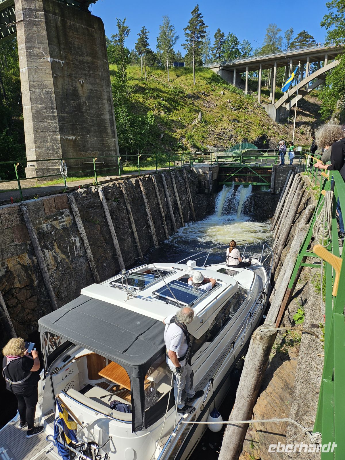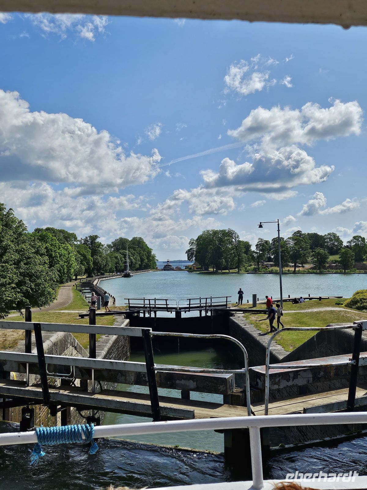 Heute hieß es: Wasserstraße statt Straße! Nach dem Kofferladen machten wir uns auf den Weg zu einem weiteren Highlight unserer Reise: der Götakanal, Schwedens historischer Wasserweg. Um 9 Uhr erreichten wir die berühmten Schleusen in Berg, wo wir etwas Zeit hatten, den Schleusenbetrieb zu beobachten – ein faszinierendes Schauspiel aus Wasser, Technik und Ruhe.