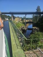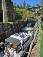 Oben von der Aussichtsplattform konnten wir die historische Schleusenanlage mit der Trogbrücke bestaunen – ein technisches Meisterwerk aus dem 19. Jahrhundert, bei dem ein schmaler Kanal unter einer Eisenbahnlinie geführt wird. Für alle gut zu Fuß war auch der Weg hinunter ans Wasser lohnend – dort konnten wir sogar beobachten, wie ein Boot langsam durch die Schleuse manövrierte.