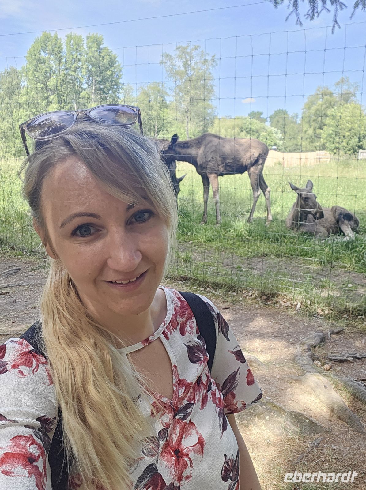 Danach ging’s weiter zum Elchpark, wo ich im Vorfeld bereits unsere frühere Ankunft angekündigt hatte. Und tatsächlich – der Besitzer war bestens vorbereitet und ermöglichte uns eine private Elchfütterung! Ganz nah kamen wir an eine liebevoll benannte Elchfamilie heran, erfuhren alles über ihre Lebensweise, Charaktere und Eigenheiten. Anschließend konnten alle individuell die Runde durch den Park drehen – je nach Kondition eine komplette oder verkürzte Strecke.