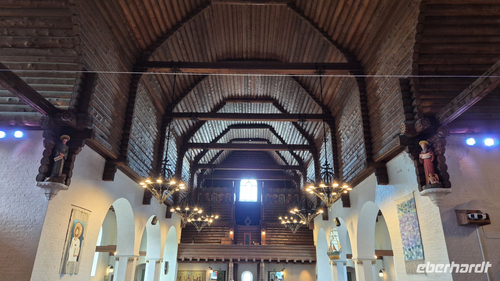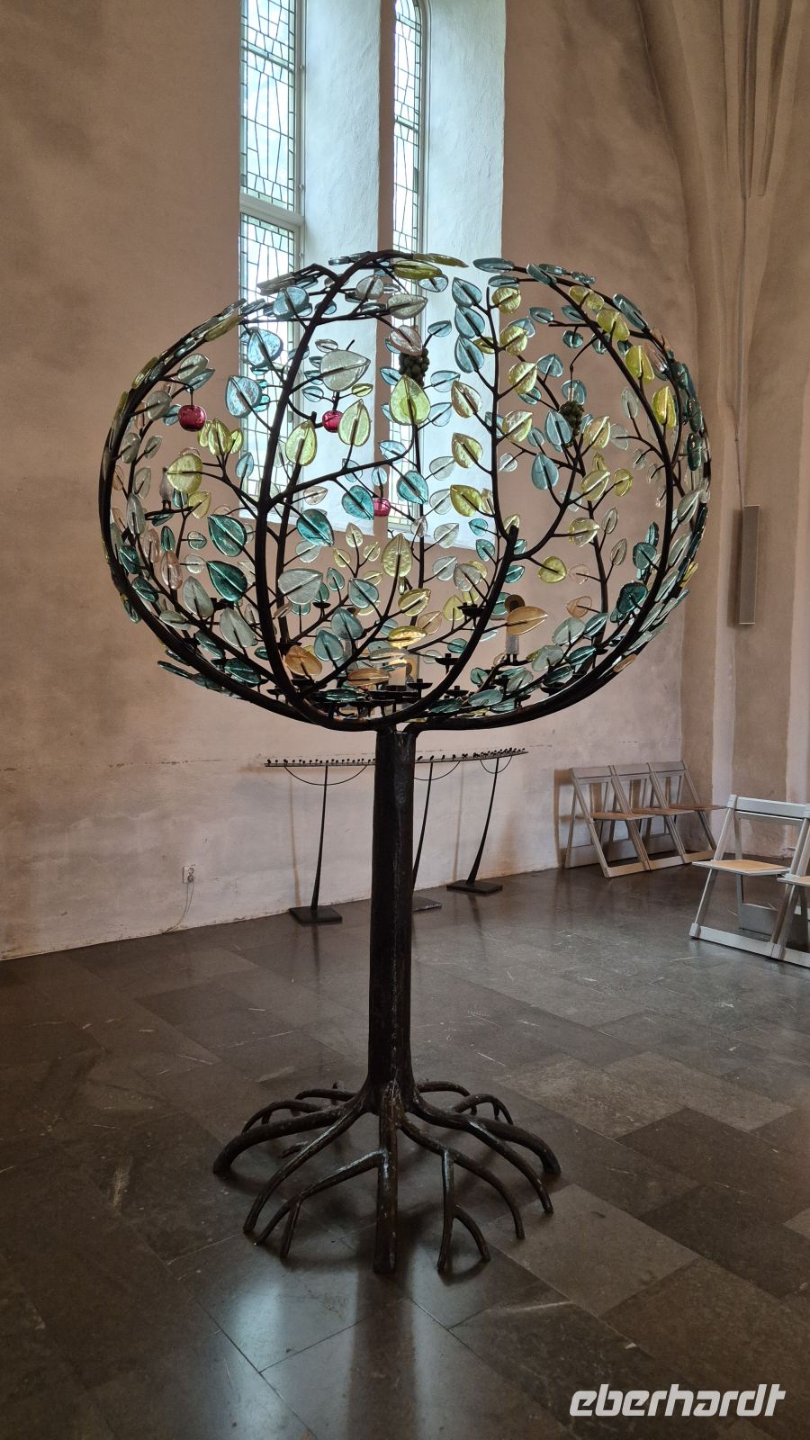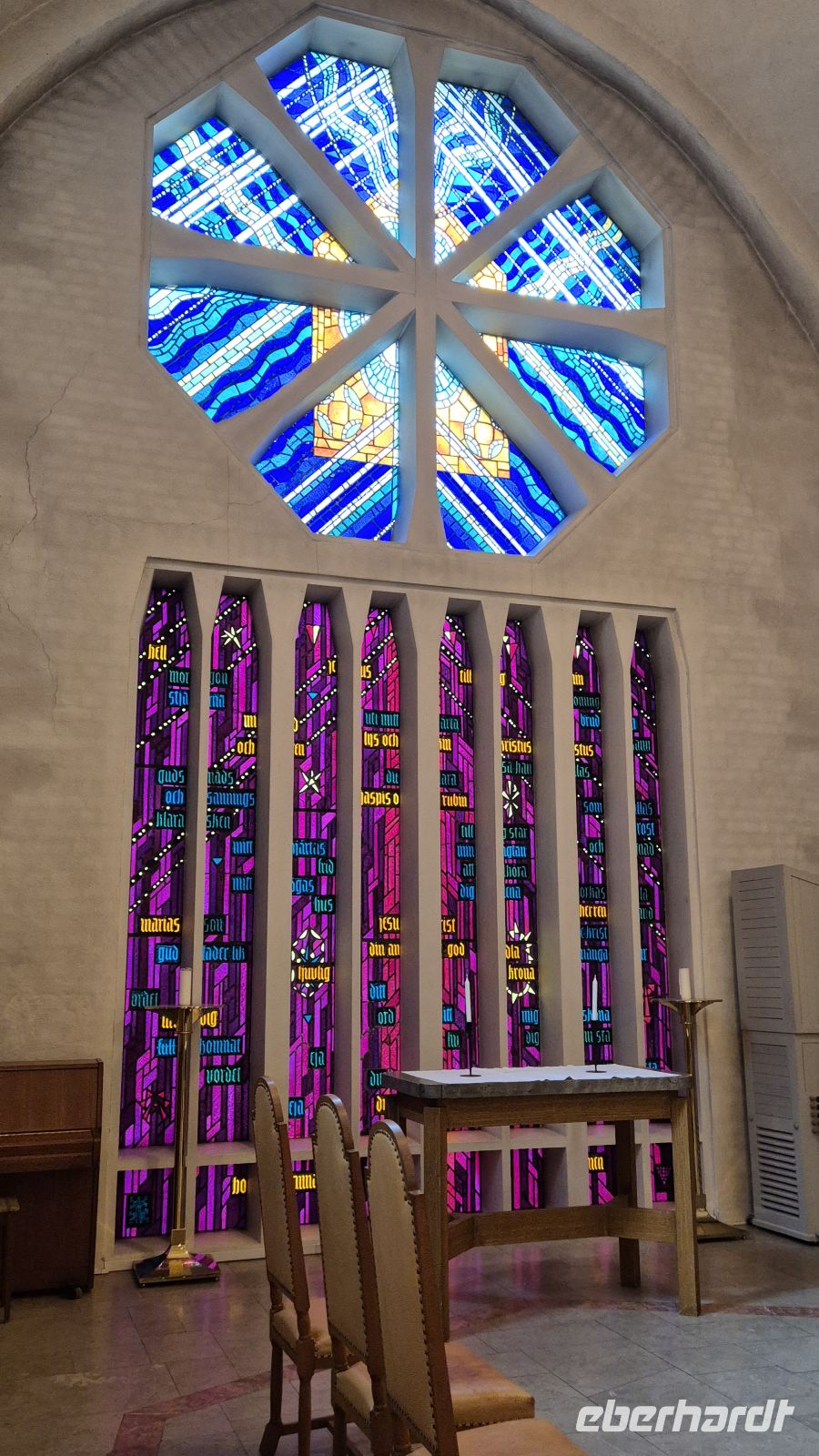 Am nächsten Morgen unternehmen wir als erstes einen kleinen Spaziergang durch die Innenstadt von Växjö: das Ziel ist die Domkirche. Sie soll an dem Ort stehen, an dem der heilige Siegfried, ein angelsächsischer Missionar, im 11. Jahrhundert begraben worden ist. Seit dem frühen Mittelalter ist die Kirche zahlreiche Male erneuert, zerstört und neuaufgebaut worden, dennoch finden sich Reste mittelalterlicher Malereien in einer der Seitenkapellen. Uns interessiert jedoch vor allem die moderne Ausstattung, allem voran der moderne Glasaltar von Bertil Vallien aus dem Jahr 2002.