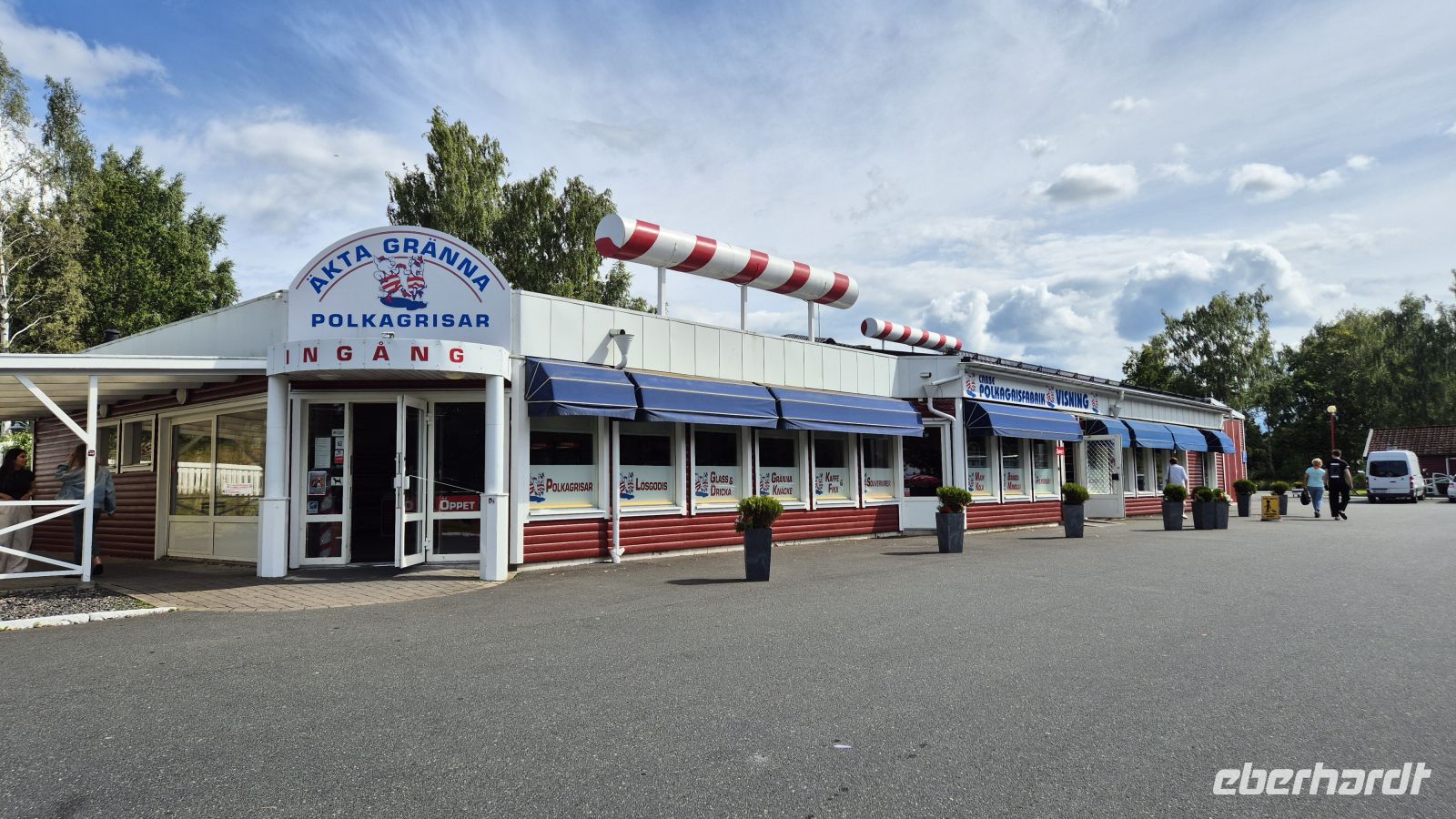 Am Nachmittag treten wir dann unsere Weiterfahrt in Richtung Südwesten an. Unser Ziel für heute ist die wohl bekannteste Schwedische Landschaft: Småland. Erst einmal erreichen wir jedoch das nordöstliche Ende des Vättern, dem zweitgrößten Sees Schwedens. Er macht mit seinen 135 Kilometern Länge und 31 Kilometern Breite je nach Wetterlage fast den Eindruck als wäre man an der Küste, heute ist die Sicht allerdings so gut, dass wir bis an das nördliche Ufer schauen können. Leider verzögert sich unsere Weiterfahrt aufgrund eines Baustellenstaus erheblich, sodass wir nur einen kurzen Stopp in der Nähe von Gränna einlegen können. Die Kleinstadt ist für ihre Süßwaren, insbesondere Bonbons und Zuckerstangen, bekannt. Es gibt zahlreiche Kochereien, die die kleinen Polkagriser herstellen. Auch wir haben die Gelegenheit noch ein paar süße Souvenirs einzukaufen.