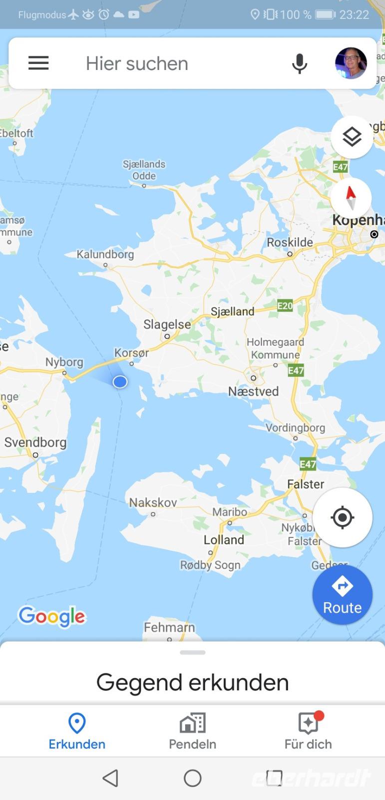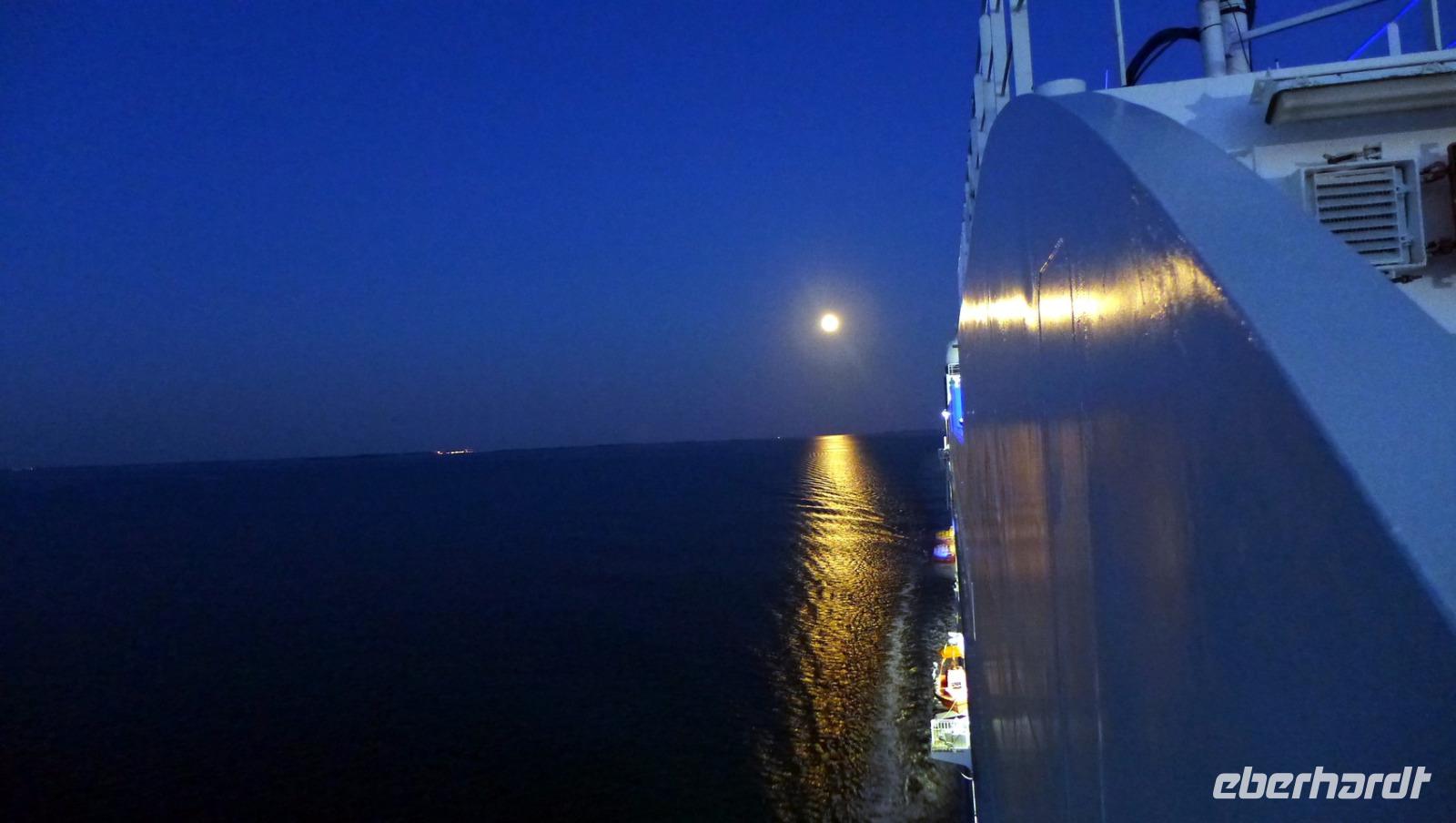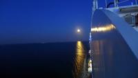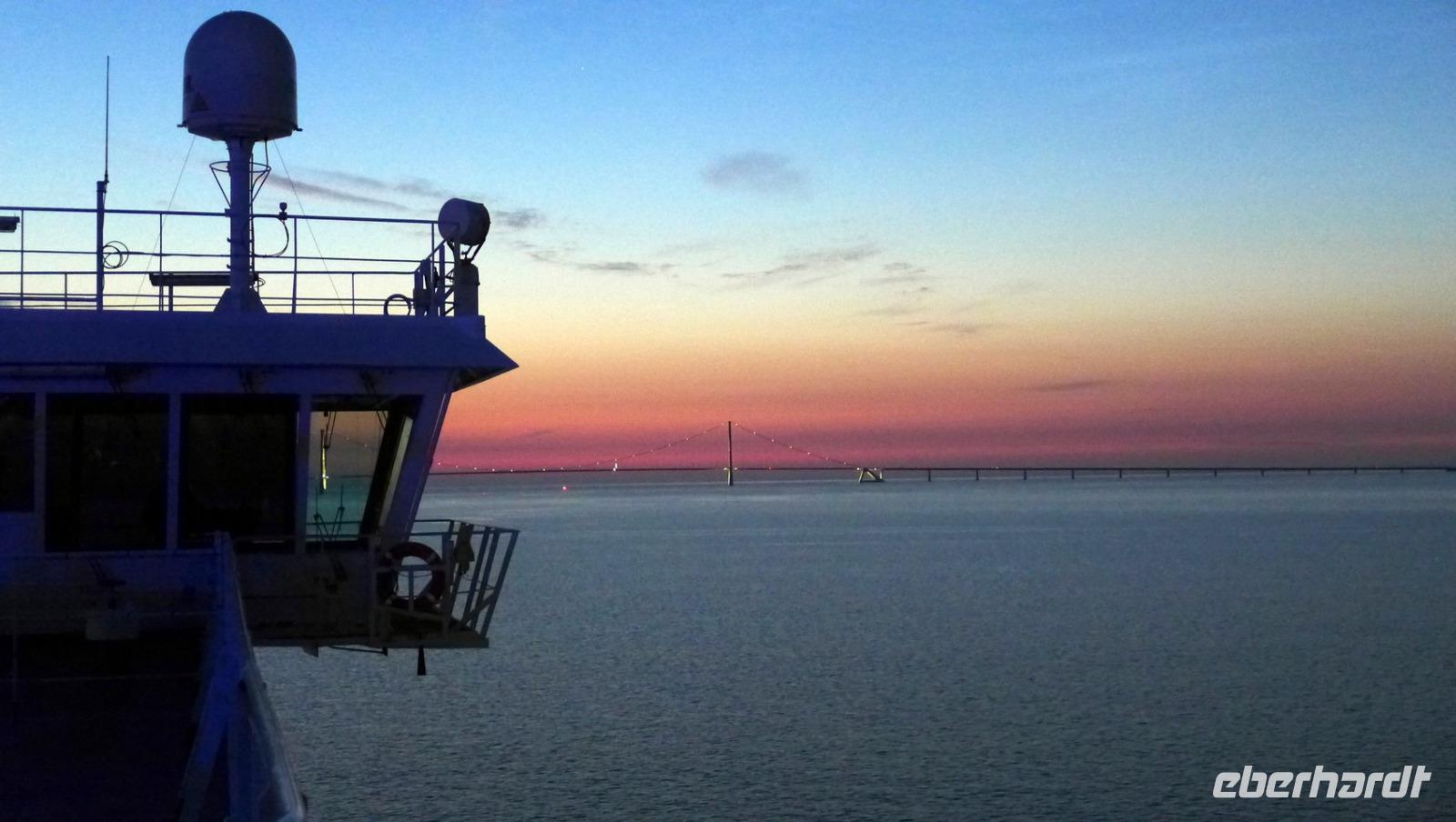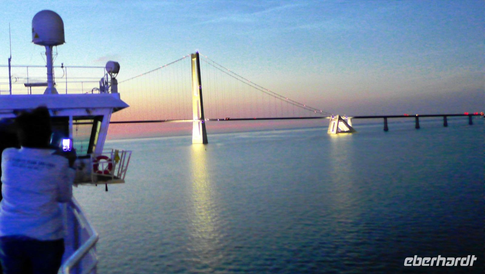 Kurz vor Mitternacht, genau um 23:30 Uhr, wird es noch einmal interessant, denn wir nähern uns der „Großer Belt - Brücke", der drittlängsten Hängebrücke weltweit (gemäß der Länge ihrer Mittelspannweite, also der Entfernung zwischen den Pylonen). Mit mir wollten sich aber nur sechs Gruppenmitglieder die Durchfahrt unter der „Storebæltsbroen" bei Vollmond nicht entgehen lassen.