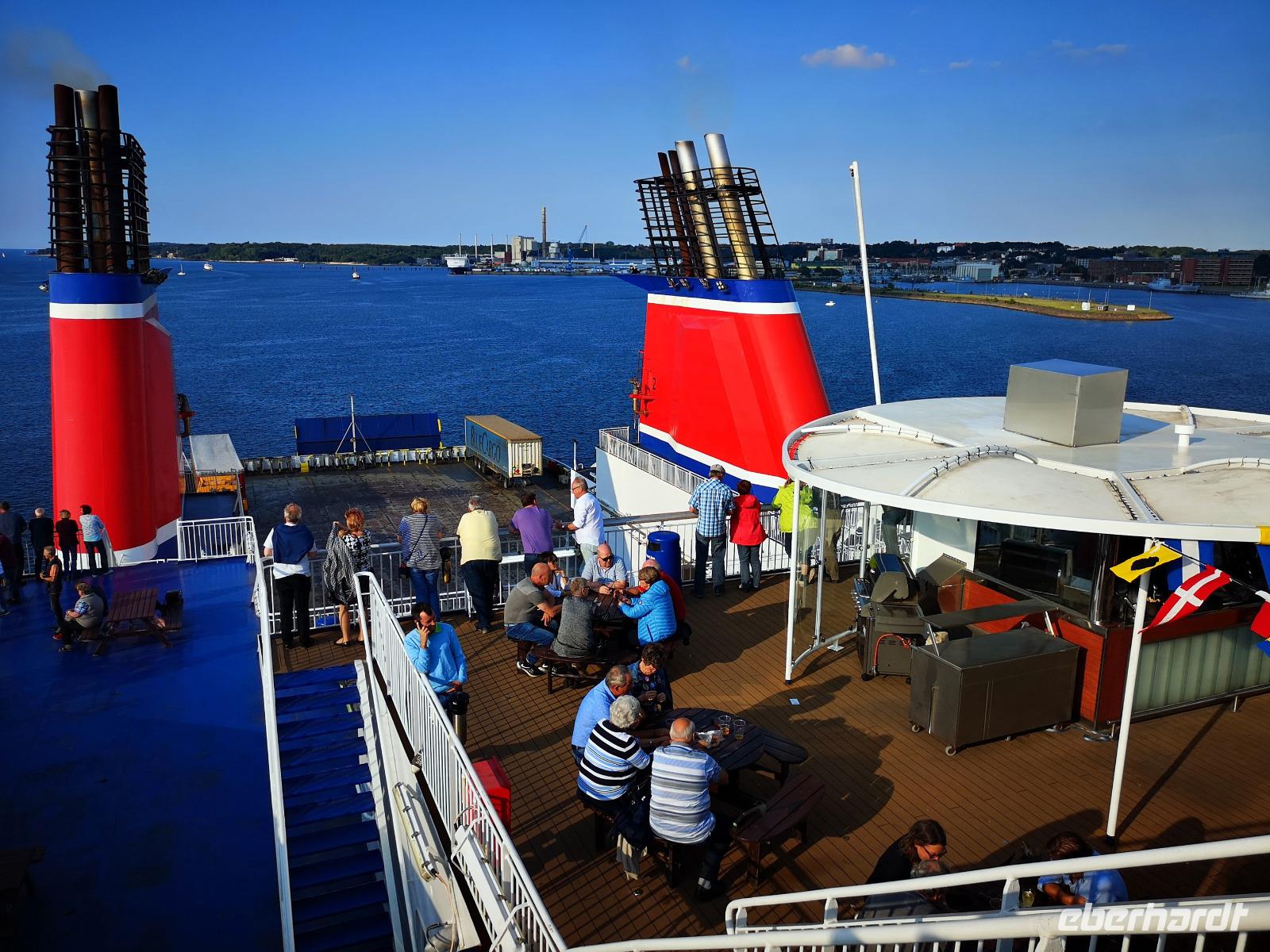 Der Bus startet um 6:00 Uhr in Kesselsdorf bei Dresden. Der Verfasser dieses Berichts steigt mit dem Großteil der Gruppe um 8;30 am Flughafen Leipzig zu. Wir haben eine angenehme Fahrt nach Kiel, die durch zwei längere Pausen unterbrochen, bzw. aufgelockert wird: jeweils gut halbstündige Stops an den Raststätten „Groß Kreutz" an der Havel und „Gudow Nord" (ziemlich genau zwischen Hamburg und Schwerin nördlich des Mecklenburgischen Elbetals gelegen) bieten Gelegenheit für einen Snack, und dazu, ein paar Schritte zu gehen; auch lernt man sich gegenseitig bereits etwas kennen. Es ist noch nicht einmal 17:00, als wir uns neben unserem Fährschiff Stena Scandinavica in die Warteschlange einreihen. Martin sammelt von allen Teilnehmern die Personalausweise ein, die wir nur wenige Minuten später zusammen mit unserer Bordkarte wieder bekommen. Wir können nun den Bus verlassen und nach erfolgter Passkontrolle im Terminal an Bord gehen. Wir sind alle recht hungrig und so trifft es sich gut, daß wir uns schon um 18:30 zum Abendessen im Bordrestaurant einfinden können. Das Büffet ist ausgezeichnet und hat meine Erwartungen weit übertroffen. Die „MS Scandinavica" legt um 18:45 Richtung Nord-Ostsee-Kanal ab, und wir passieren dabei Marine-Ehrenmal Laboe.