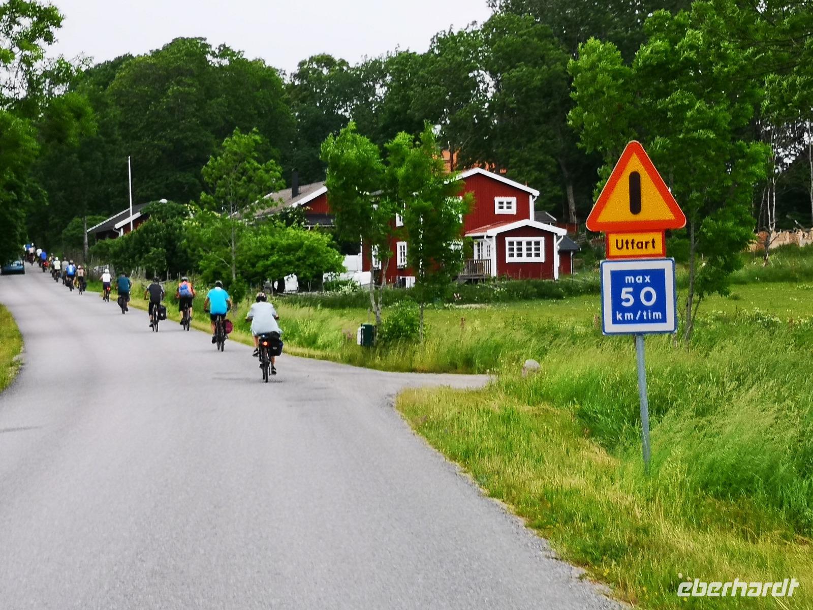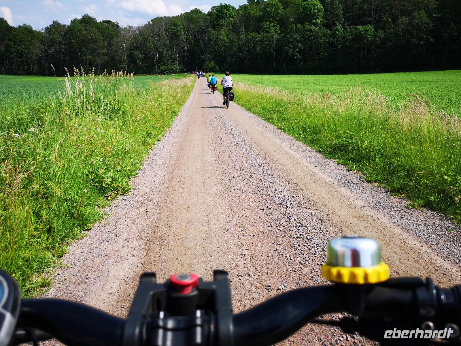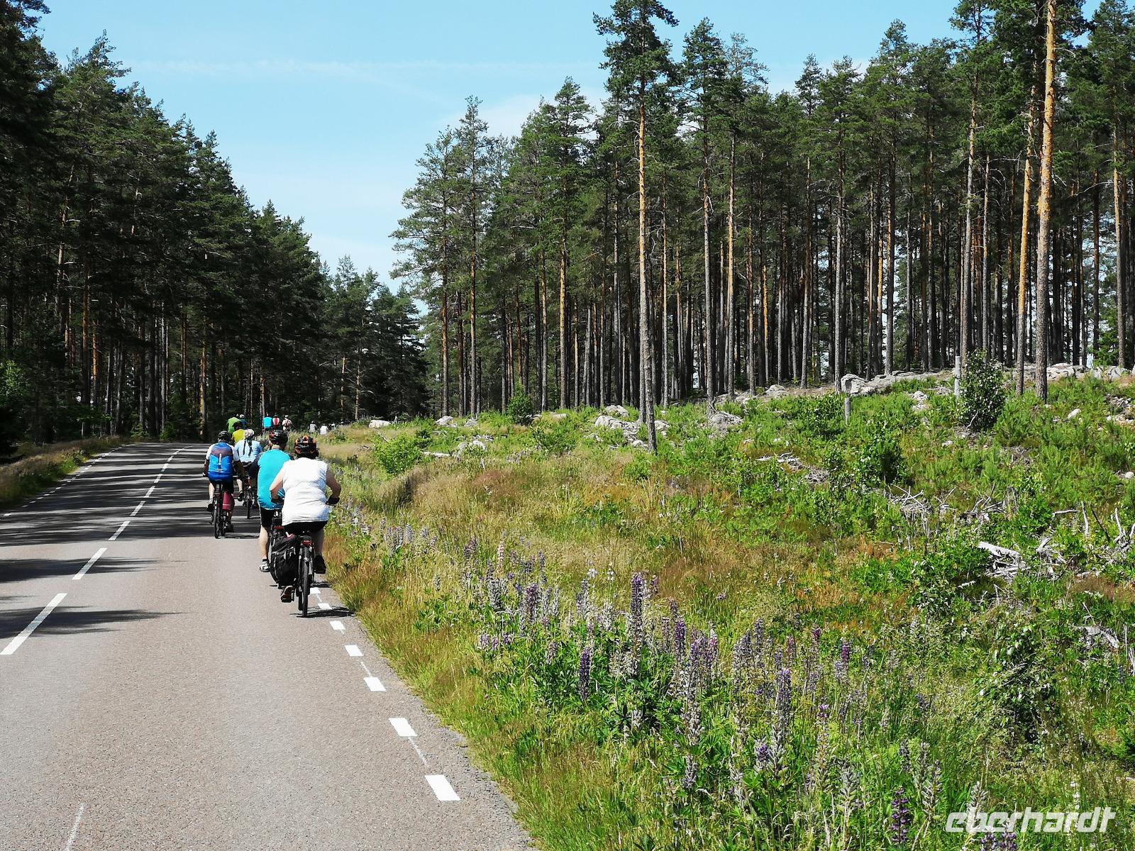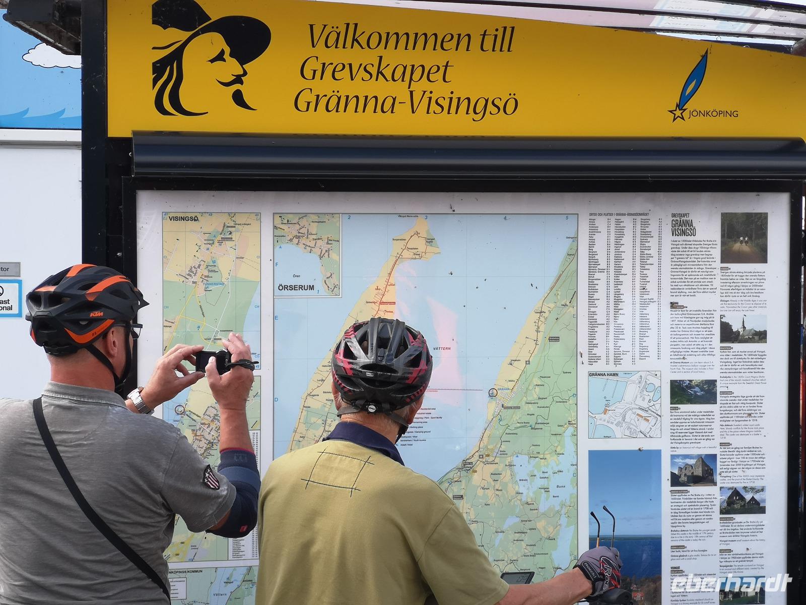 Nach einer ruhigen Fahrt durch den Großen Belt (Dänemark) und das Kattegat erreicht die „Scandinavica" der Stena Lines Göteborg um 9:30 Uhr. Um 10:00 Uhr wartet die versammelte Gruppe außerhalb des Terminals auf den Bus, als es zu regnen beginnt; glücklicherweise nur kurz. Von Göteborg geht es auf den „Riksvägen 40" knapp 200km nach Osten, vorbei an Jönköping nach Gränna. Unser erstes Besuchsziel der Reise ist ein sehr süßes, eine Polkagrisarfabrik. Zuckerstangen, noch immer traditionell handgefertigt sind das berühmteste Produkt des Ortes. Die Zuckerstangen, sowie zahlreiche weitere Leckereien sind nicht nur in Schweden beliebt, sondern werden weltweit exportiert. Abgesehen hiervon ist der Ort Gränna auch ein pittoreskes Fleckchen, aber die Zeit zum Bummeln ist knapp - wir wollen zu unserer ersten Radtour starten! Mit den Rädern geht's rauf auf die Fähre, und wir setzen wir über auf die ca. 6km entfernte Insel Visingsö, der mit 25 km² die größte Insel im schwedischen Vätternsee. Die Überfahrt dauert eine knappe halbe Stunde.