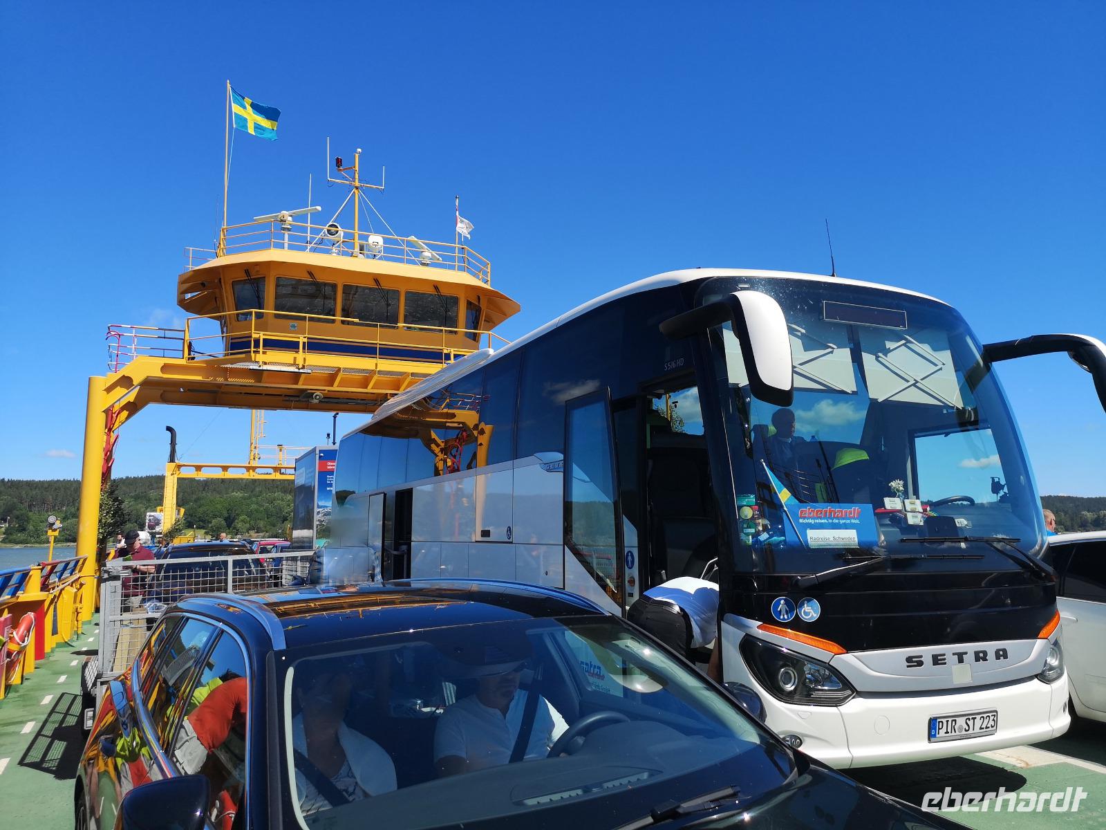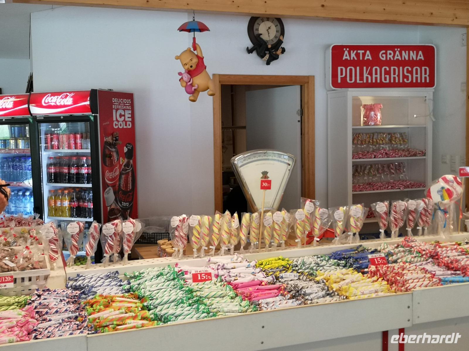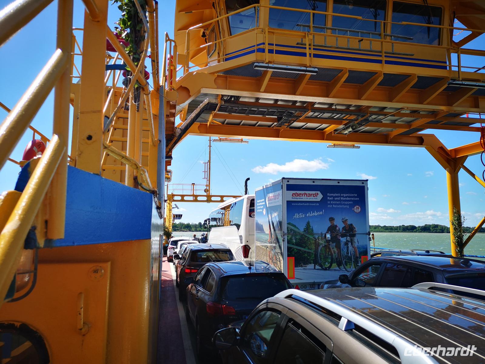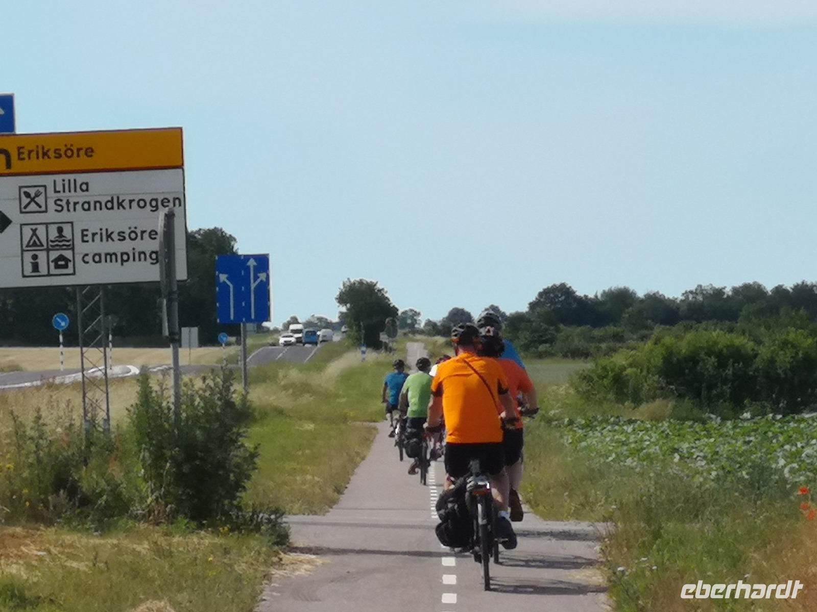 Nach einer ruhigen Fahrt durch den Großen Belt (Dänemark) und das Kattegat erreicht die „Scandinavica" der Stena Lines Göteborg um 9:30 Uhr. Um 10:00 Uhr wartet die versammelte Gruppe außerhalb des Terminals auf den Bus, als es zu regnen beginnt; glücklicherweise nur kurz. Von Göteborg geht es auf den „Riksvägen 40" knapp 200km nach Osten, vorbei an Jönköping nach Gränna. Unser erstes Besuchsziel der Reise ist ein sehr süßes, eine Polkagrisarfabrik. Zuckerstangen, noch immer traditionell handgefertigt sind das berühmteste Produkt des Ortes. Die Zuckerstangen, sowie zahlreiche weitere Leckereien sind nicht nur in Schweden beliebt, sondern werden weltweit exportiert. Abgesehen hiervon ist der Ort Gränna auch ein pittoreskes Fleckchen, aber die Zeit zum Bummeln ist knapp - wir wollen zu unserer ersten Radtour starten! Mit den Rädern geht's rauf auf die Fähre, und wir setzen wir über auf die ca. 6km entfernte Insel Visingsö, der mit 25 km² die größte Insel im schwedischen Vätternsee. Die Überfahrt dauert eine knappe halbe Stunde.