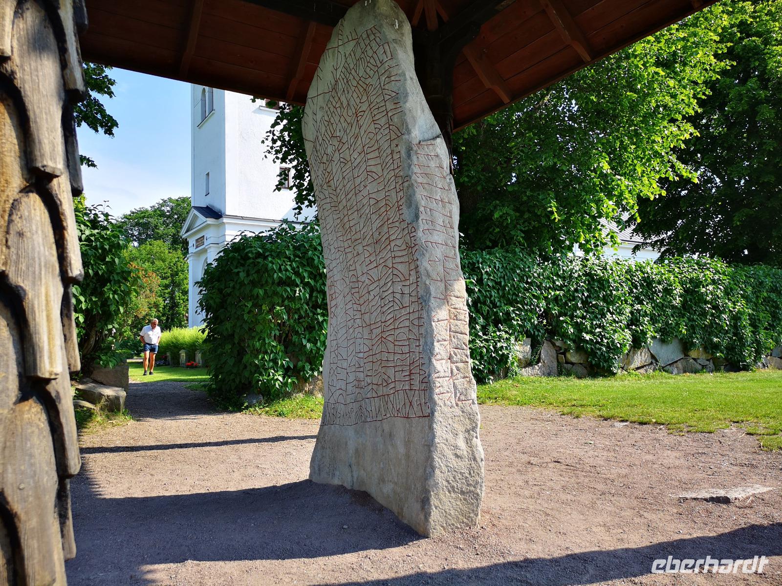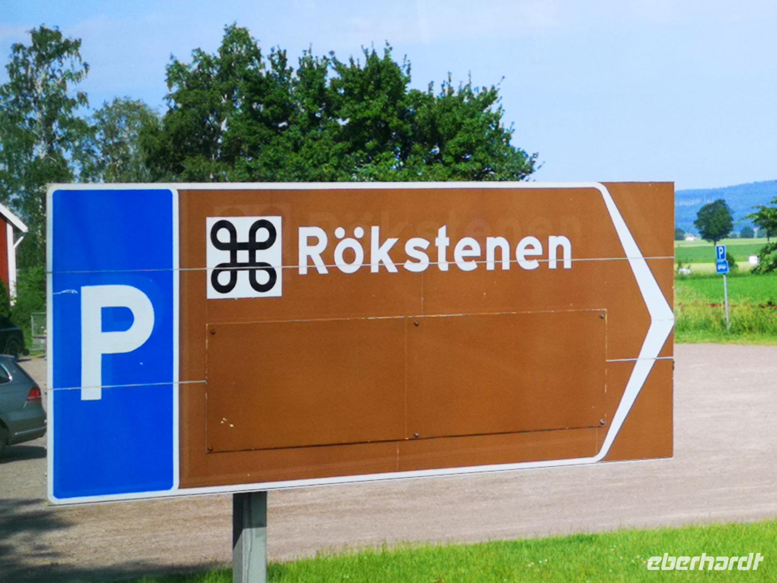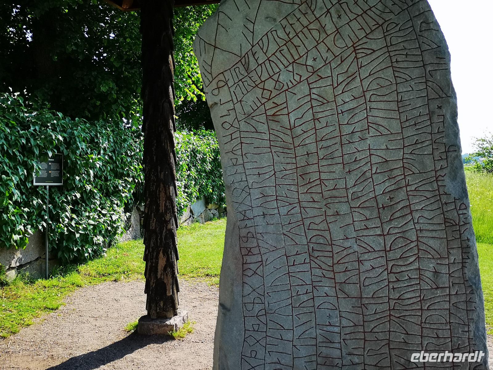 Der heutige Ausflugstag beinhaltet mehrere interessante Stopps plus Radetappe, weshalb wir schon um 8:30 Uhr starten. Von unserem Standort Linköping fahren wir ca. 60km Richtung Westen. Der Runenstein von Rök („Rökstenen") liegt ca. 20km nördlich von Gränna, wo wir gestern waren, ebenfalls am Vätternsee. Mit fast 4m Höhe ist der Runenstein der größte in Schweden; auf ihm findet man rund 750 Zeichen - die längste bekannte Runenschrift.